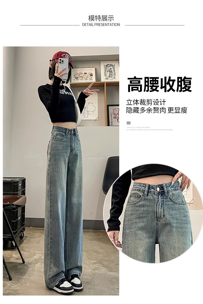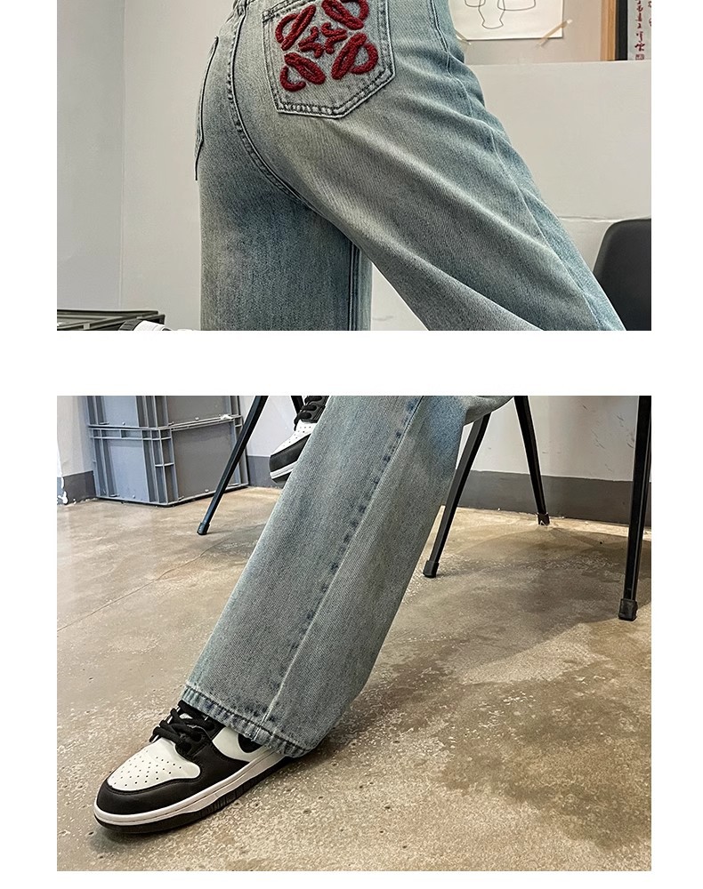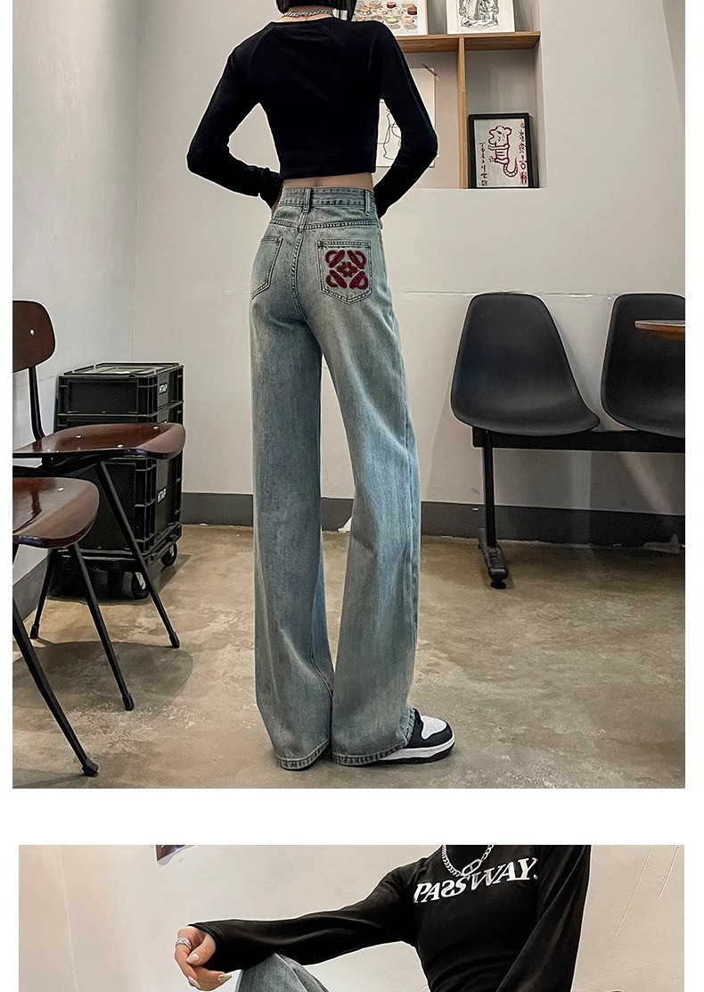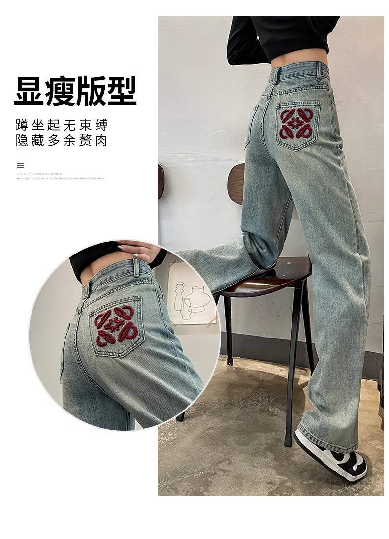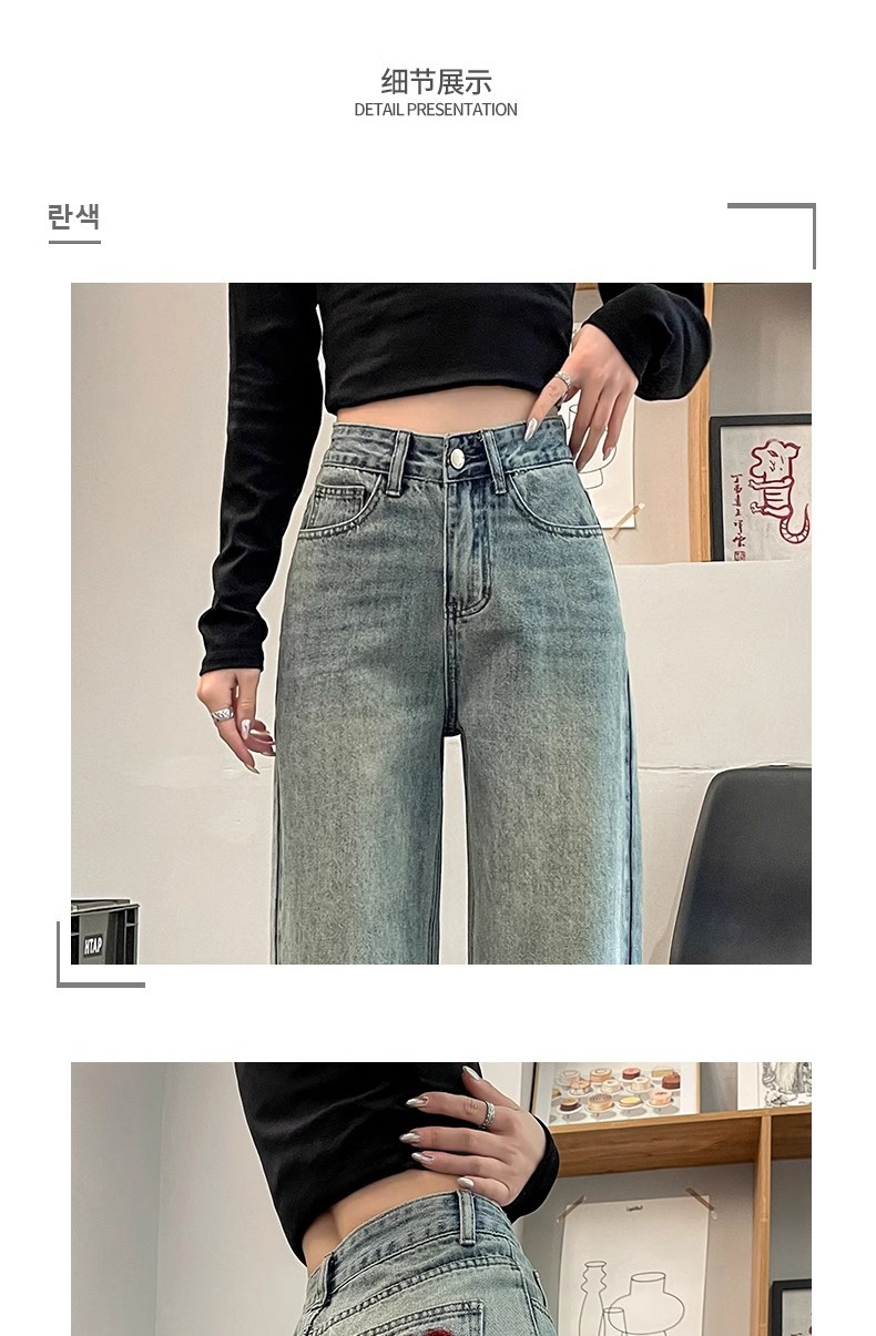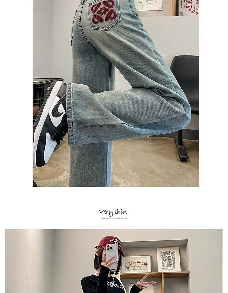 国风刺绣牛仔裤女春秋2024年新款浅色小个子宽松直筒窄版阔腿裤子