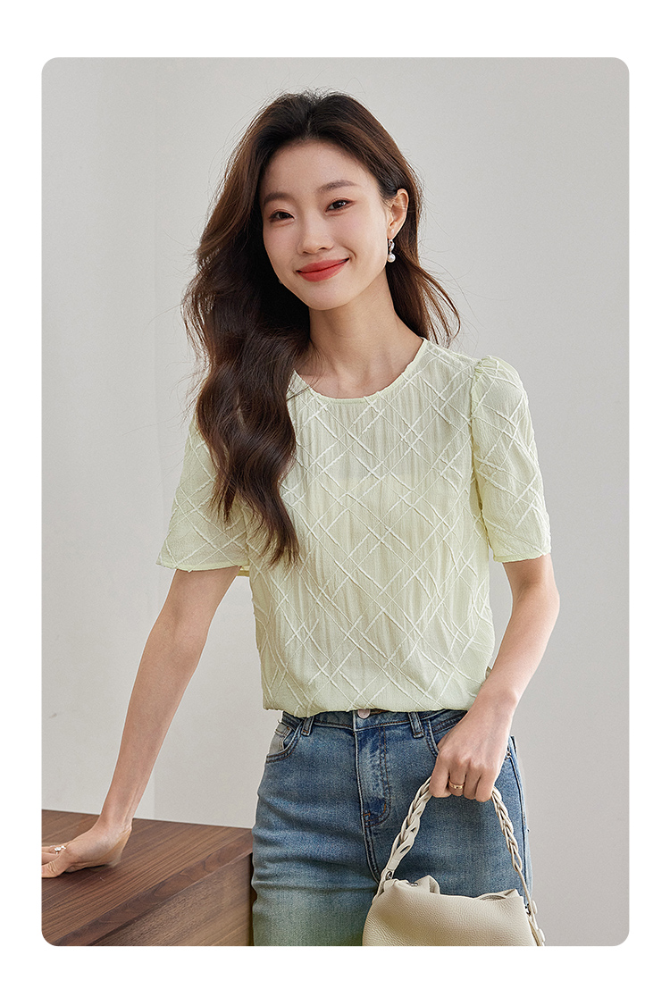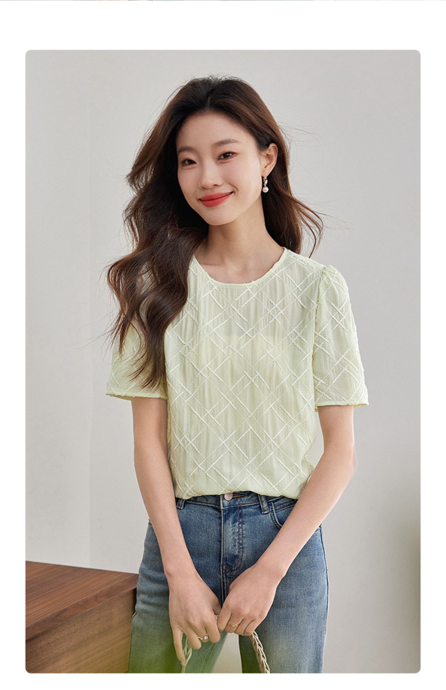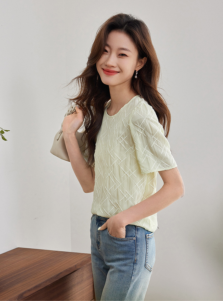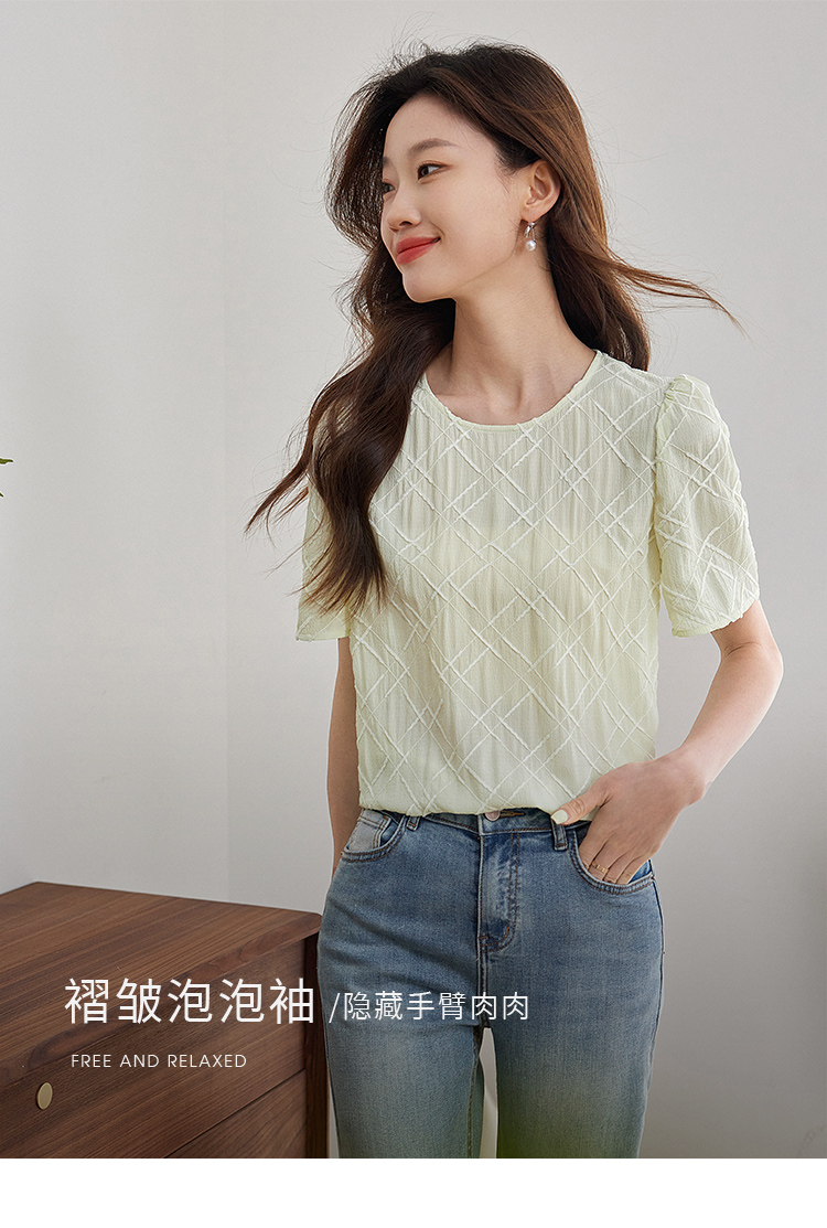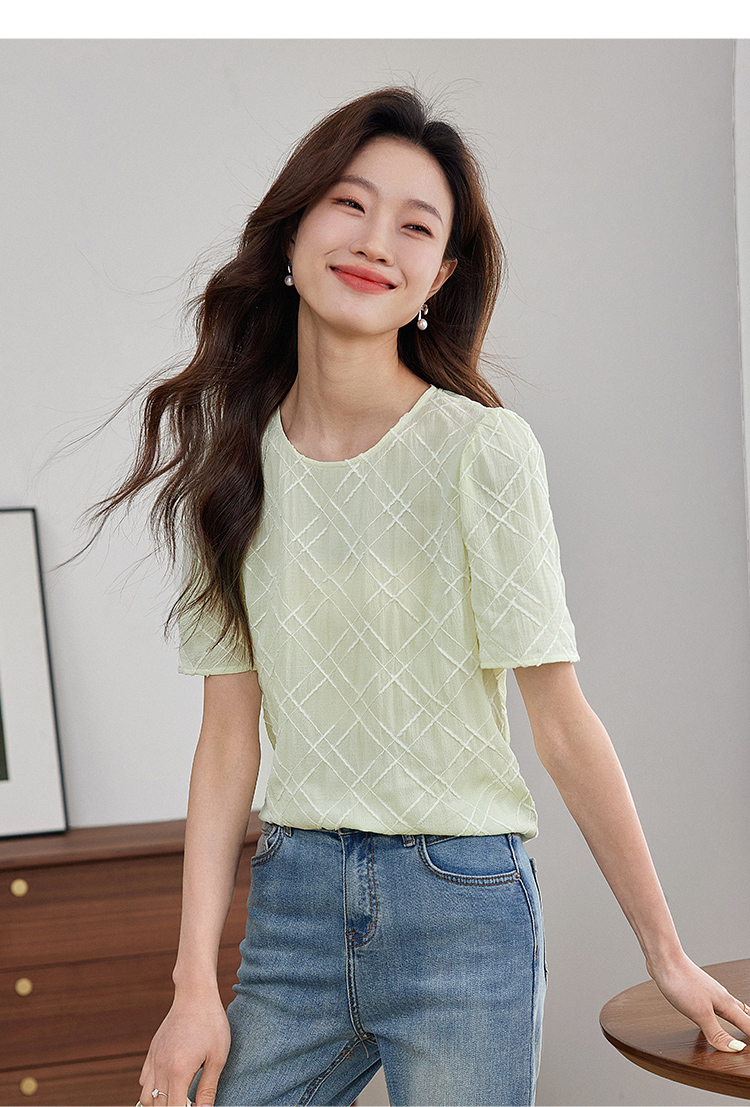 【39元福袋不支持退换】熙世界法式肌理菱格提花雪纺衫2025夏季新款别致小衫泡泡袖上衣