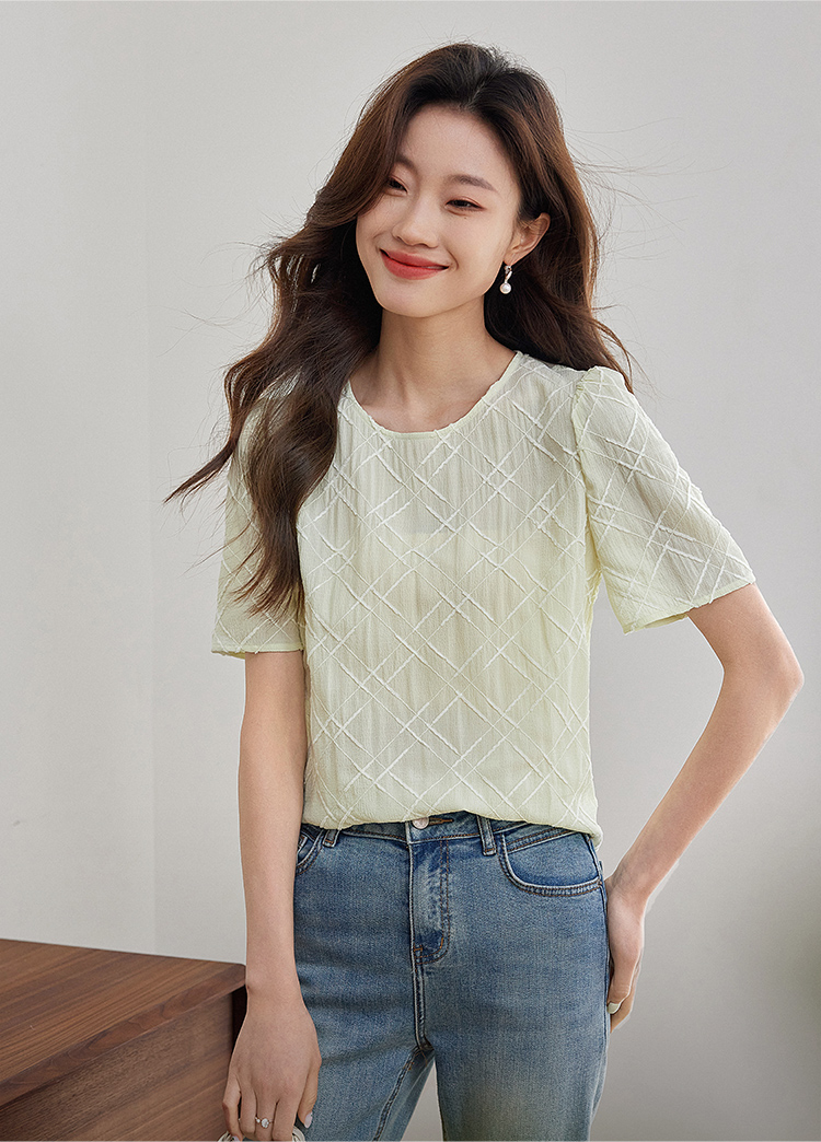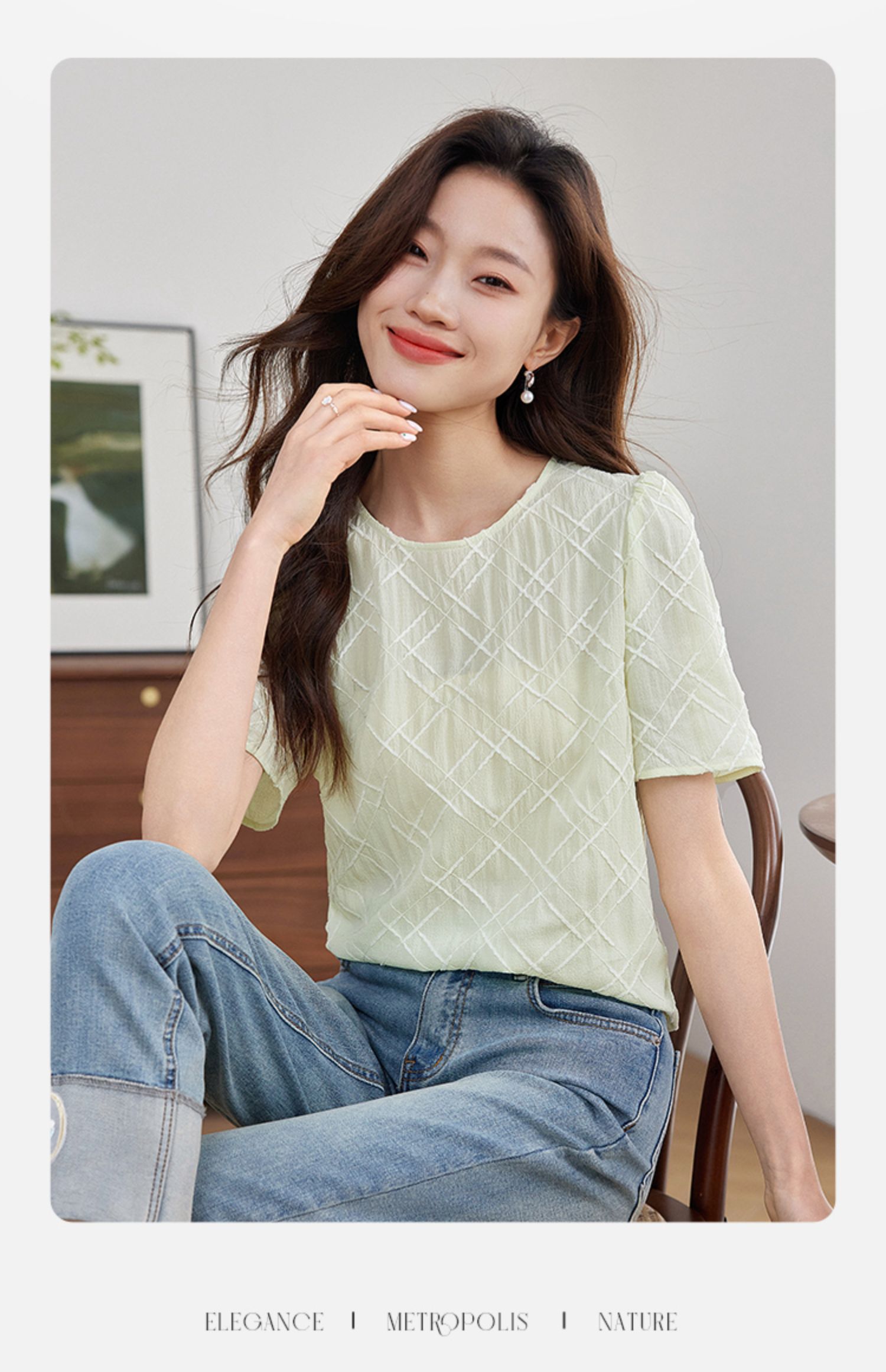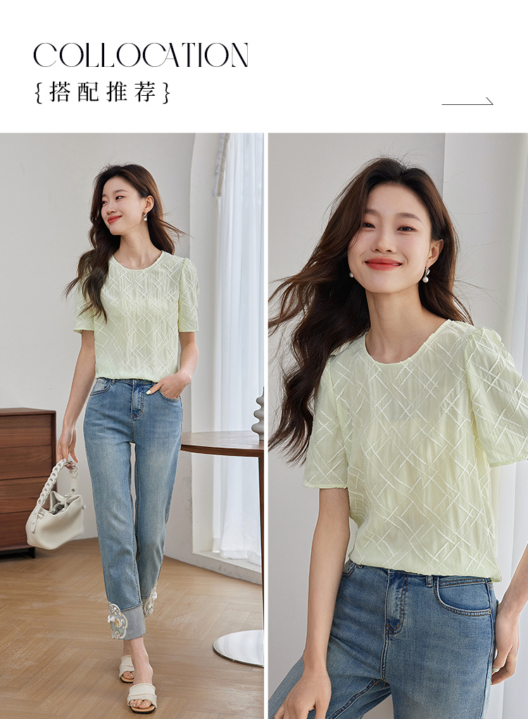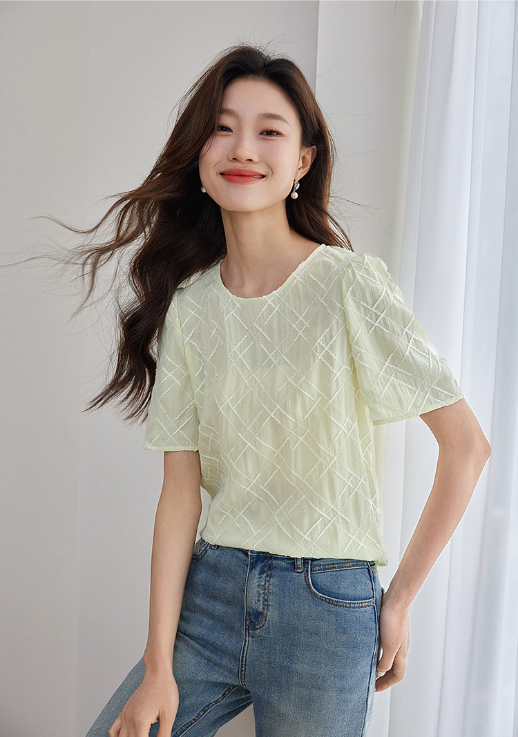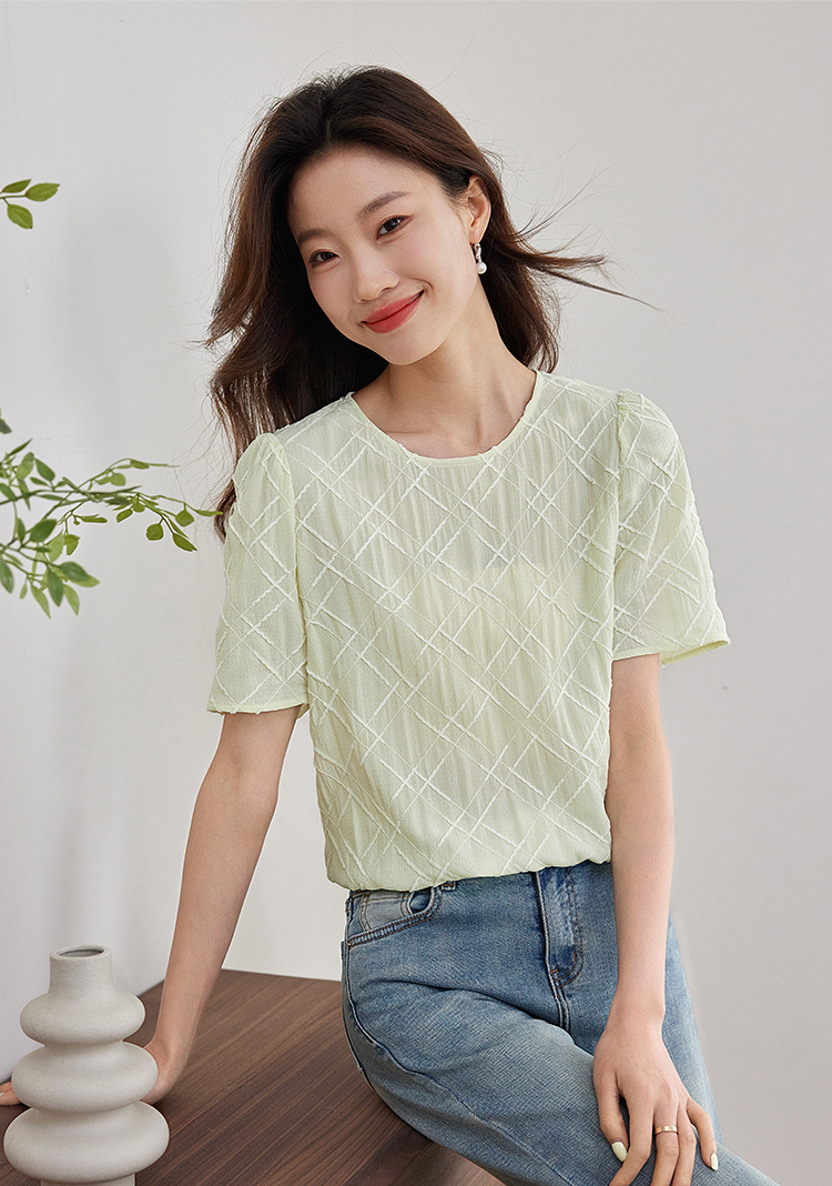 【39元福袋不支持退换】熙世界法式肌理菱格提花雪纺衫2025夏季新款别致小衫泡泡袖上衣