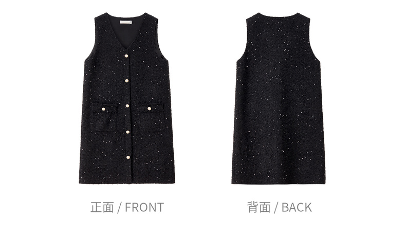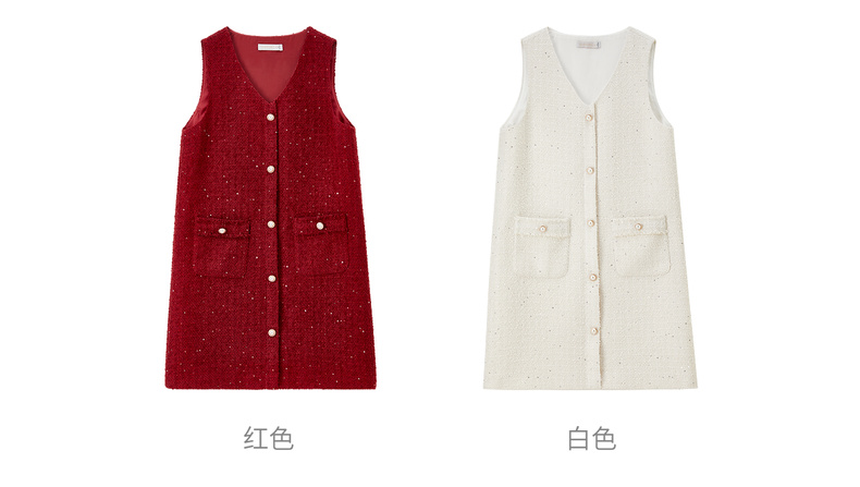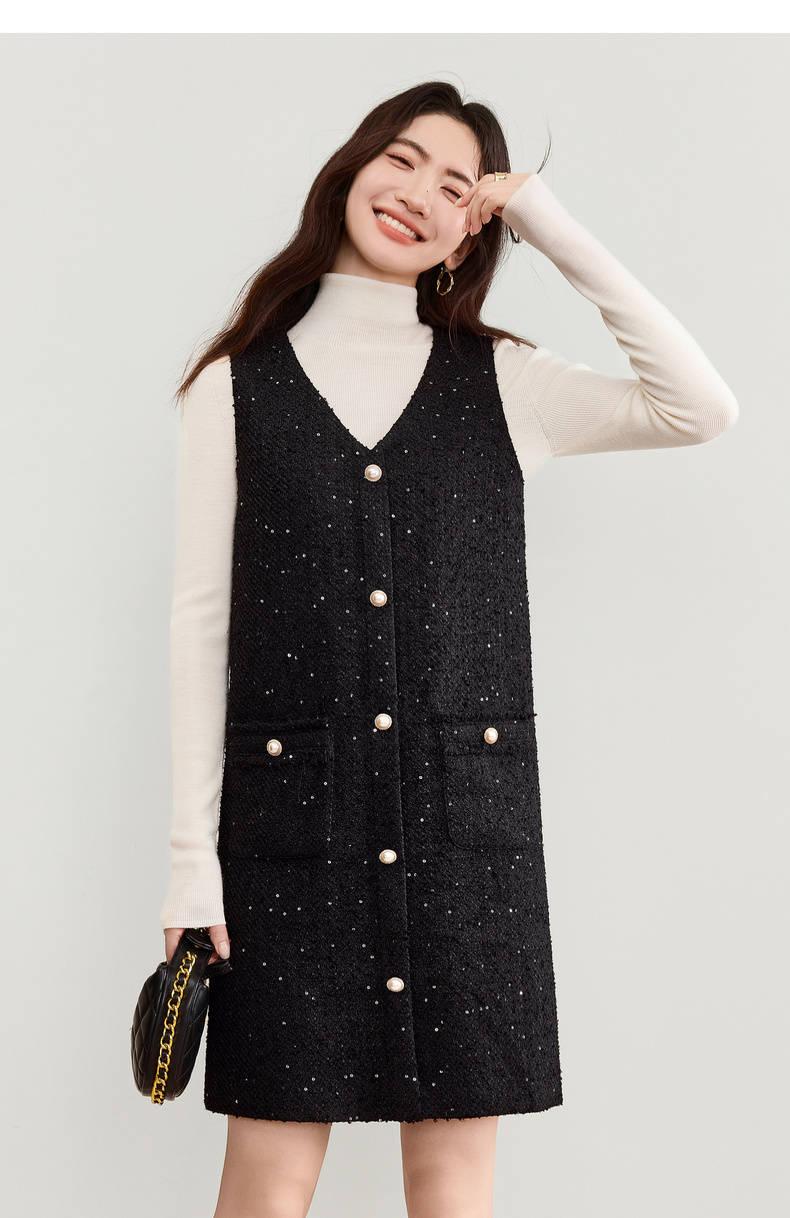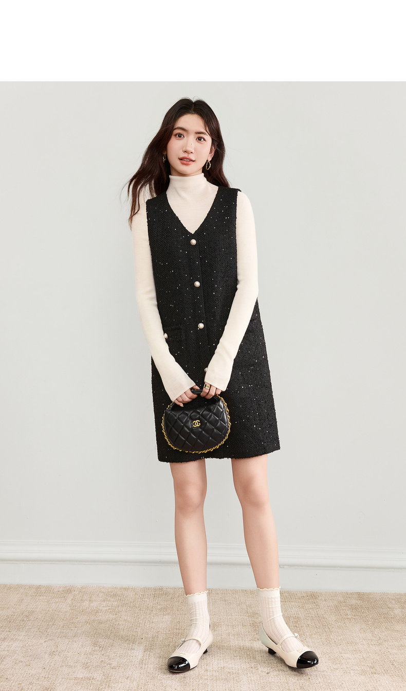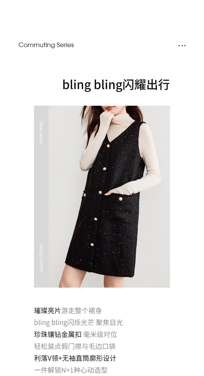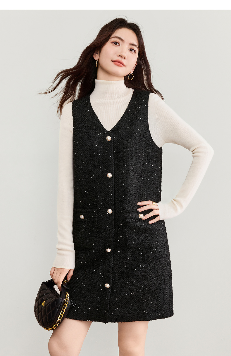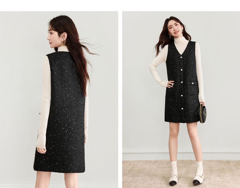 【内购】【璀璨亮片】优雅V领金属珍珠扣假门襟粗花呢小香风背心裙连衣裙-153LB3340