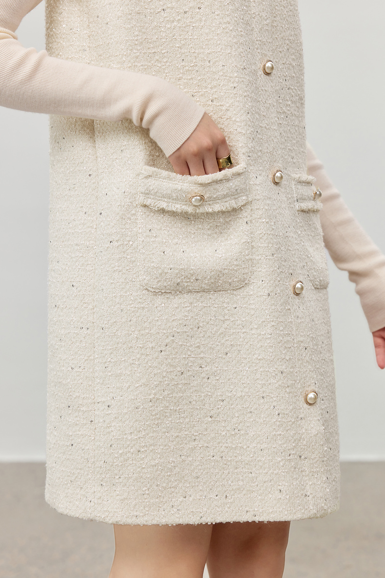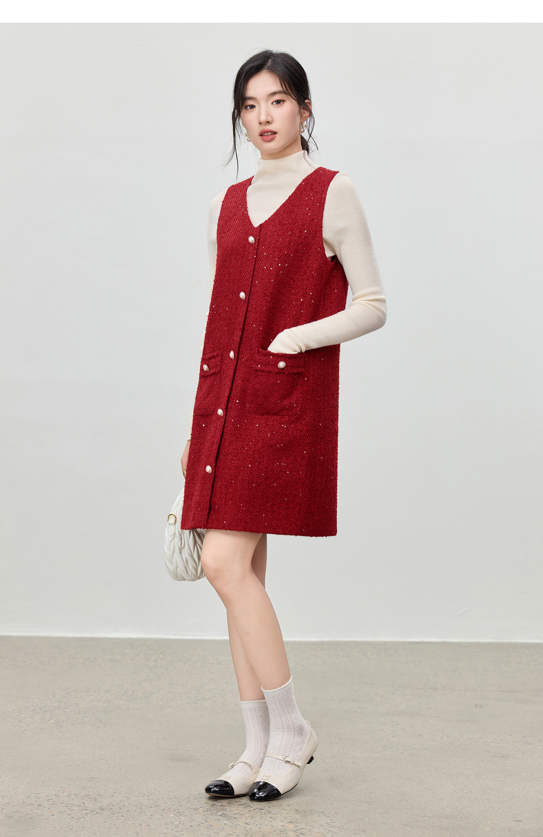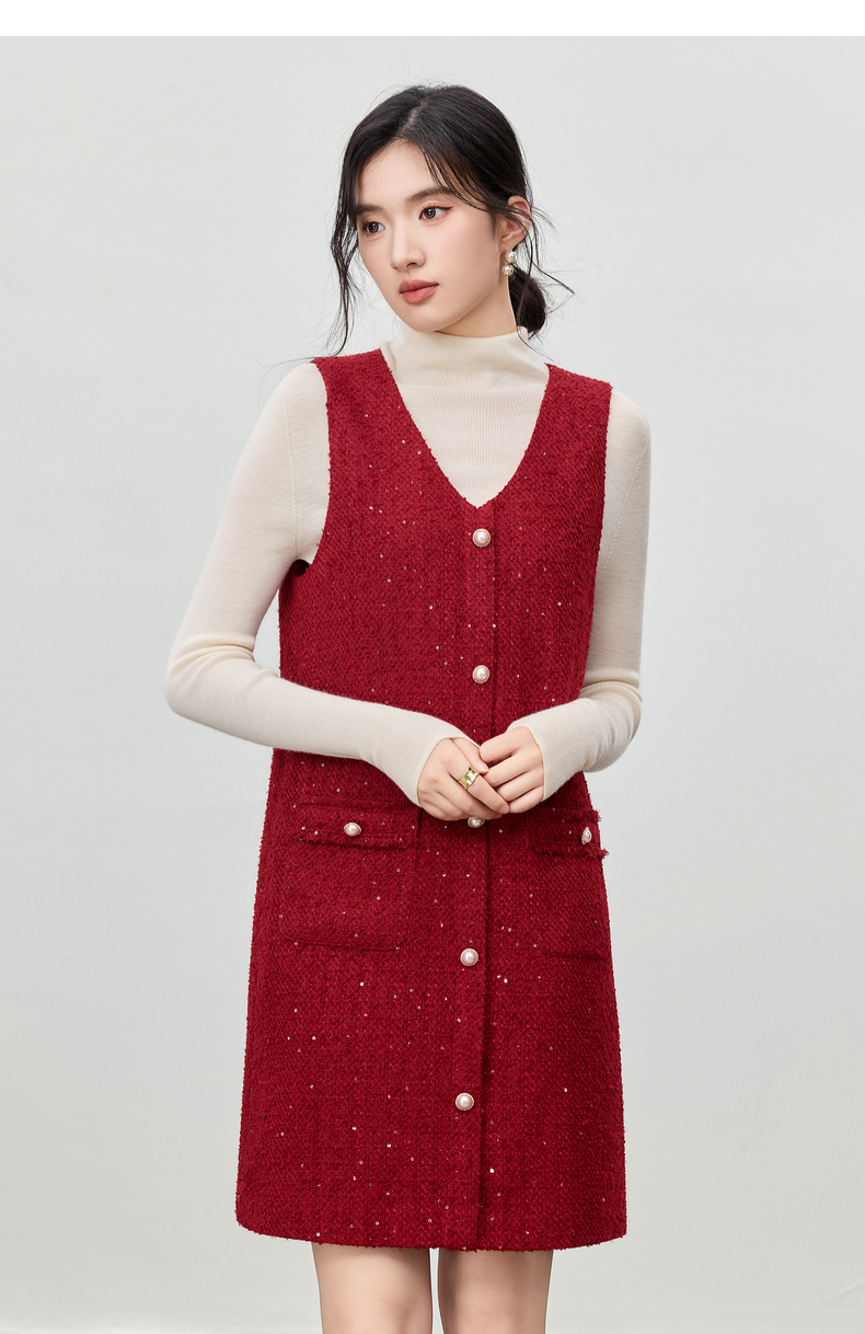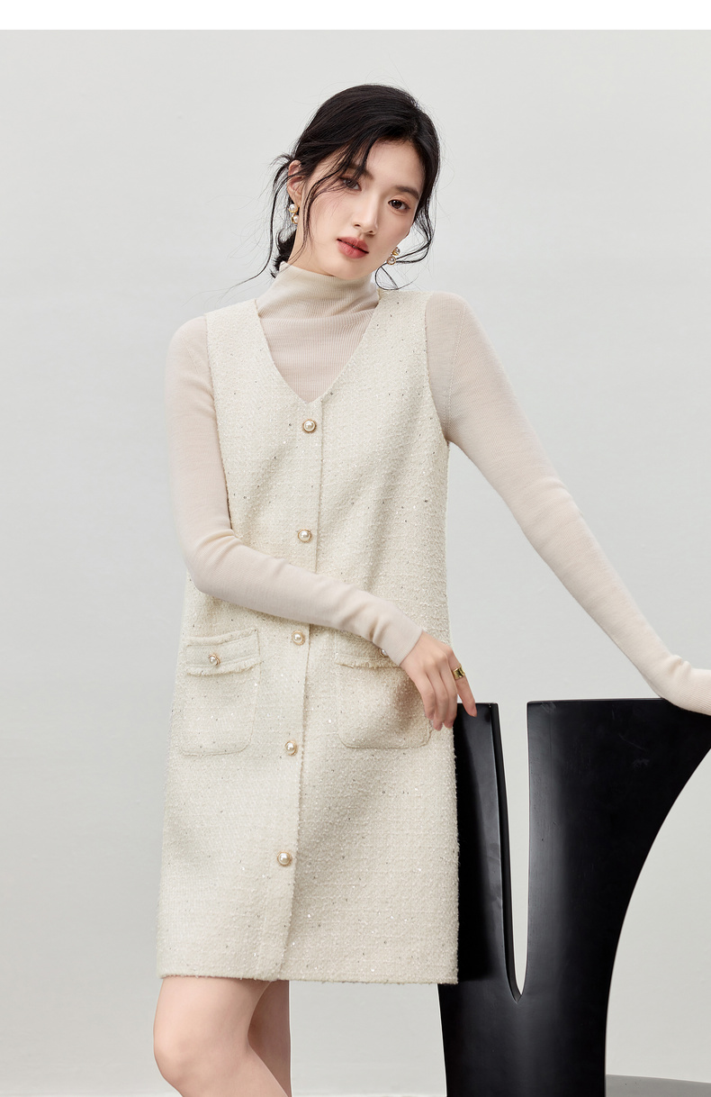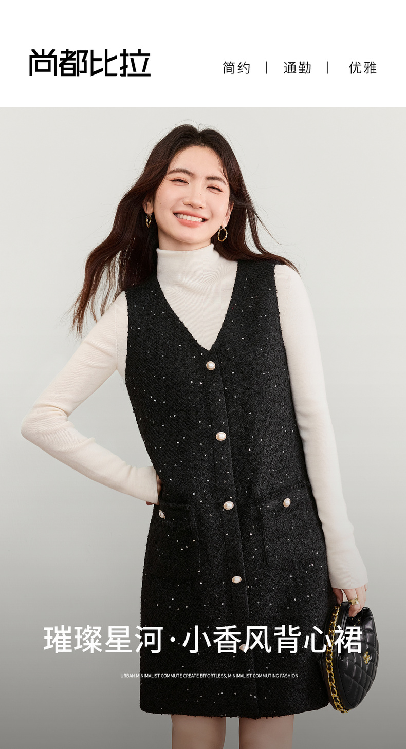 【内购】【璀璨亮片】优雅V领金属珍珠扣假门襟粗花呢小香风背心裙连衣裙-153LB3340