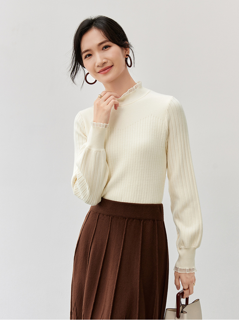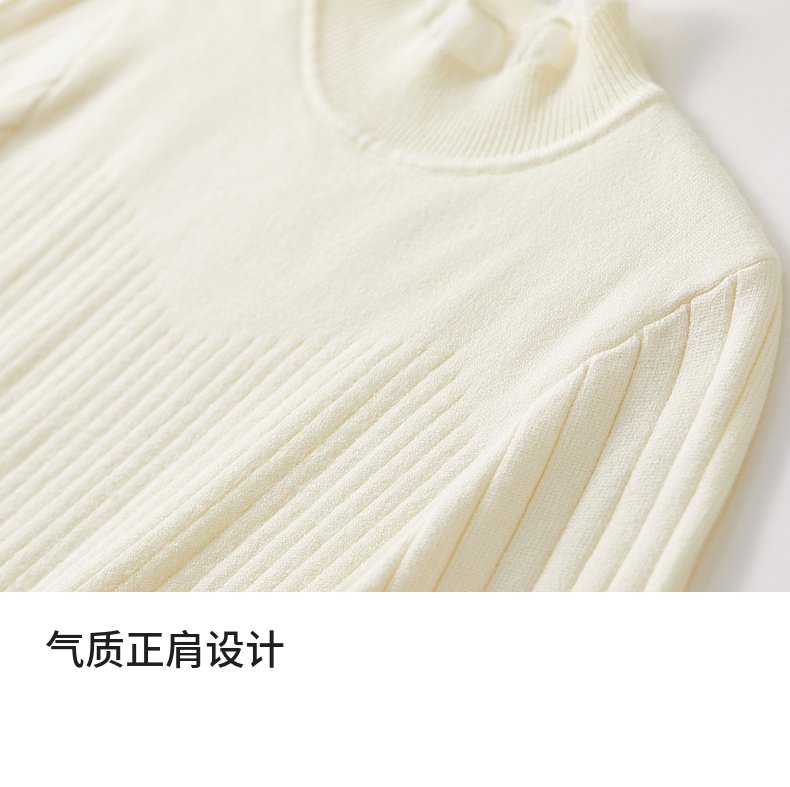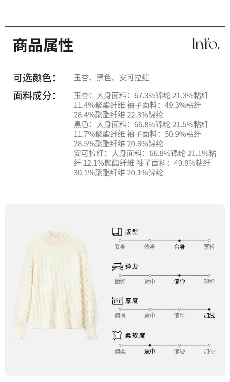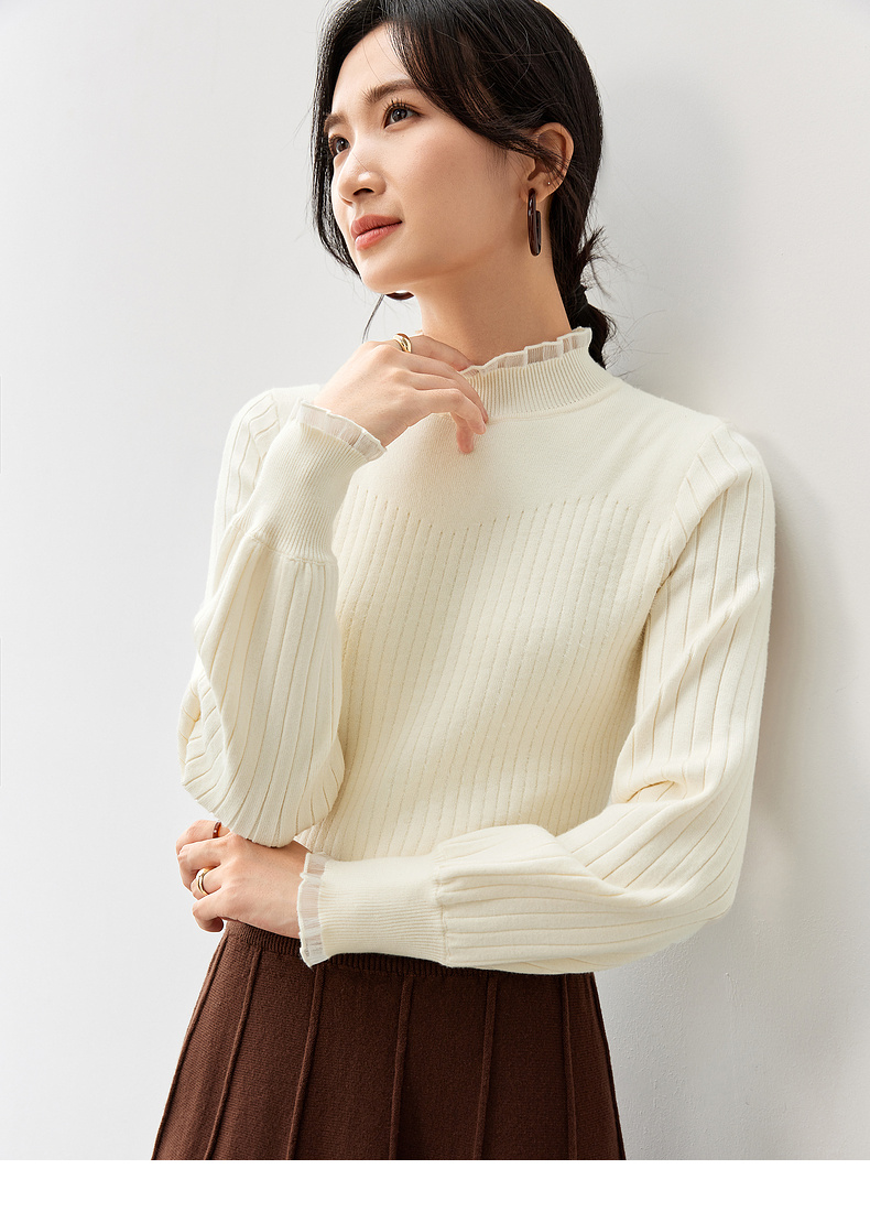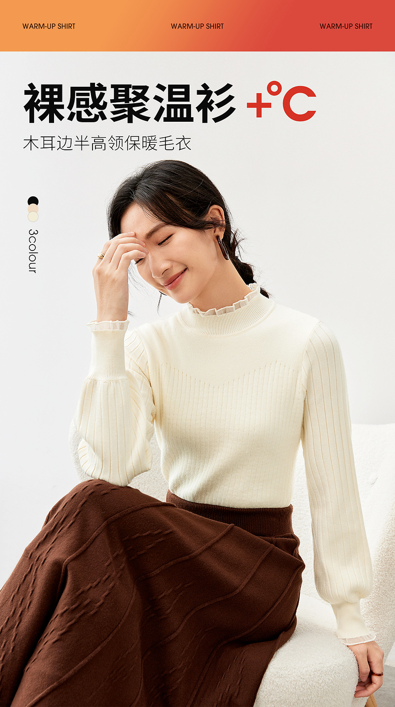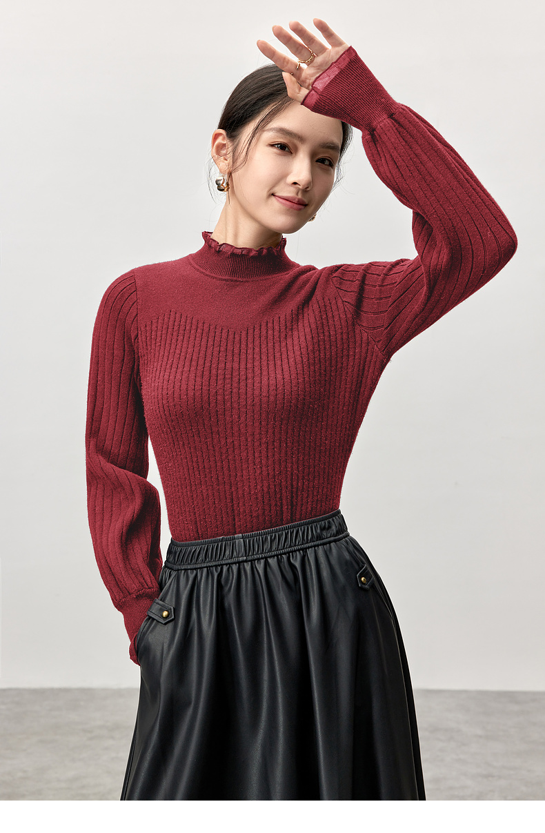 【内购】气质舒适优雅打底衫异料拼接木耳领修身显瘦长袖毛衣-W44E56588