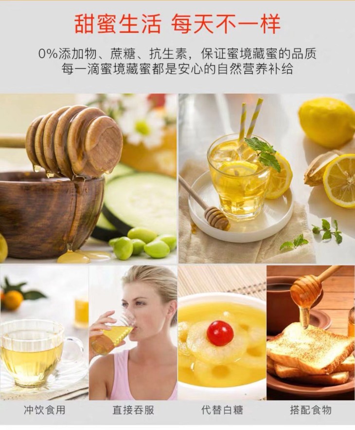 无农药残留、无抗生素残留、无蔗糖(蔗糖是复合糖不易吸收,藏蜜易吸收, 肥胖的原因是吃复合糖,糖分分解不了,吃单糖不胖)、无任何添加,100%成熟原蜜