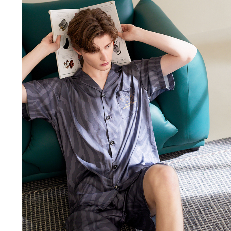 芬腾睡衣男春夏季条纹男款冰丝短袖青年宽松休闲加大码家居服套装