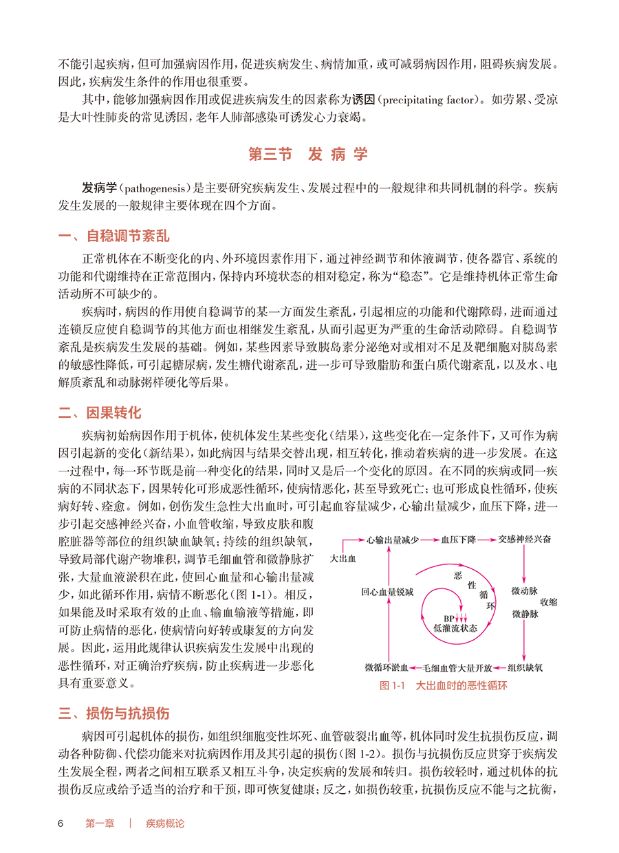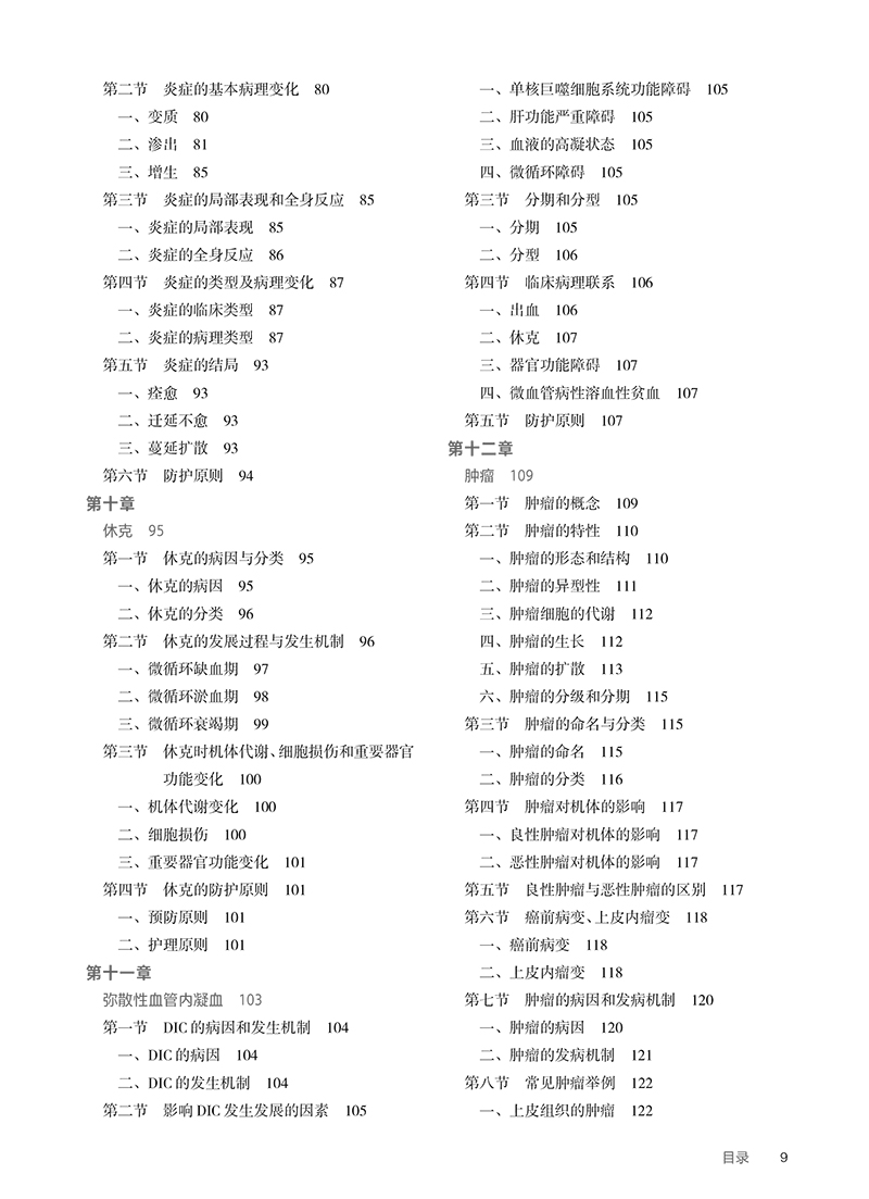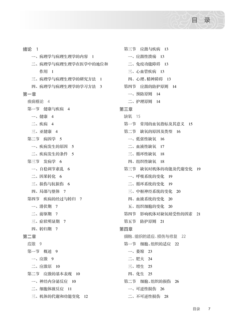 绪论/1 一、病理学与病理生理学的内容/1 二、病理学与病理生理学在医学中的地位和 作用/1 三、病理学与病理生理学的研究方法/1 四、病理学与病理生理学的学习方法/3 第一章疾病概论/4 第一节健康与疾病/4 一、健康/4 二、疾病/4 三、亚健康/4 第二节病因学/5 一、疾病发生的原因/5 二、疾病发生的条件/5 第三节发病学/6 一、自稳调节紊乱/6 二、因果转化/6 三、损伤与抗损伤/6 四、局部与整体/7 第四节疾病的经过与转归/7 一、潜伏期/7 二、前驱期/7 三、症状明显期/7 四、转归期/7 第二章应激/9 第一节概述/9 一、应激/9 二、应激原/10 第二节应激的基本表现/10 一、神经内分泌反应/10 二、细胞体液反应/11 三、机体的代谢和功能变化/12 第三节应激与疾病/13 一、应激性溃疡/13 二、免疫功能障碍/13 三、心血管疾病/13 四、心理、精神障碍/13 第四节应激的防护原则/14 一、预防原则/14 二、护理原则/14 第三章缺氧/15 第一节常用的血氧指标及其意义/15 第二节缺氧的原因及类型/16 一、低张性缺氧/16 二、血液性缺氧/17 三、循环性缺氧/18 四、组织性缺氧/18 第三节缺氧时机体的功能及代谢变化/19 一、呼吸系统的变化/19 二、循环系统的变化/19 三、中枢神经系统的变化/20 四、血液系统的变化/20 五、组织细胞的变化/20 第四节影响机体对缺氧耐受性的因素/21 第五节防护原则/21 第四章细胞、组织的适应、损伤与修复/22 第一节细胞、组织的适应/22 一、萎缩/23 二、肥大/24 三、增生/25 四、化生/25 第二节细胞、组织的损伤/26 一、可逆性损伤/26 二、不可逆性损伤/28 第三节损伤的修复/32 一、再生/32 二、纤维性修复/34 三、创伤愈合/36 四、影响再生修复的因素/37 第四节防护原则/38 第五章局部血液循环障碍/39 第一节充血和淤血/39 一、充血/39 二、淤血/40 第二节出血/42 一、原因和类型/42 二、病理变化/43 三、后果及结局/43 第三节血栓形成/43 一、血栓形成的原因、条件及机制/43 二、血栓形成的过程及血栓的形态/44 三、血栓的结局/45 四、血栓对机体的影响/46 第四节栓塞/47 一、栓子运行途径/47 二、栓塞的类型及其对机体的影响/47 第五节梗死/49 一、梗死的原因和条件/49 二、梗死的病理变化及类型/50 三、梗死对机体的影响及结局/52 第六节防护原则/52 第六章水、电解质代谢紊乱/54 第一节水、钠代谢紊乱/54 一、脱水/55 二、水肿/57 三、水中毒/58 第二节钾代谢紊乱/58 一、低钾血症/59 二、高钾血症/60 第三节防护原则/61 第七章酸碱平衡紊乱/62 第一节概述/62 一、机体中酸碱物质的来源/62 二、机体对酸碱平衡的调节/63 第二节酸碱平衡的常用指标及其意义/64 一、酸碱度(pH)/64 二、动脉血CO2分压/64 三、标准碳酸氢盐和实际碳酸氢盐/65 四、缓冲碱/65 五、碱剩余/65 六、阴离子间隙/65 第三节单纯型酸碱平衡紊乱/66 一、代谢性酸中毒/66 二、呼吸性酸中毒/68 三、代谢性碱中毒/70 四、呼吸性碱中毒/71 第四节混合型酸碱平衡紊乱/71 一、酸碱一致型酸碱平衡紊乱/72 二、酸碱混合型酸碱平衡紊乱/72 三、三重混合型酸碱平衡紊乱/72 第五节防护原则/72 第八章发热/73 第一节发热的原因和机制/74 一、发热的原因/74 二、发热的机制/75 第二节发热的分期/76 一、体温上升期/76 二、高温持续期/76 三、体温下降期/76 第三节发热时机体的代谢和功能变化/76 一、代谢变化/76 二、功能变化/77 第四节防护原则/77 第九章炎症/79 第一节炎症的原因/79 第二节炎症的基本病理变化/80 一、变质/80 二、渗出/81 三、增生/85 第三节炎症的局部表现和全身反应/85 一、炎症的局部表现/85 二、炎症的全身反应/86 第四节炎症的类型及病理变化/87 一、炎症的临床类型/87 二、炎症的病理类型/87 第五节炎症的结局/93 一、痊愈/93 二、迁延不愈/93 三、蔓延扩散/93 第六节防护原则/94 第十章休克/95 第一节休克的病因与分类/95 一、休克的病因/95 二、休克的分类/96 第二节休克的发展过程与发生机制/96 一、微循环缺血期/97 二、微循环淤血期/98 三、微循环衰竭期/99 第三节休克时机体代谢、细胞损伤和重要器官 功能变化/100 一、机体代谢变化/100 二、细胞损伤/100 三、重要器官功能变化/101 第四节休克的防护原则/101 一、预防原则/101 二、护理原则/101 第十一章弥散性血管内凝血/103 第一节DIC的病因和发生机制/104 一、DIC的病因/104 二、DIC的发生机制/104 第二节影响DIC发生发展的因素/105 一、单核巨噬细胞系统功能障碍/105 二、肝功能严重障碍/105 三、血液的高凝状态/105 四、微循环障碍/105 第三节分期和分型/105 一、分期/105 二、分型/106 第四节临床病理联系/106 一、出血/106 二、休克/107 三、器官功能障碍/107 四、微血管病性溶血性贫血/107 第五节防护原则/107 第十二章肿瘤/109 第一节肿瘤的概念/109 第二节肿瘤的特性/110 一、肿瘤的形态和结构/110 二、肿瘤的异型性/111 三、肿瘤细胞的代谢/112 四、肿瘤的生长/112 五、肿瘤的扩散/113 六、肿瘤的分级和分期/115 第三节肿瘤的命名与分类/115 一、肿瘤的命名/115 二、肿瘤的分类/116 第四节肿瘤对机体的影响/117 一、良性肿瘤对机体的影响/117 二、恶性肿瘤对机体的影响/117 第五节良性肿瘤与恶性肿瘤的区别/117 第六节癌前病变、上皮内瘤变/118 一、癌前病变/118 二、上皮内瘤变/118 第七节肿瘤的病因和发病机制/120 一、肿瘤的病因/120 二、