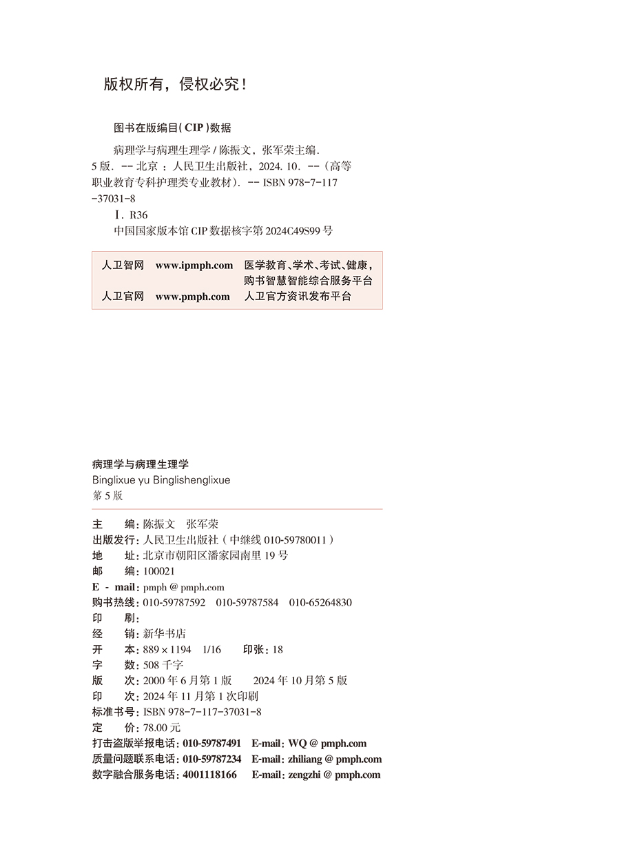 病理学与病理生理学 第5版 十四五规划全国高等职业教育专科教材 供护理助产专业用 陈振文 张军荣编 人民卫生出版社9787117370318