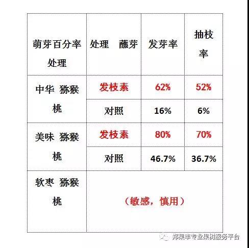 对于中华、美味猕猴桃,使用发枝素蘸芽处理,其发枝率和抽枝率明显比不处理要高很多(上表)。