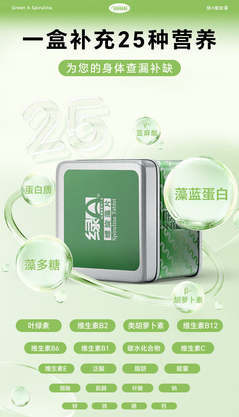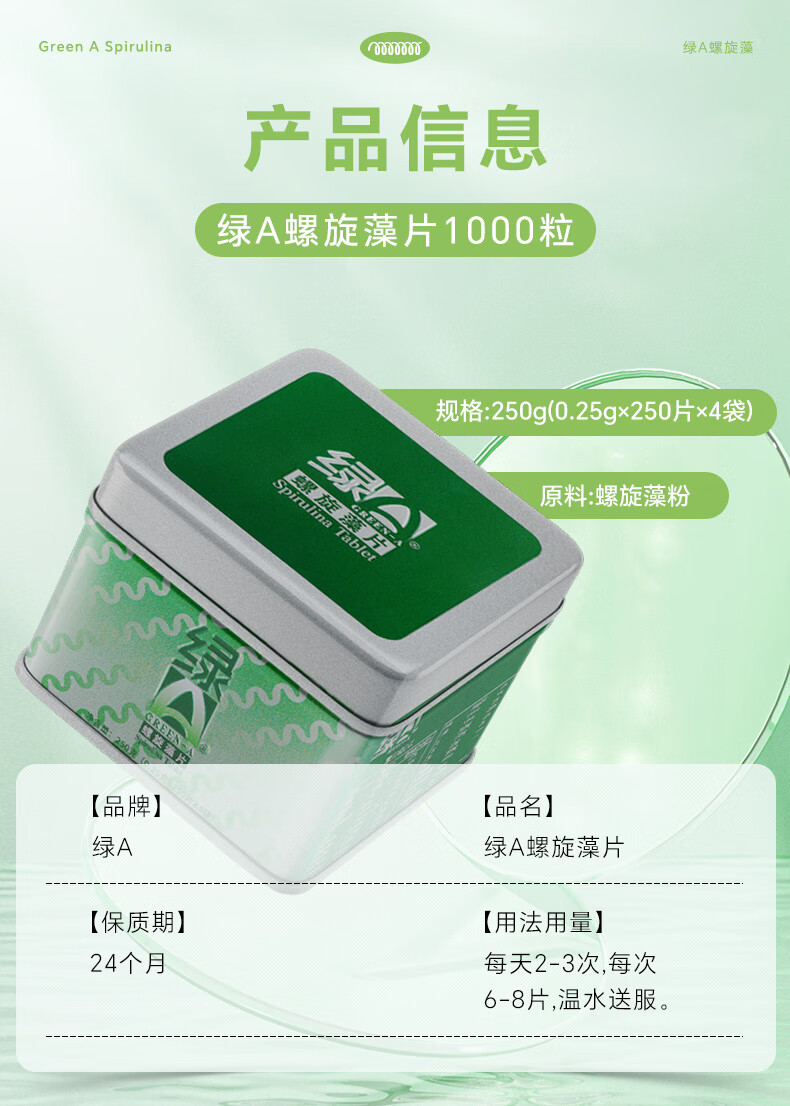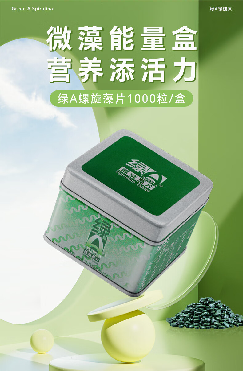 【12.12年终盛典】买3送500粒 绿A螺旋藻片0.25*1000粒铁盒装 30+营养素 营养均衡 易吸收