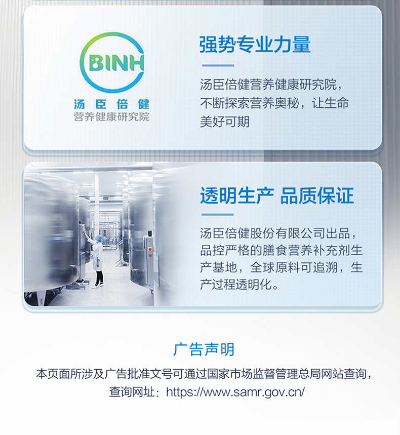- 作为全球膳食营养补充剂行业领先者,汤臣倍健实施科学营养战略,建立了全面的膳食营养补充剂科学体系,携手全球前沿科研力量,以极致的科学精神,打造极致的科学营养产品力。