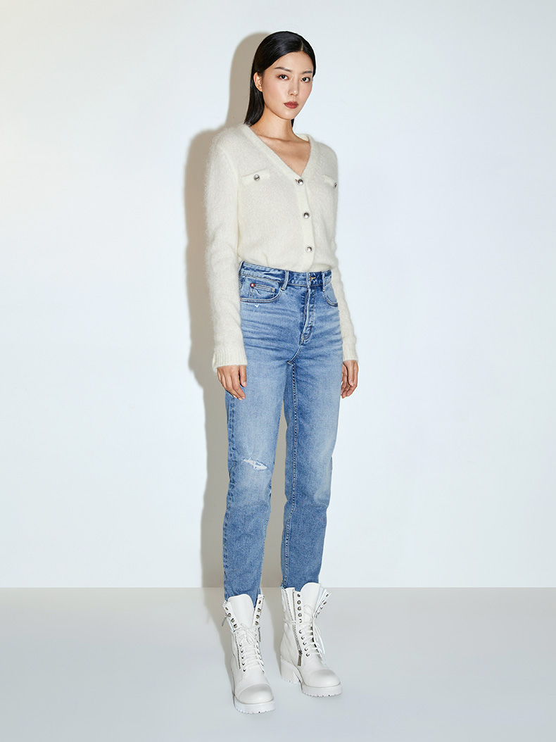 含有超细南非进口马海毛,毛绒蓬松柔软,手感滑糯细腻,贴肤不扎肉,纱线中加入了适量弹力纤维,令穿着更舒适自在。