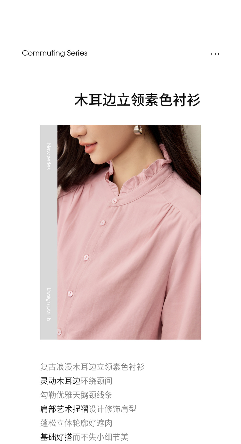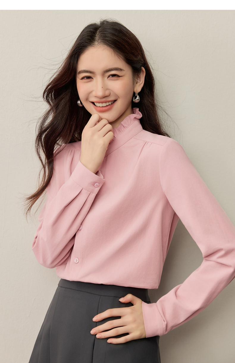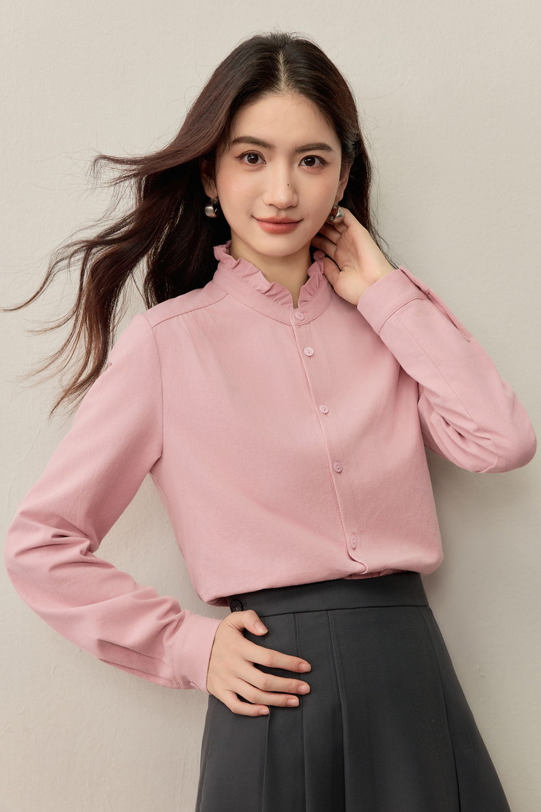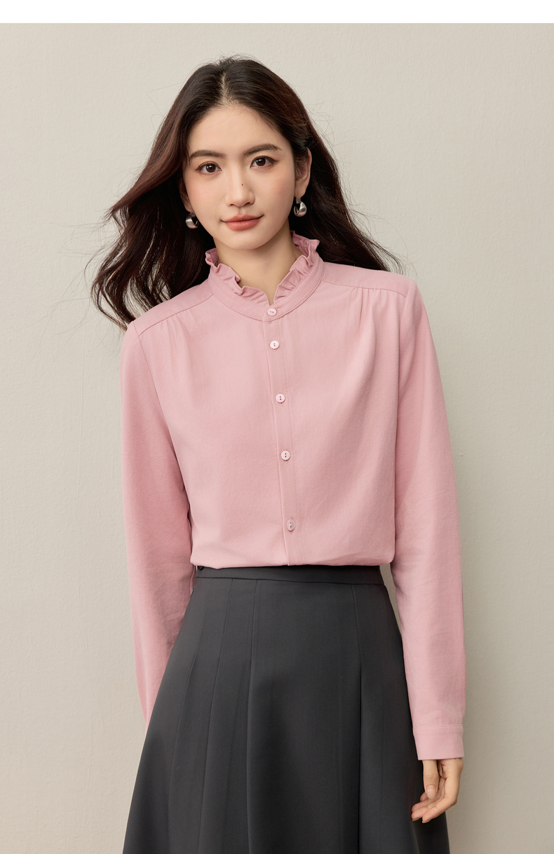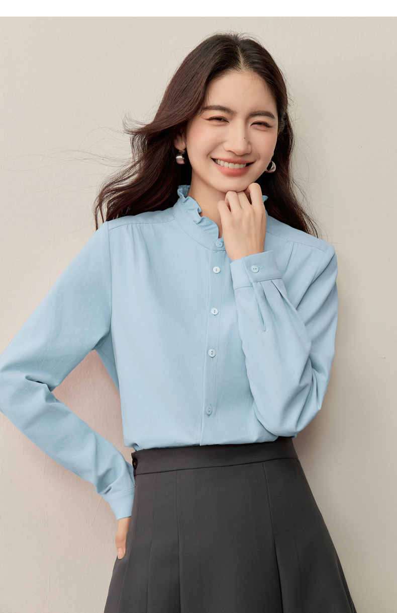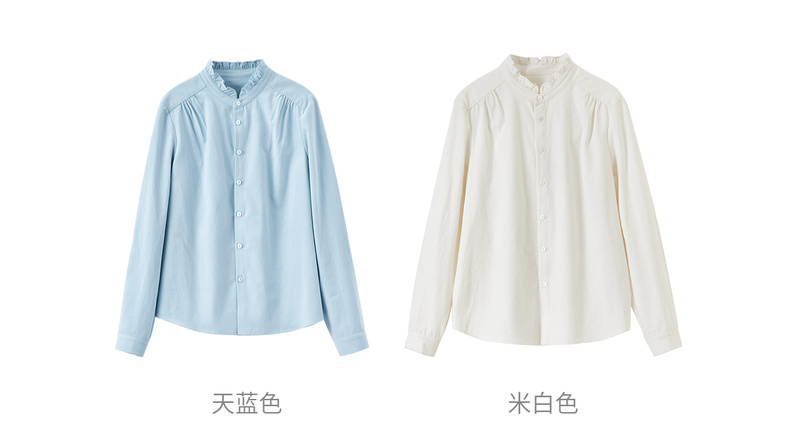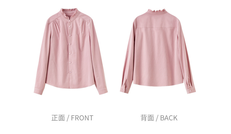 【内购】【木耳边领口】木耳边小立领肩部捏褶门襟单排扣压褶袖口衬衫-153CA1935