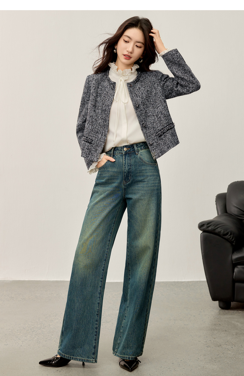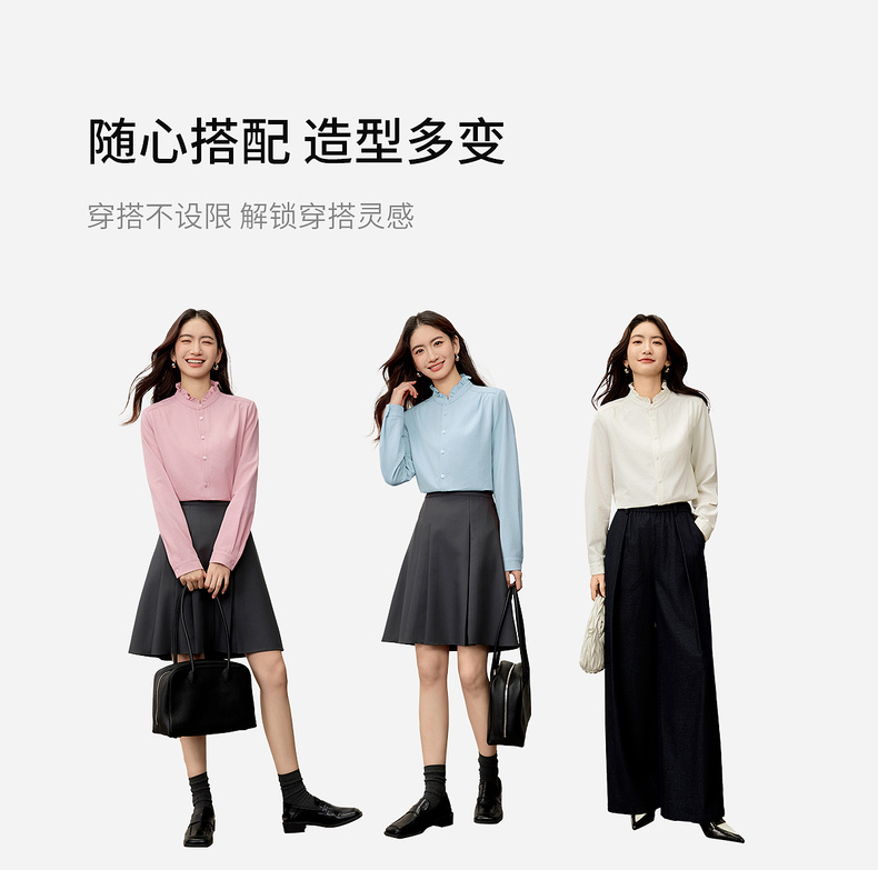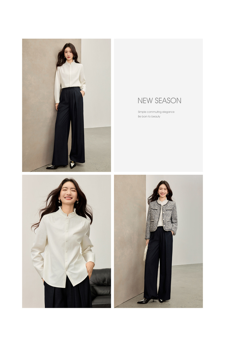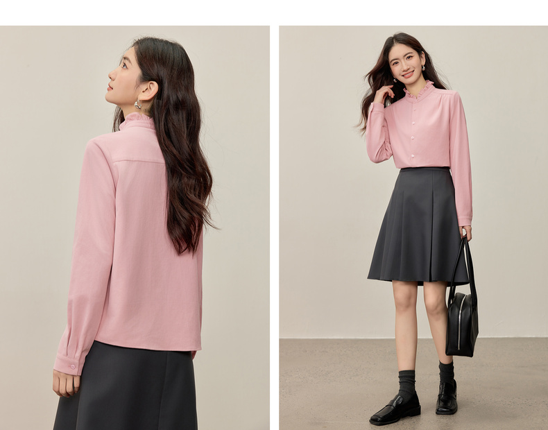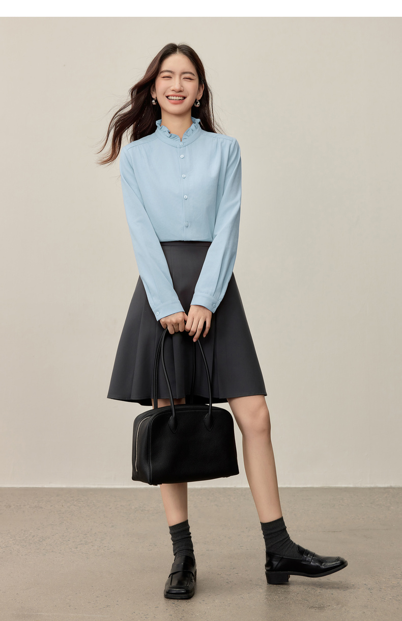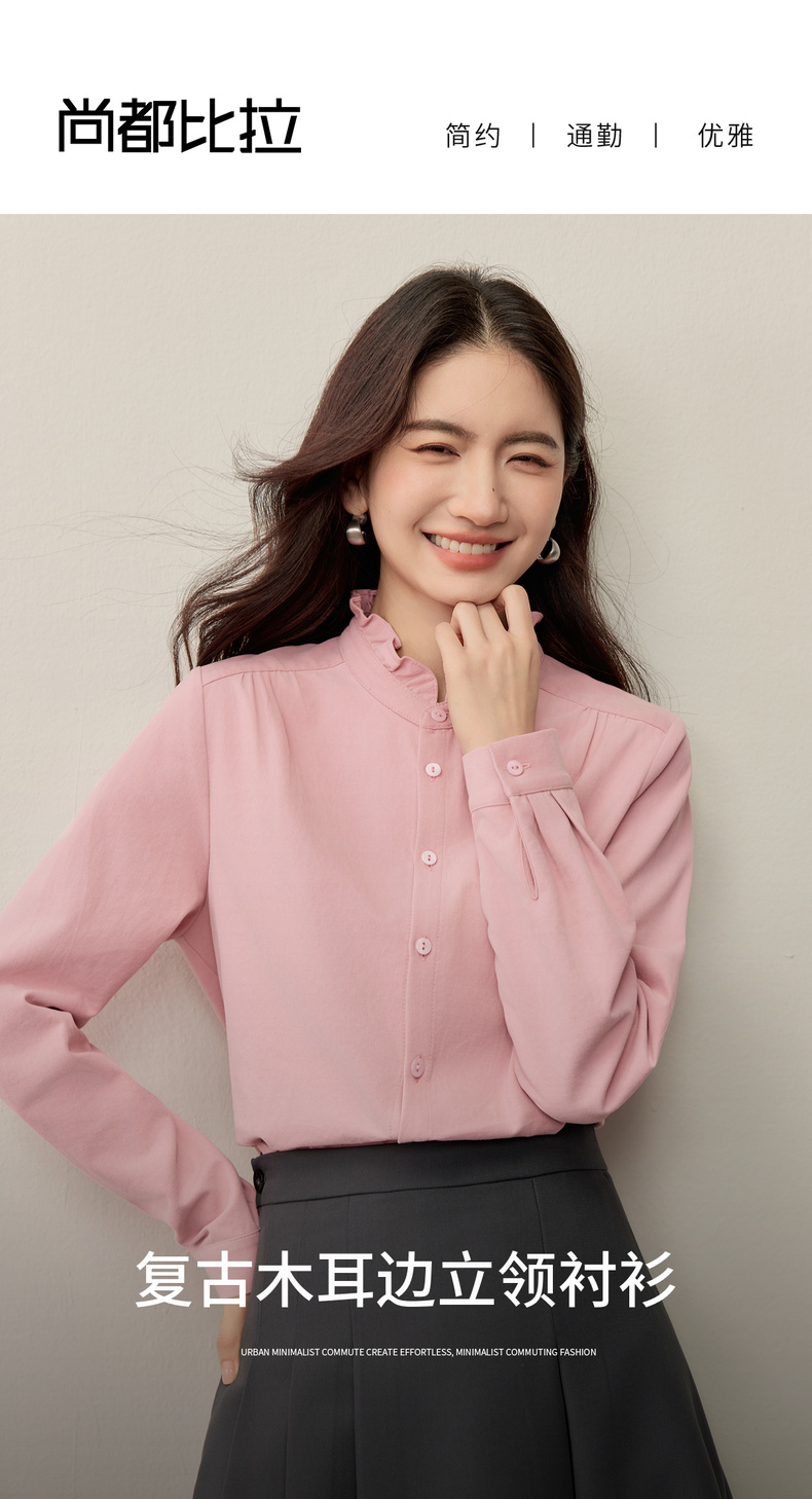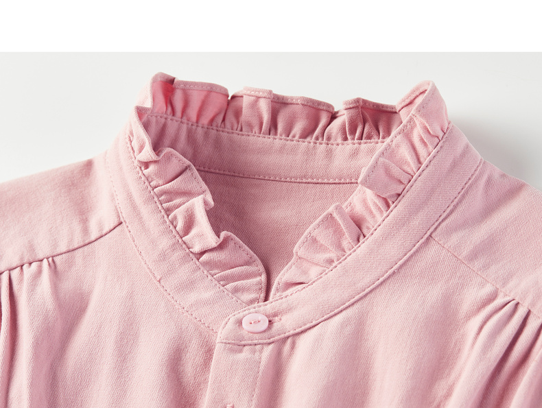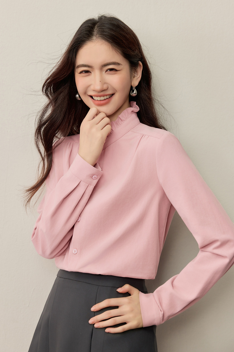 【内购】【木耳边领口】木耳边小立领肩部捏褶门襟单排扣压褶袖口衬衫-153CA1935