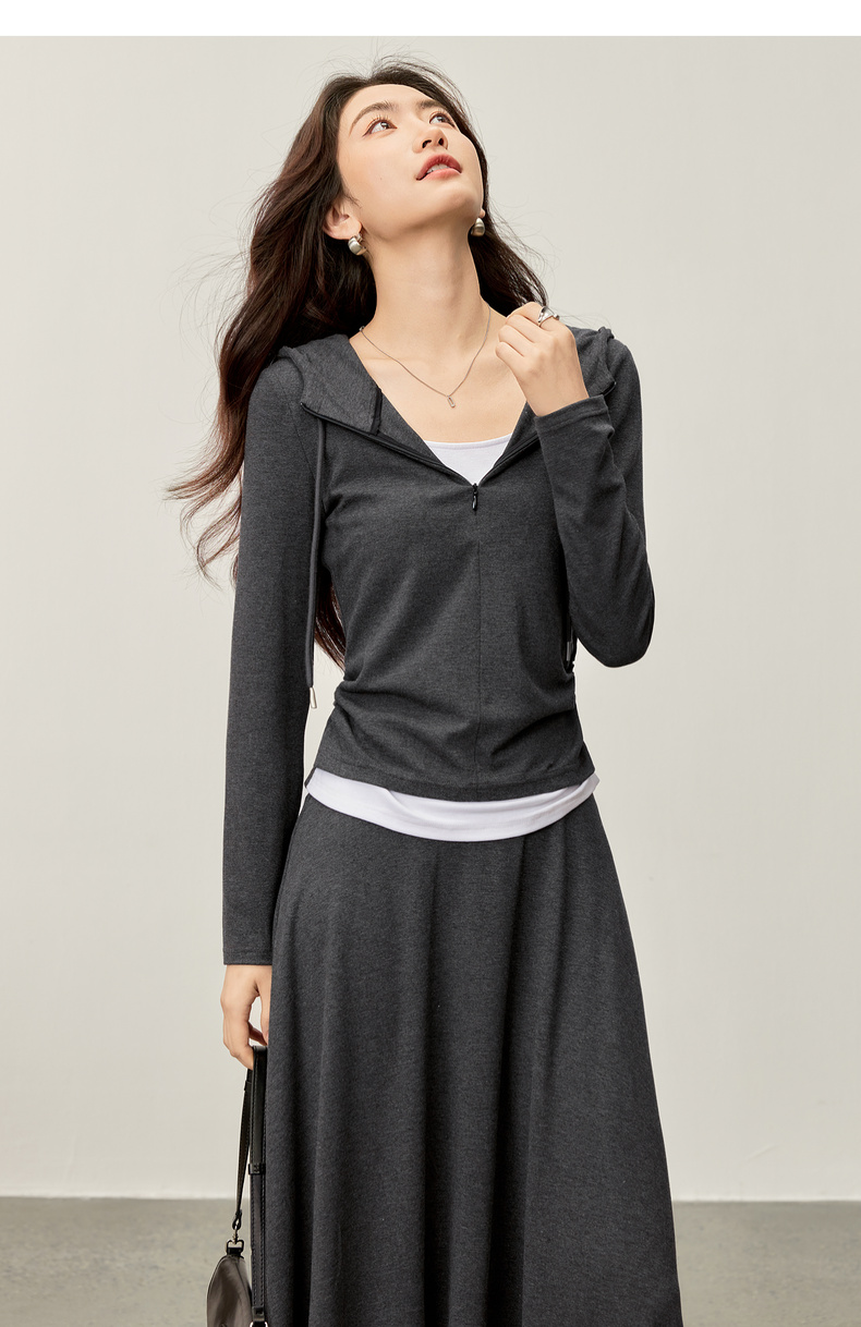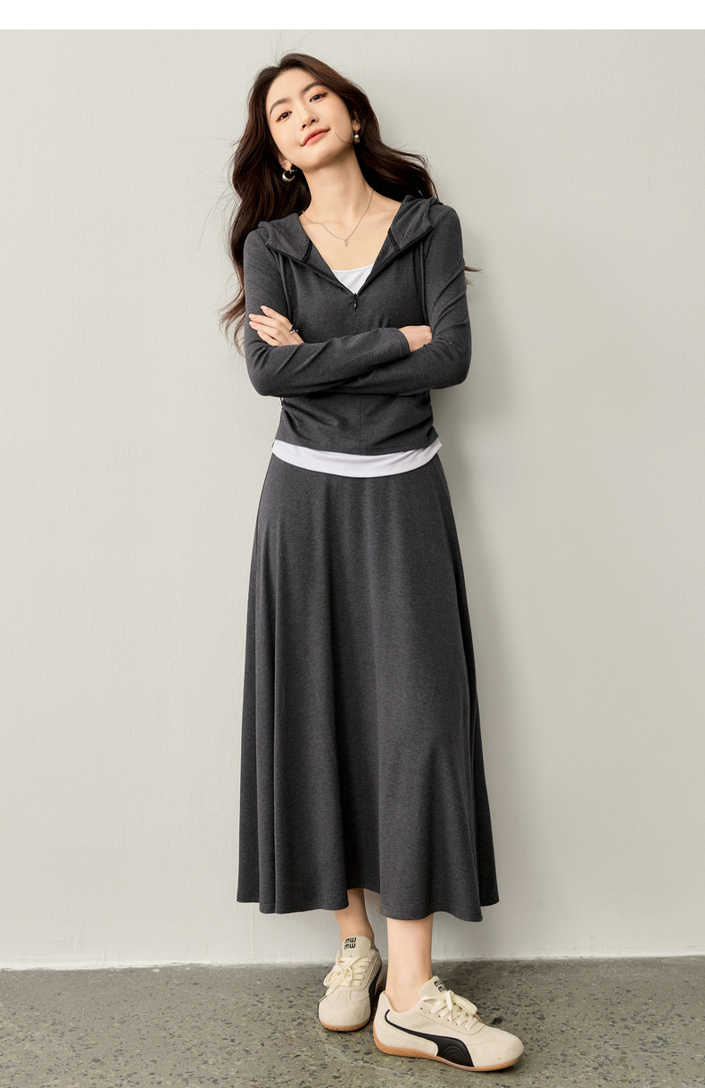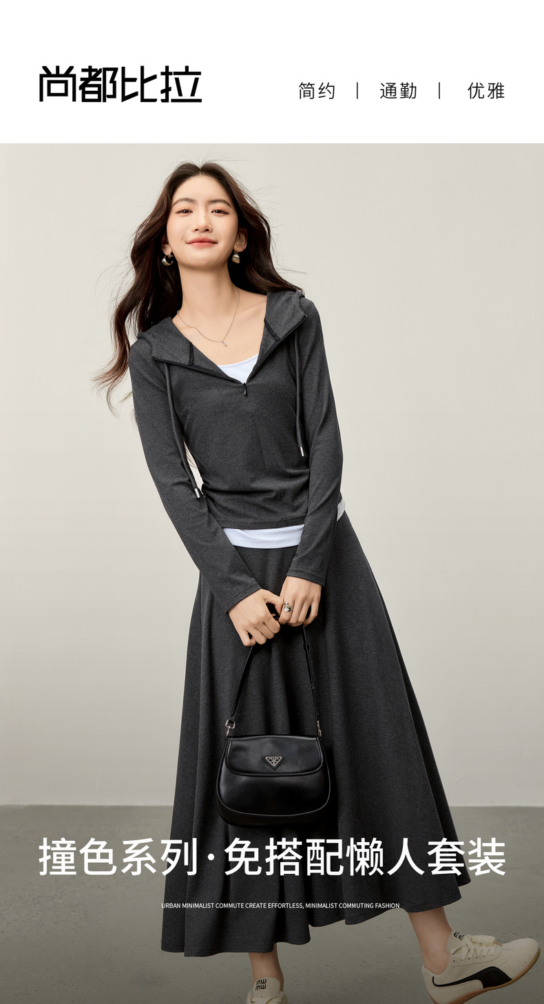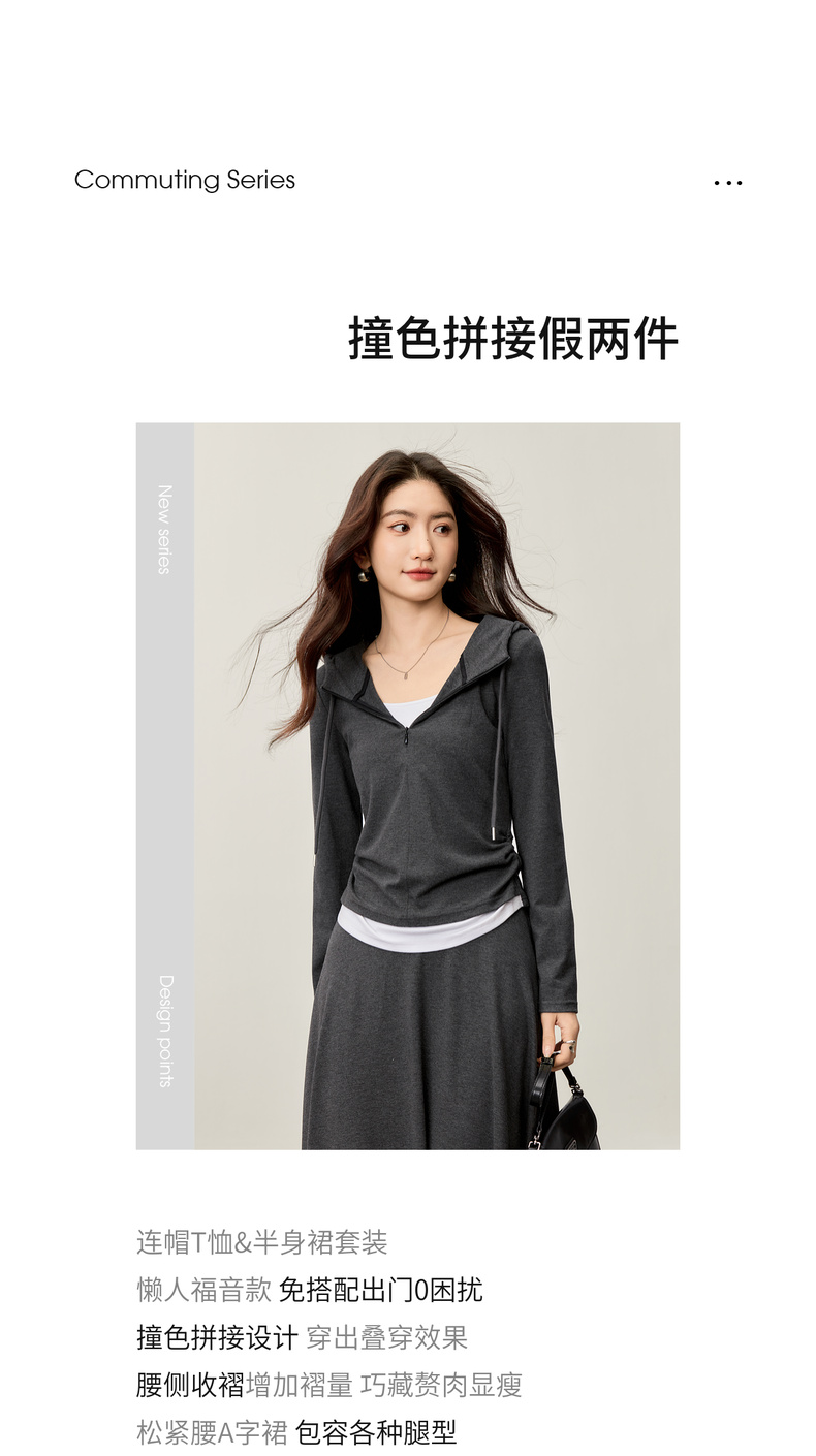 【内购】【拼接假两件】简约休闲撞色设计长袖T恤松紧腰抽绳A字半身裙套装-153ZF2837