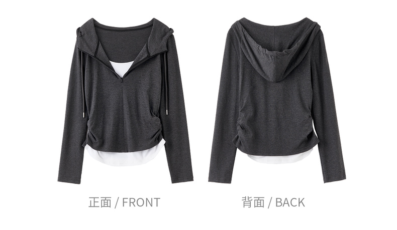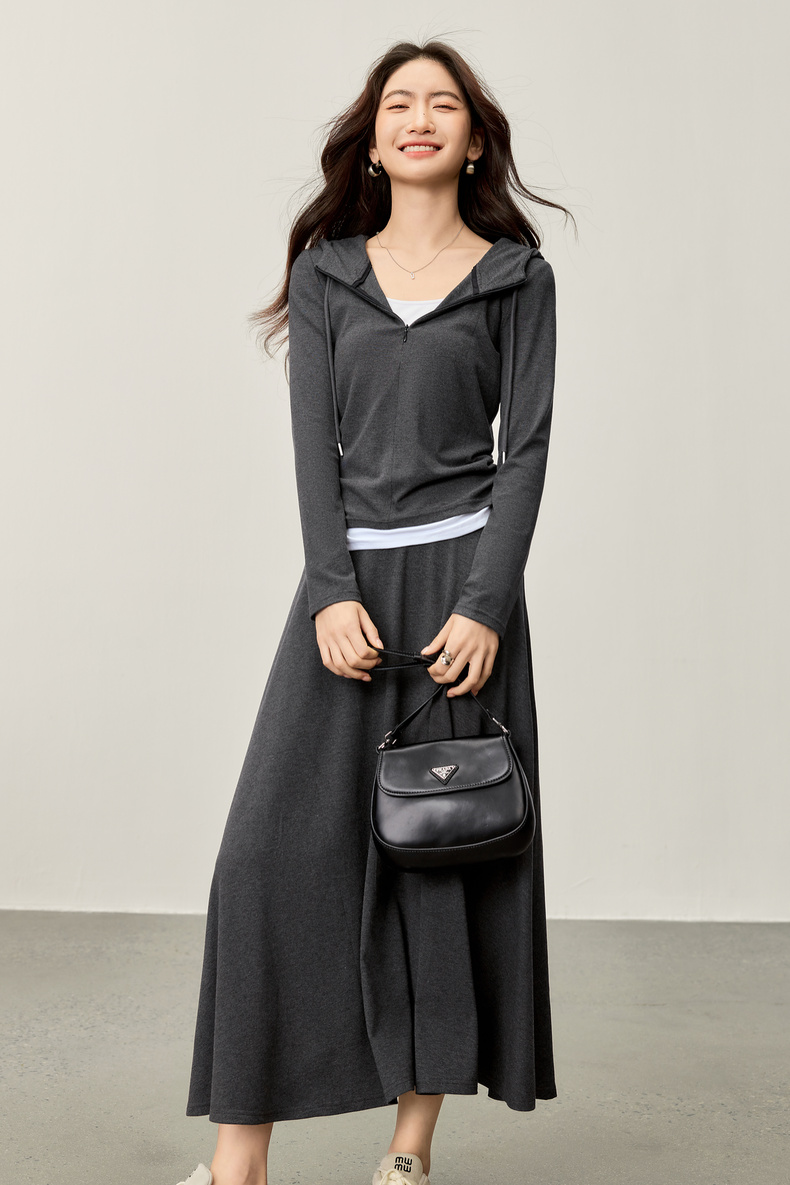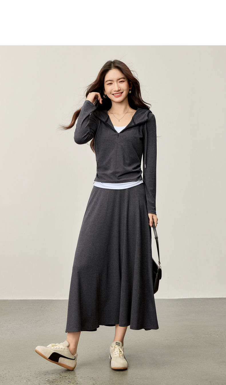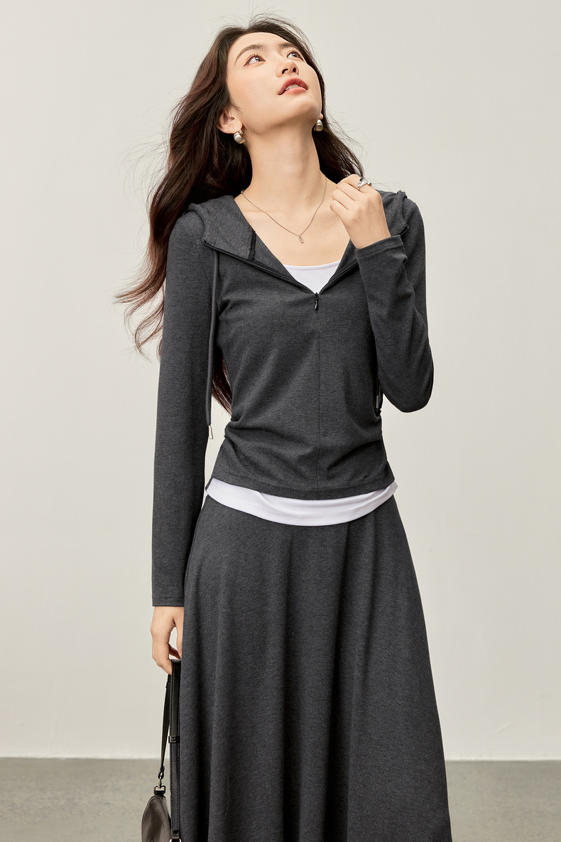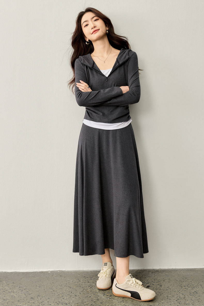 【内购】【拼接假两件】简约休闲撞色设计长袖T恤松紧腰抽绳A字半身裙套装-153ZF2837