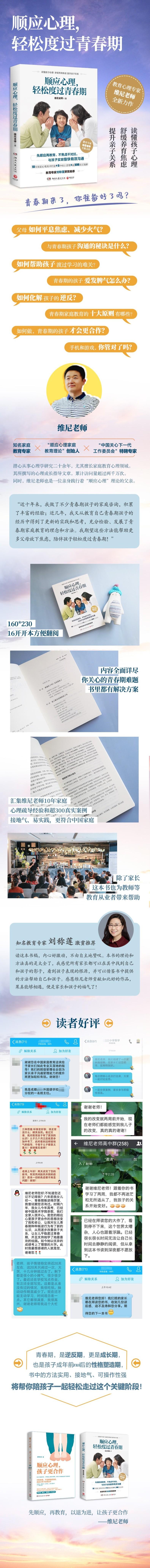 ◆青春期,是逆反期,更是成长期,也是孩子成年前最后的性格塑造期,书中的方法实用、接地气、可操作性强,将帮你陪孩子一起轻松走过这个关键阶段! ◆先顺应再教育,不焦虑不对抗,与孩子实现愉快有效沟通,“顺应心理”理念曾让无数青春期家庭的养育难题得以改善。除了普通父母,这本书也为教师等教育从业者带来帮助。 ◆“本书的理论和方法真的是太全了,我感觉所有家长都可以在其中找到自己和孩子的影子。”教育专家刘称莲诚挚推荐。 ◆不同于市面上的一些理论空泛的外国作品,这本书汇集维尼老师10年青春期家庭心理疏导经验和超300真实案例,接地气、易实践,是更符合中国家庭的青春期沟通指南。