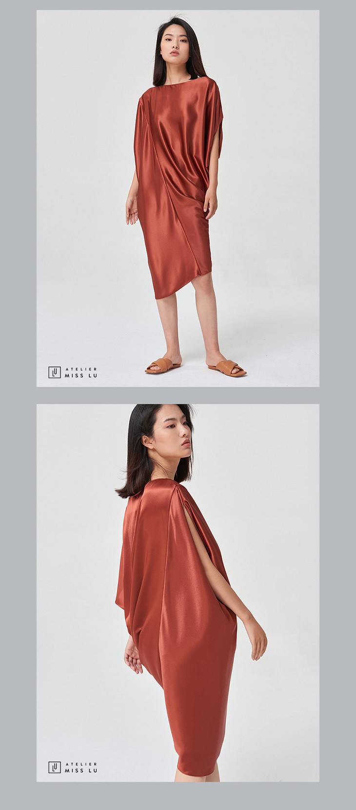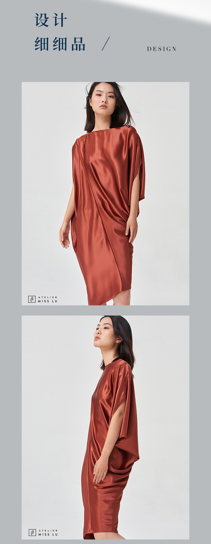 【丝缎霓裳】红铜色丝缎质感立裁不规则连衣裙