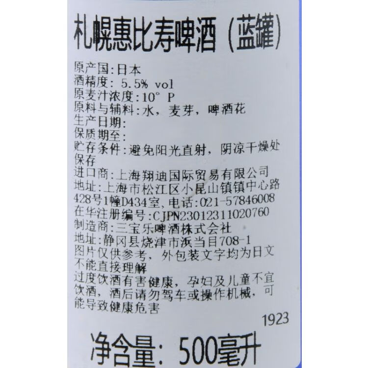 札幌惠比寿啤酒蓝罐500ml酒精度(5.5%vol)