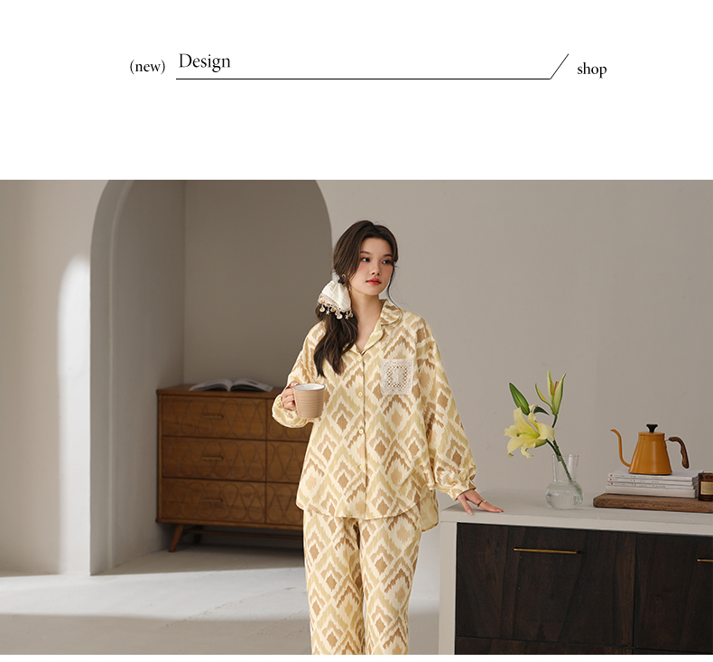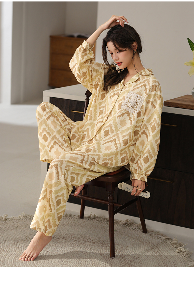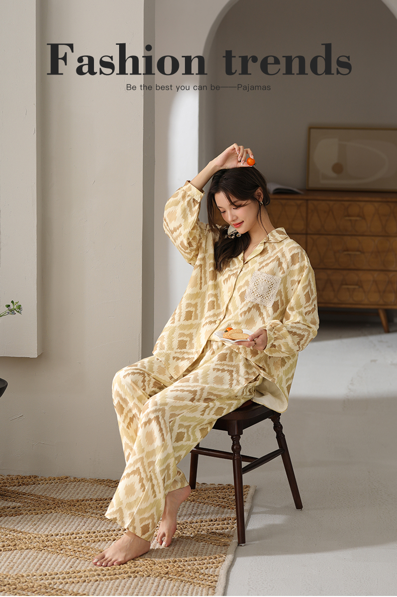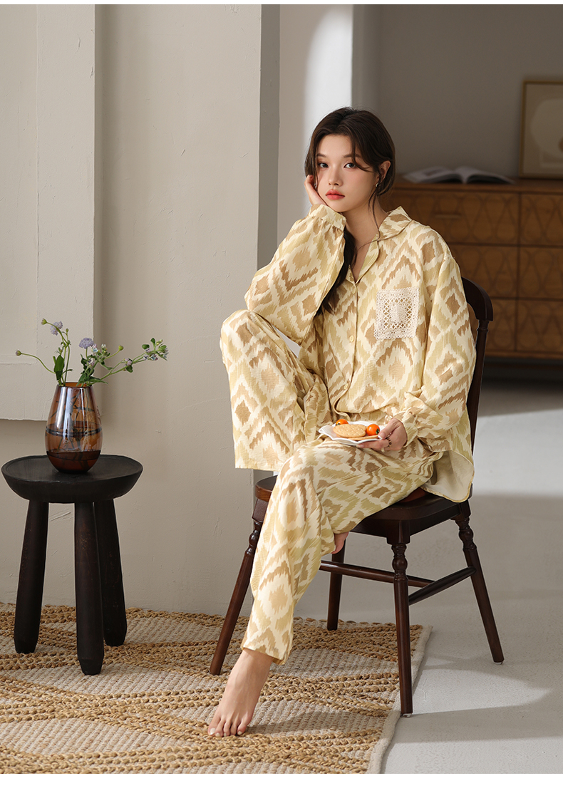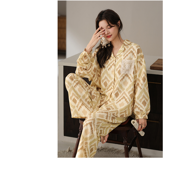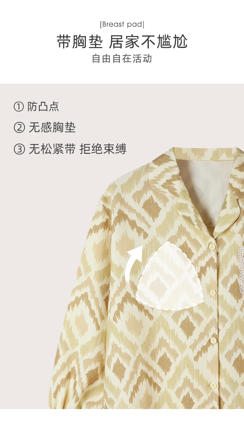 可人儿春秋季带胸垫泡泡绵女士长袖长裤睡衣可外出小众家居服套装
