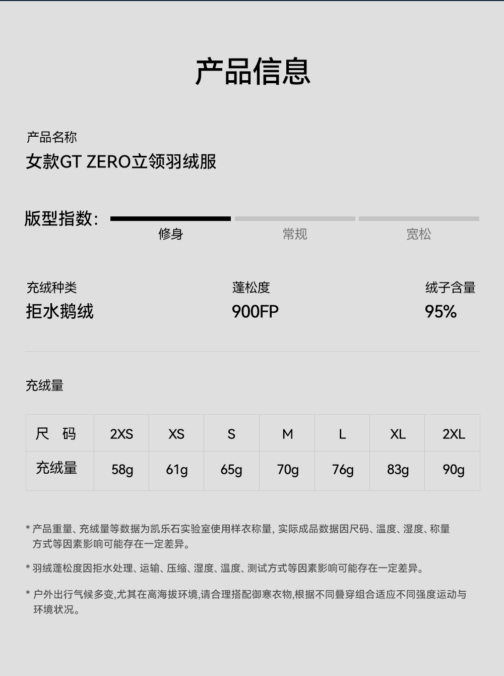 KAILAS凯乐石 女款GT ZERO立领羽绒服 KG2533208【Z】