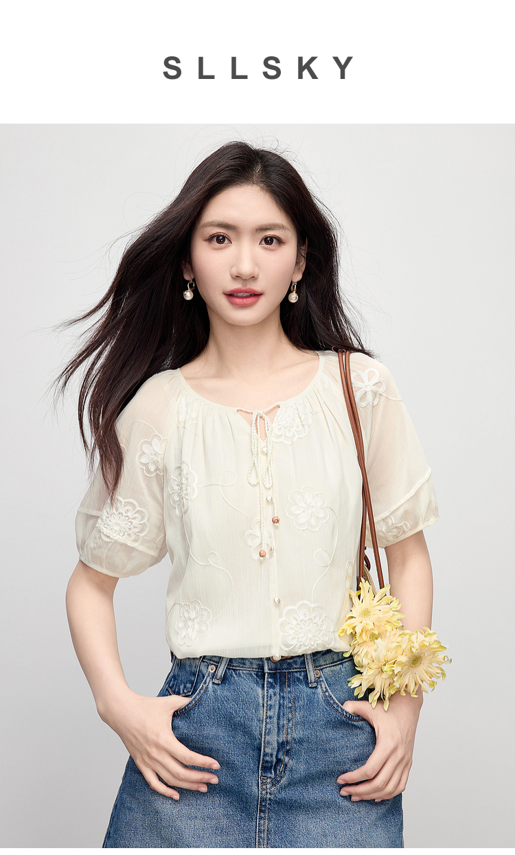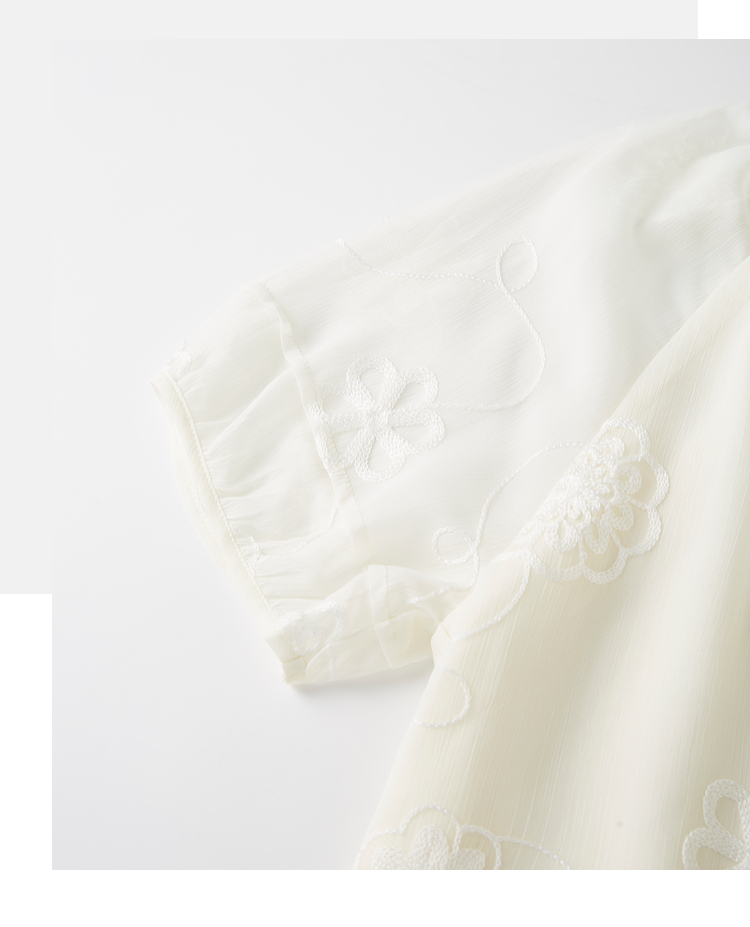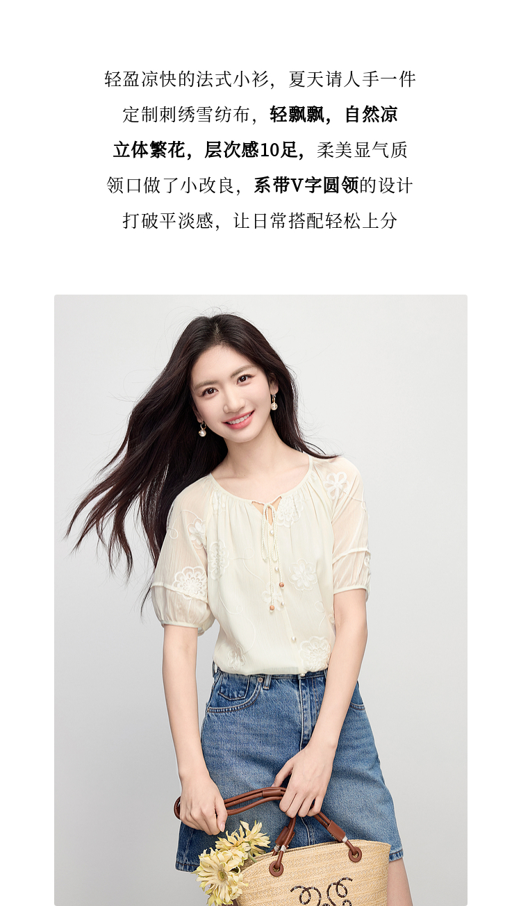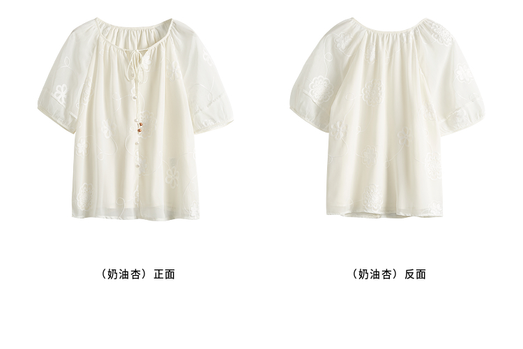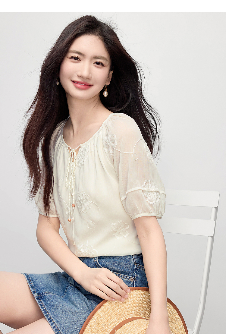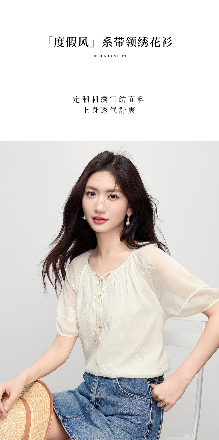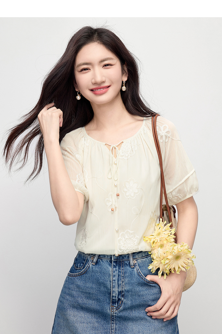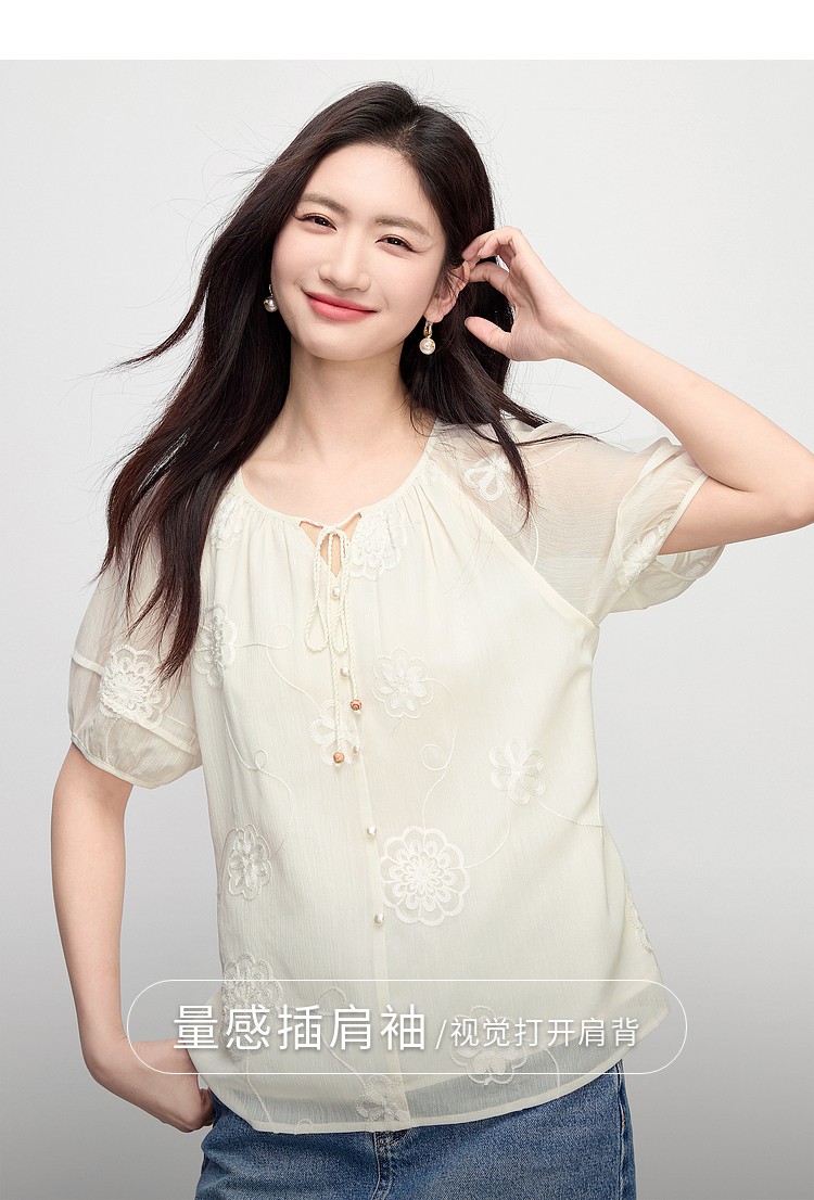 【周末秒杀】熙世界法式雪纺衬衫女夏季2025新款女装轻盈气质短袖绣花小衫上衣
