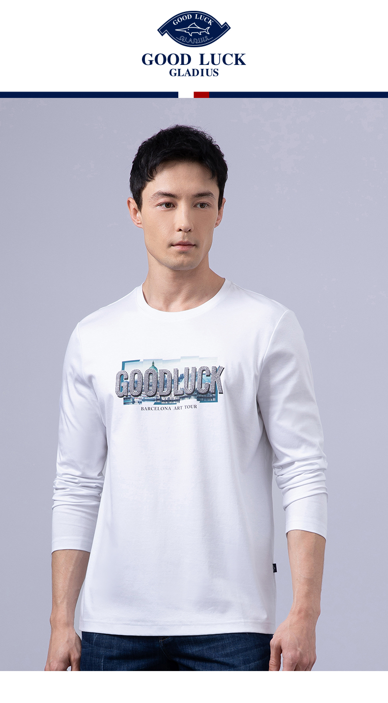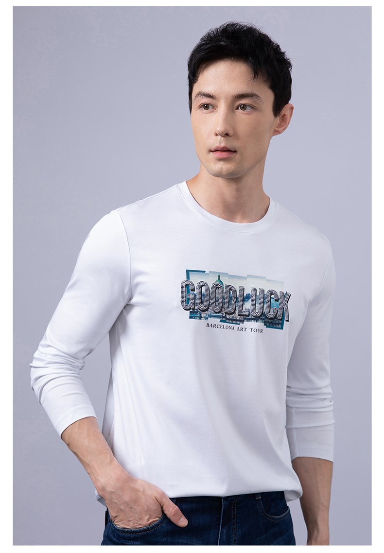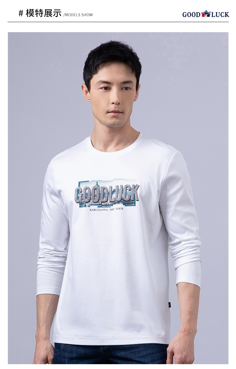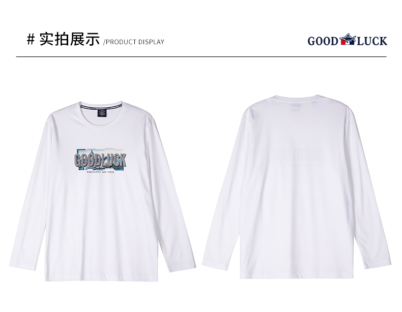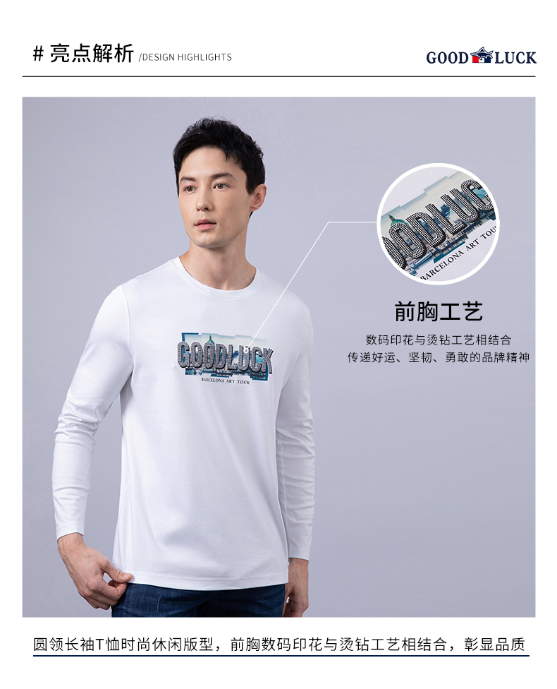 GOOD LUCK/德鲨100%棉亲肤舒适前胸烫钻工艺圆领长袖T恤LY12202-818