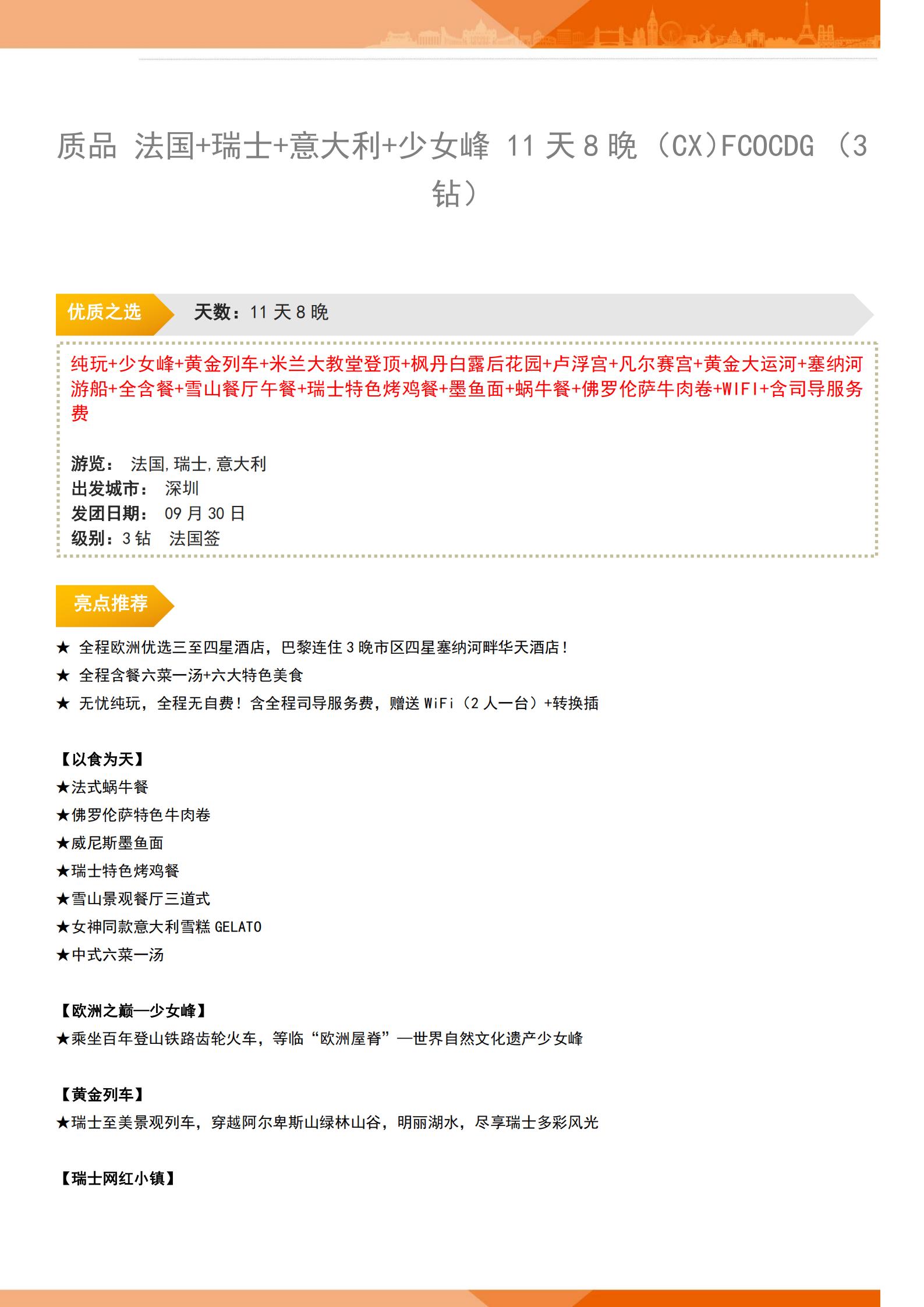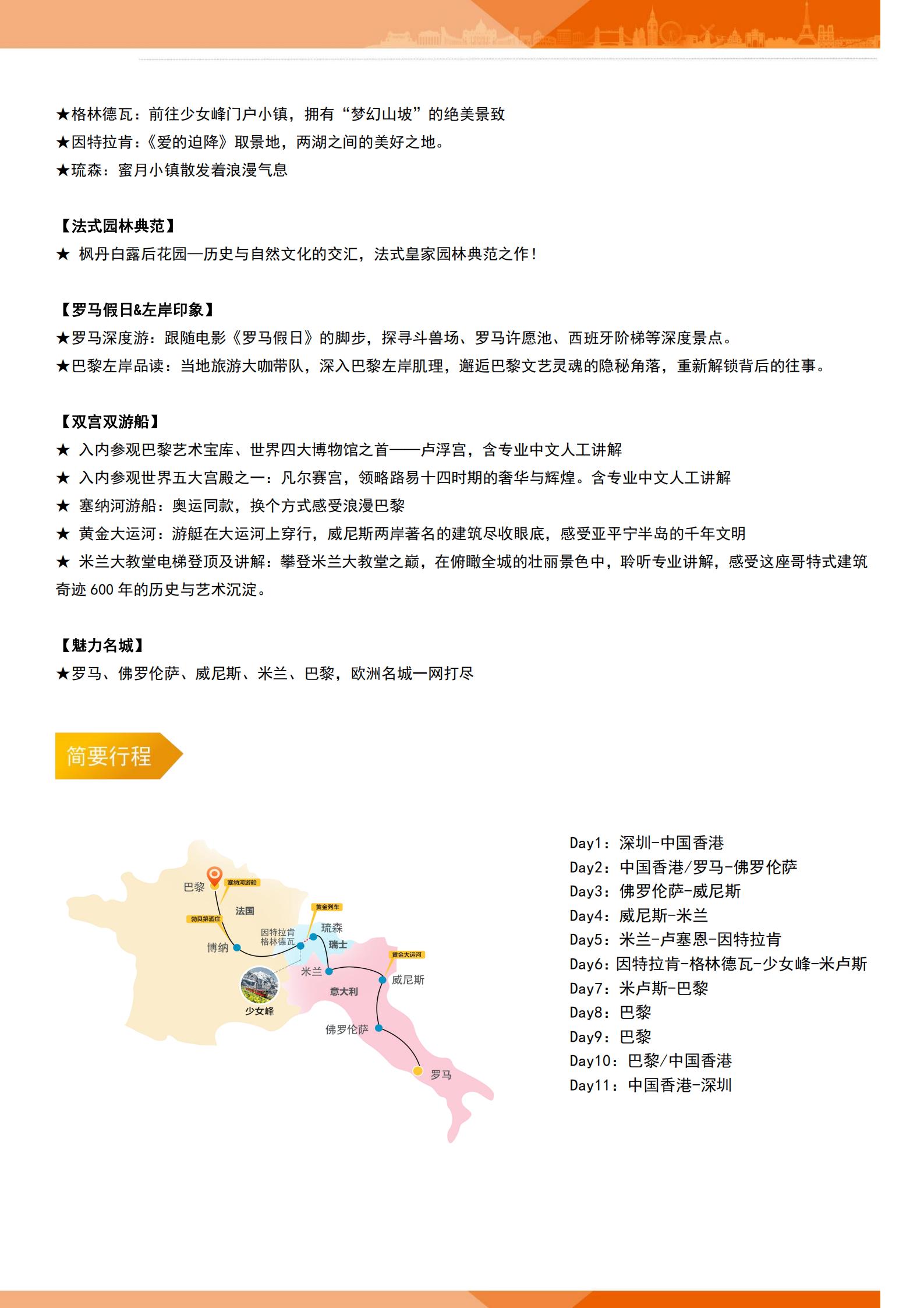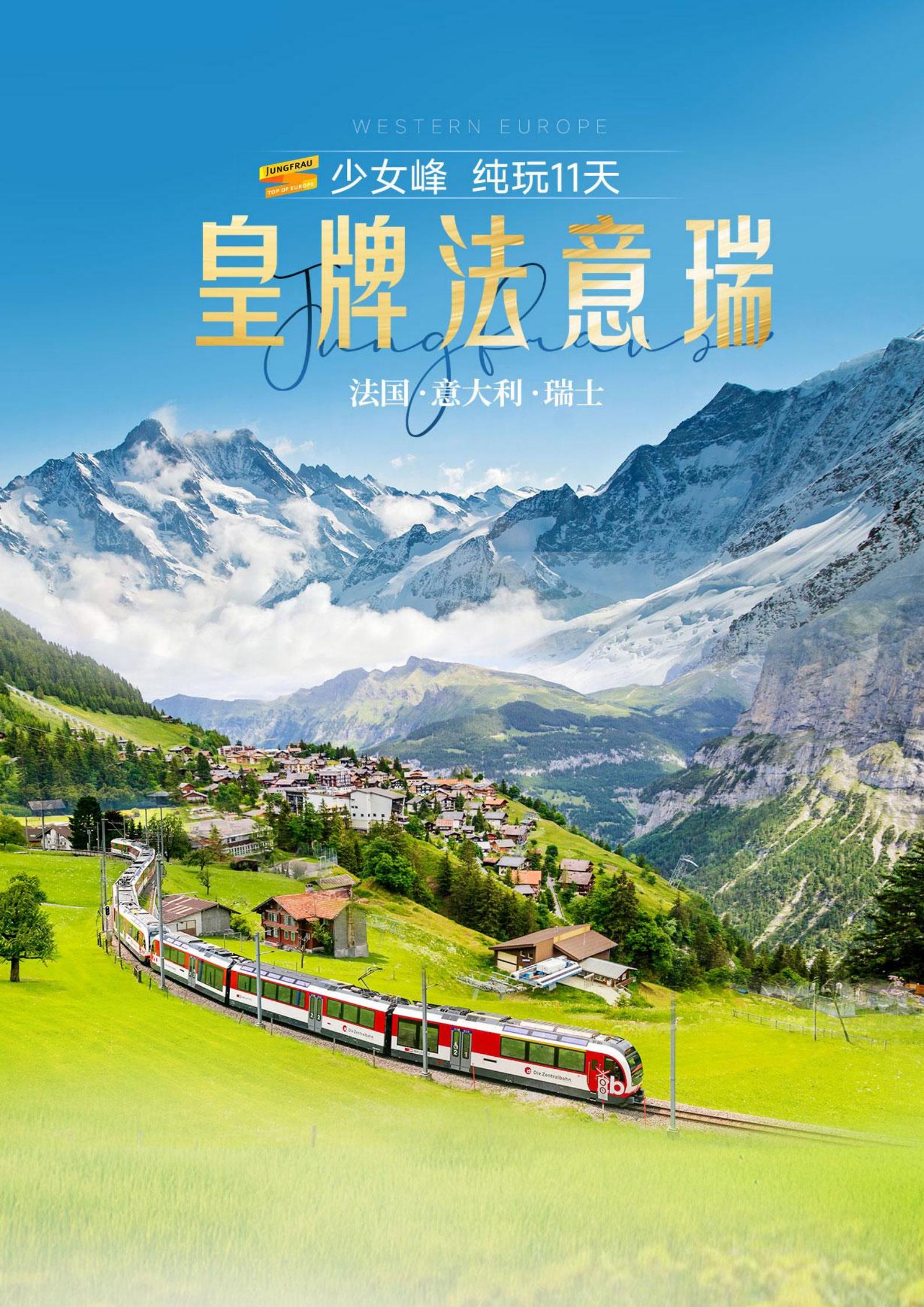 【国庆】<法国+瑞士+意大利+少女峰西欧3国11天8晚-深圳直飞>黄金列车+米兰大教堂登顶+枫丹白露后花园+卢浮宫+凡尔赛宫+黄金大运河+塞纳河游船+全含餐+雪山餐厅午餐+瑞士特色烤鸡餐