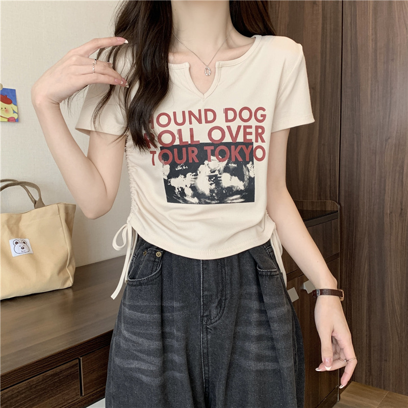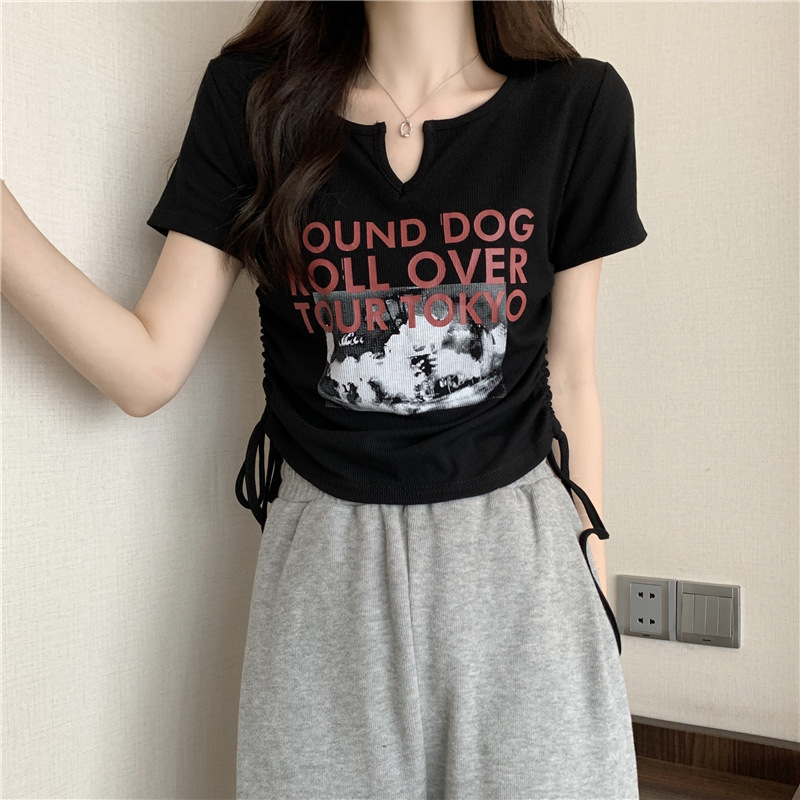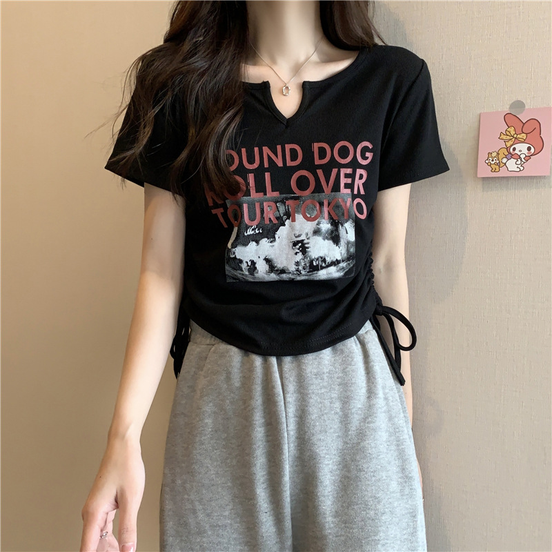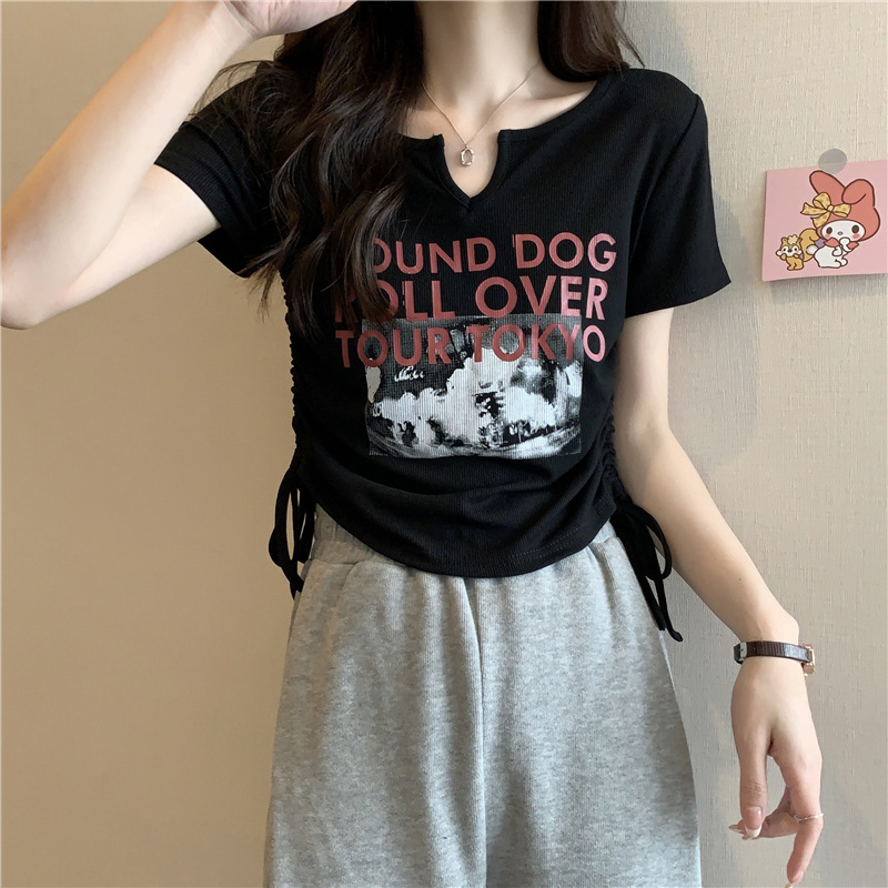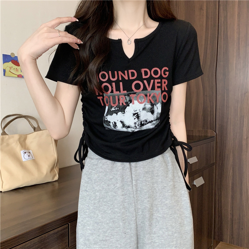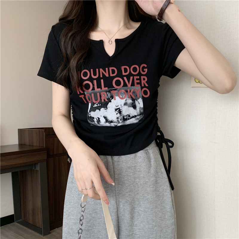 【微胖上衣女夏 韩系设计感修身显瘦遮肚短款上衣】修身显瘦、遮肚短款,再搭配上抽绳短袖,勾勒出女性曲线,要让自己更美丽动人。ry