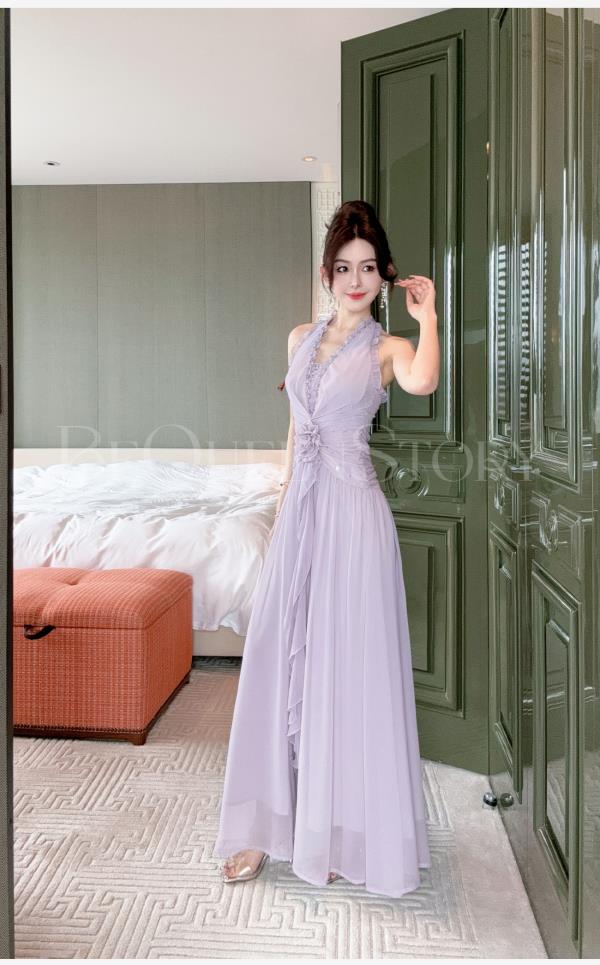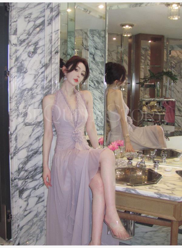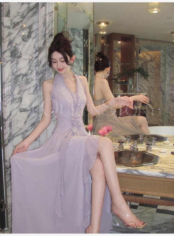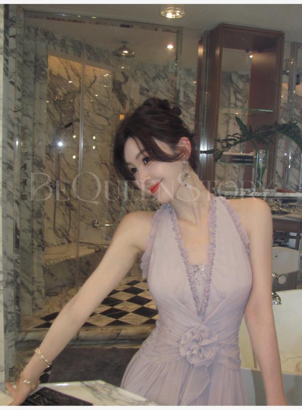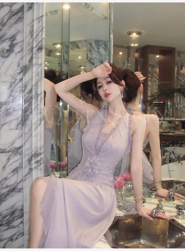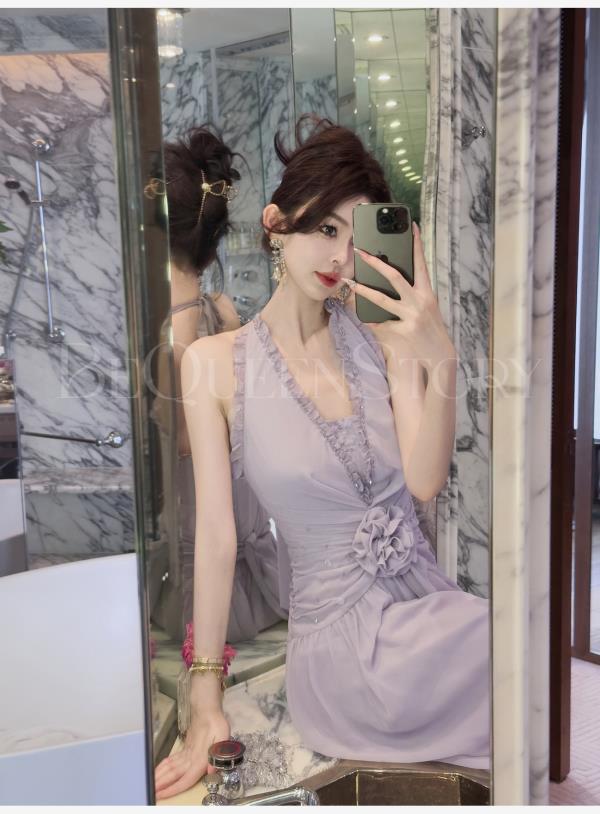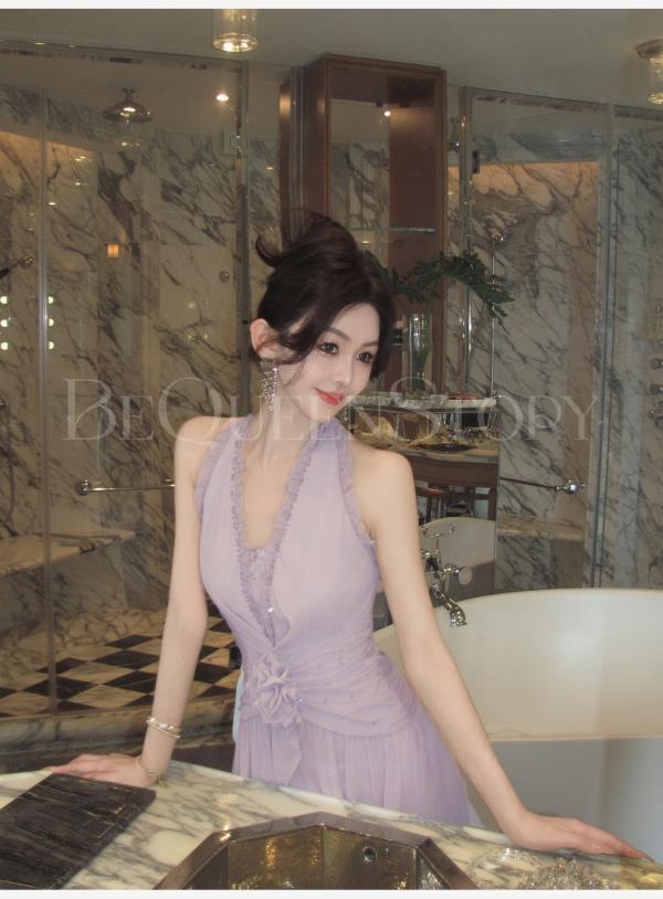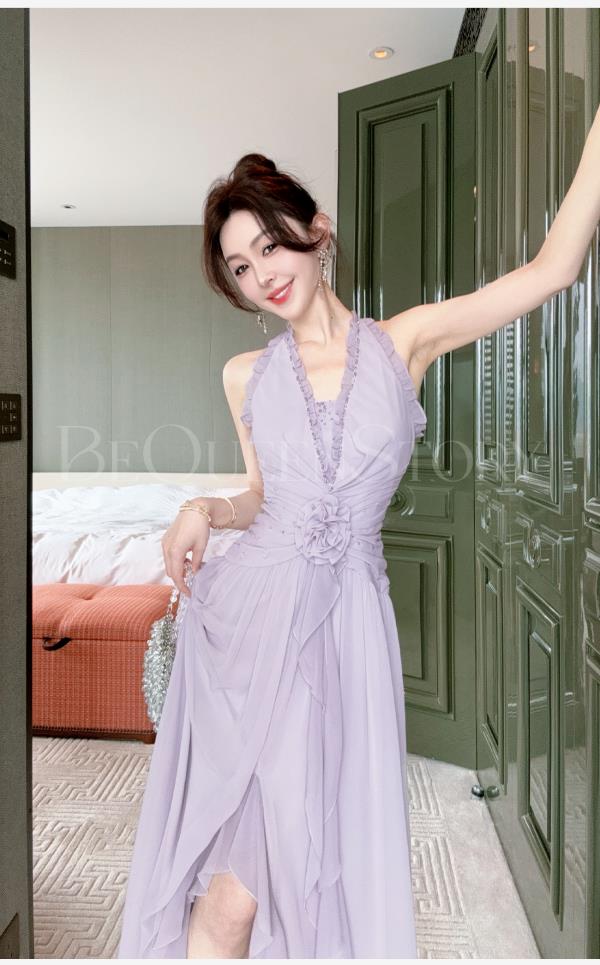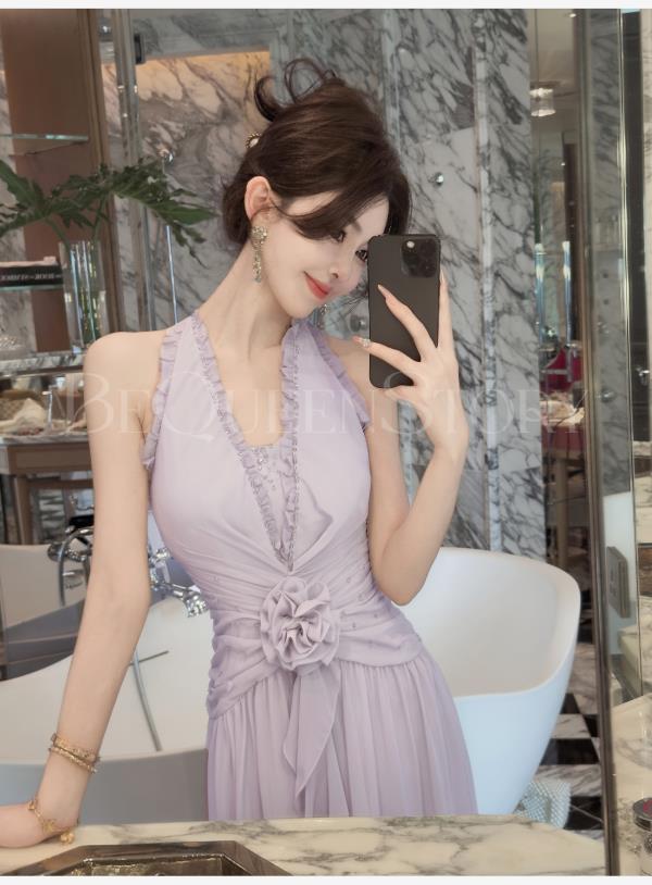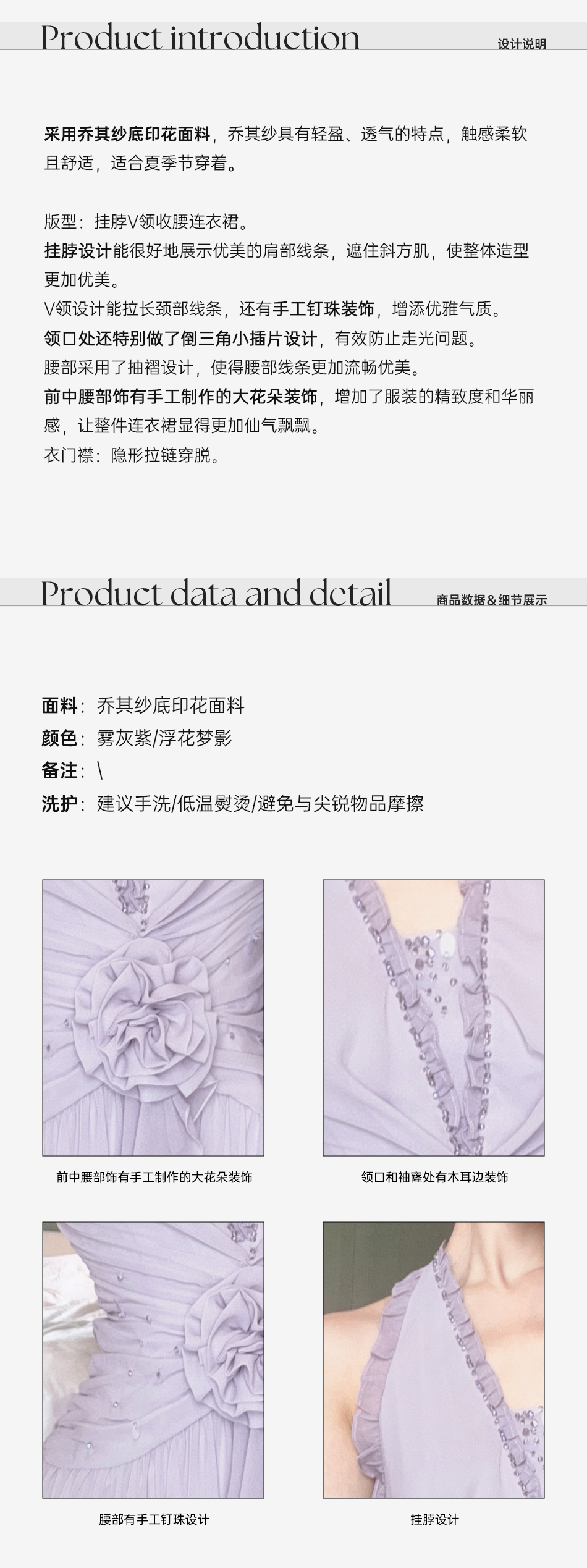 余潇潇【花影悦动】乔其纱手工钉珠印花挂脖V领收腰连衣裙时尚精致