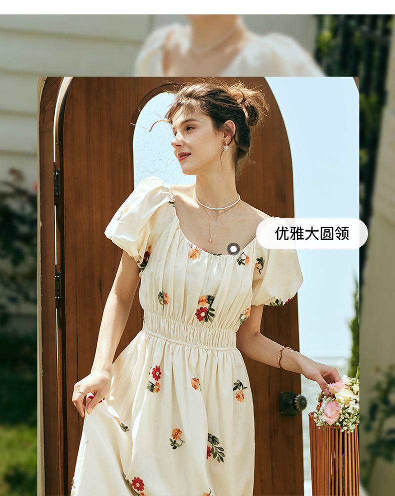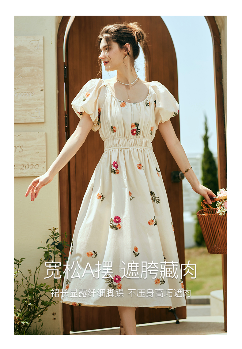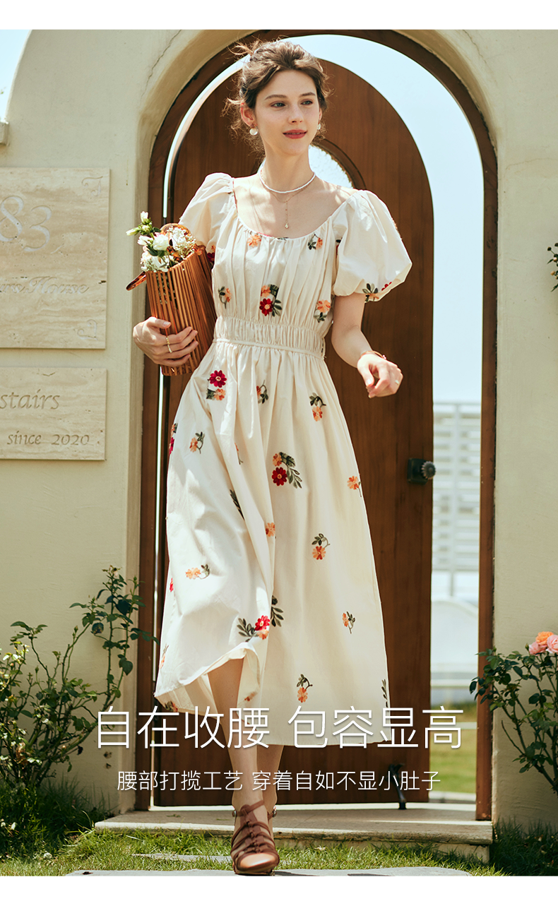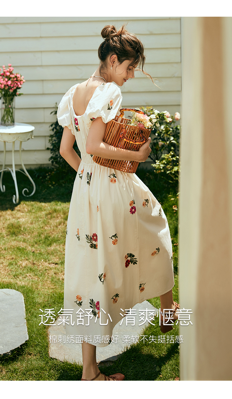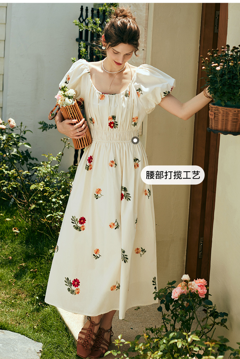 OLrain欧芮儿法式碎花方领连衣裙女夏季2023新款收腰肌理感刺绣裙