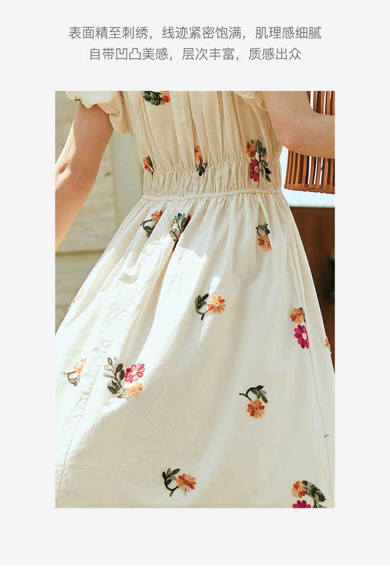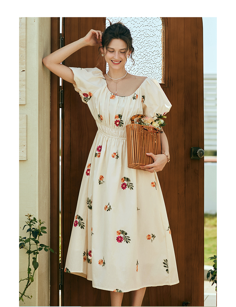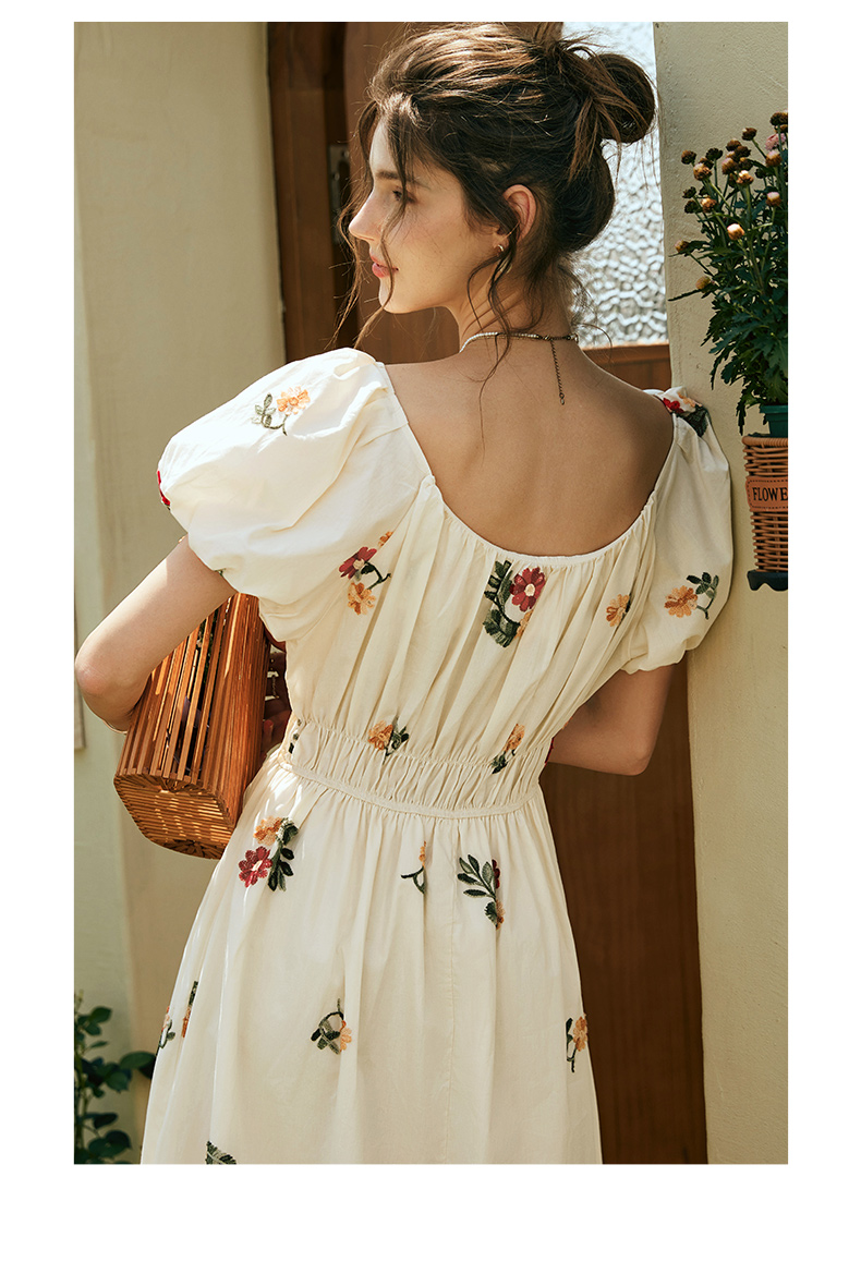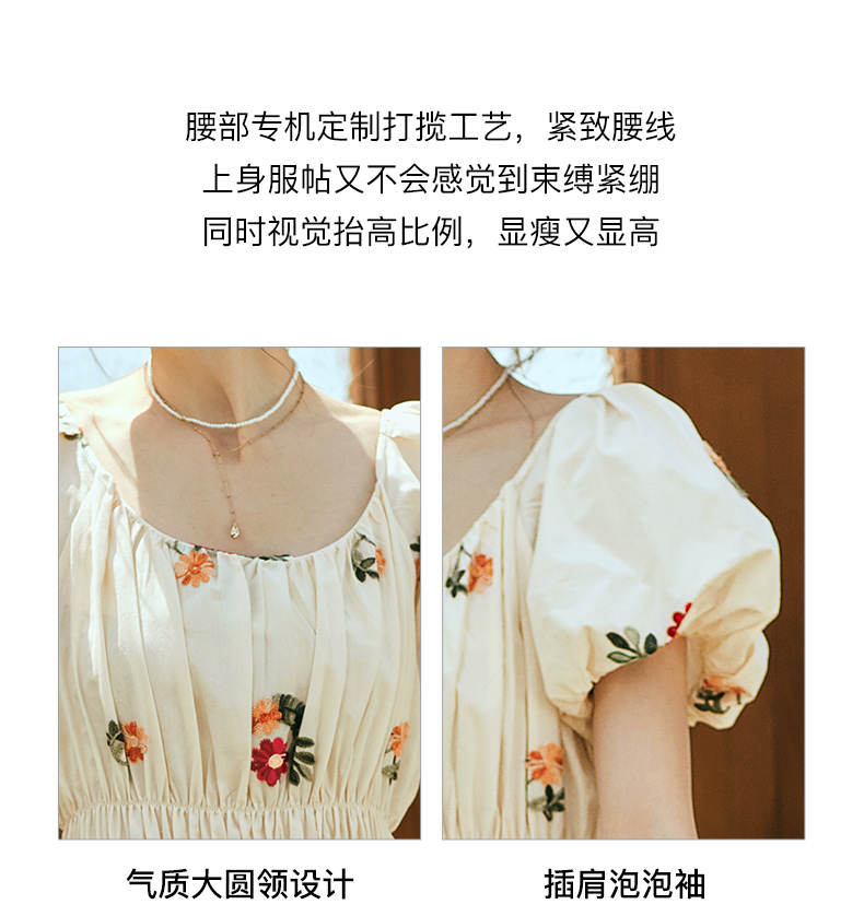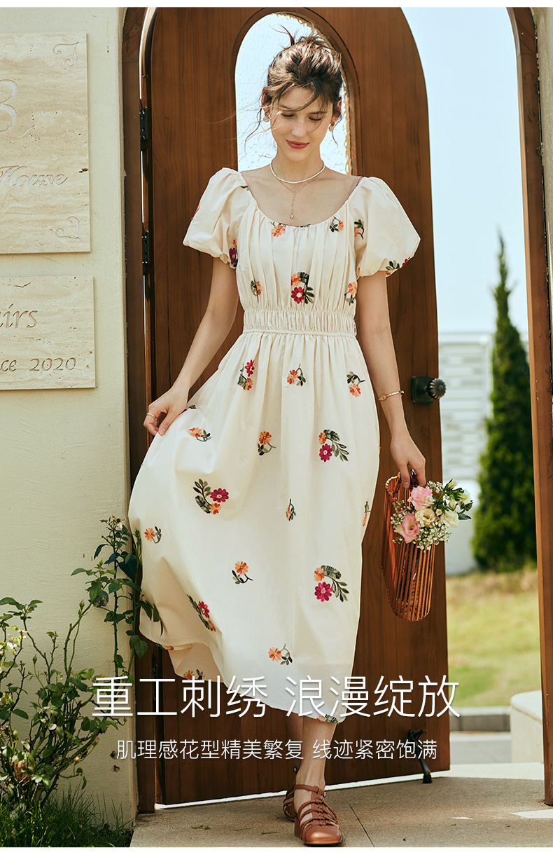 OLrain欧芮儿法式碎花方领连衣裙女夏季2023新款收腰肌理感刺绣裙