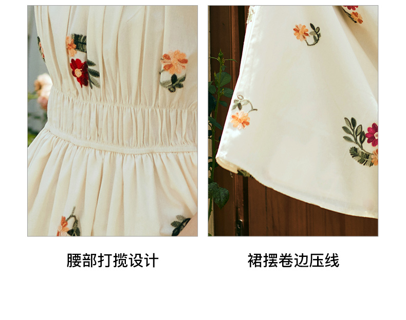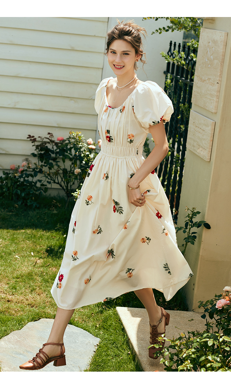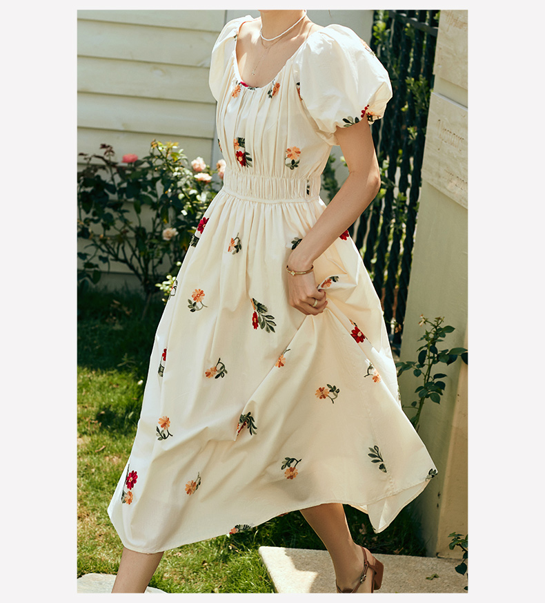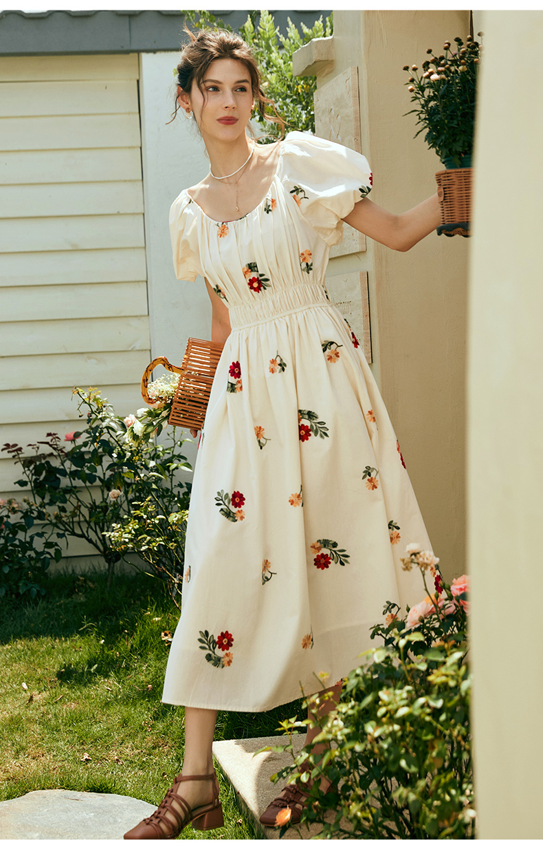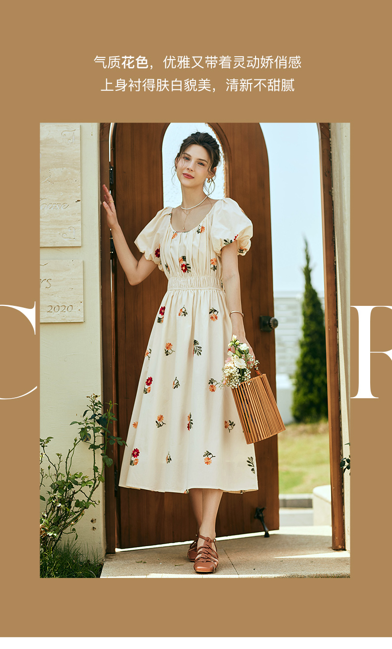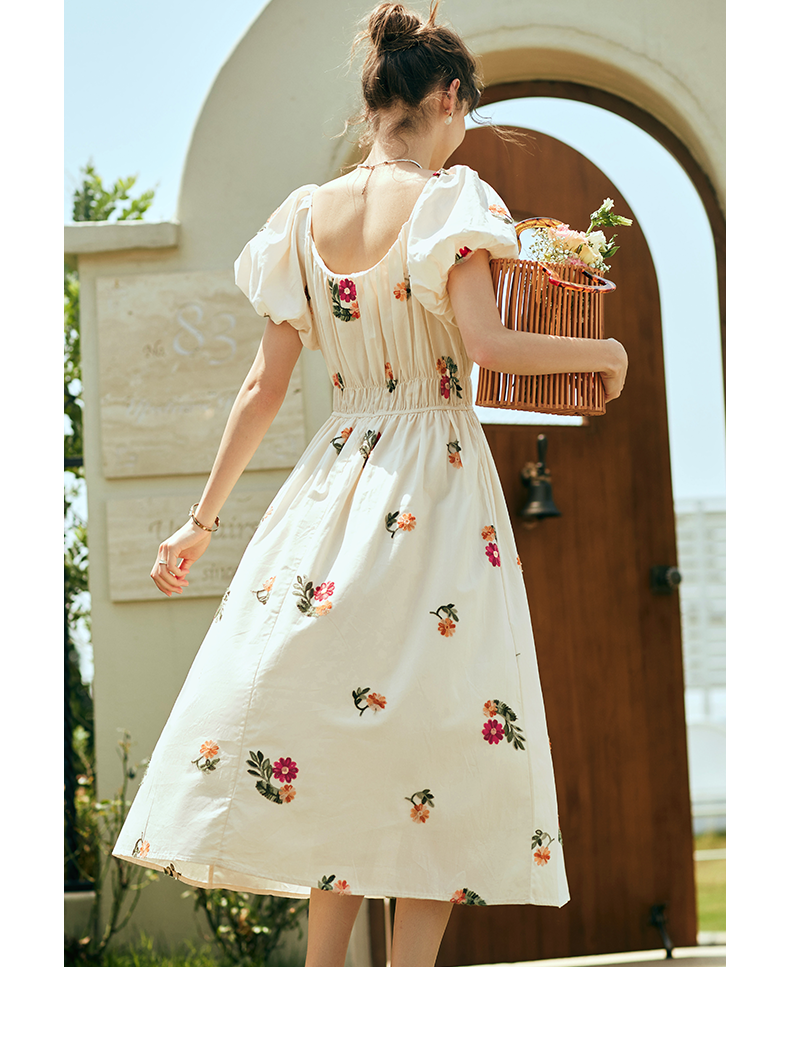 OLrain欧芮儿法式碎花方领连衣裙女夏季2023新款收腰肌理感刺绣裙