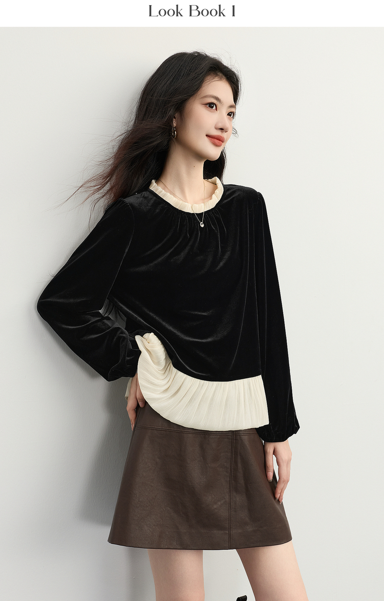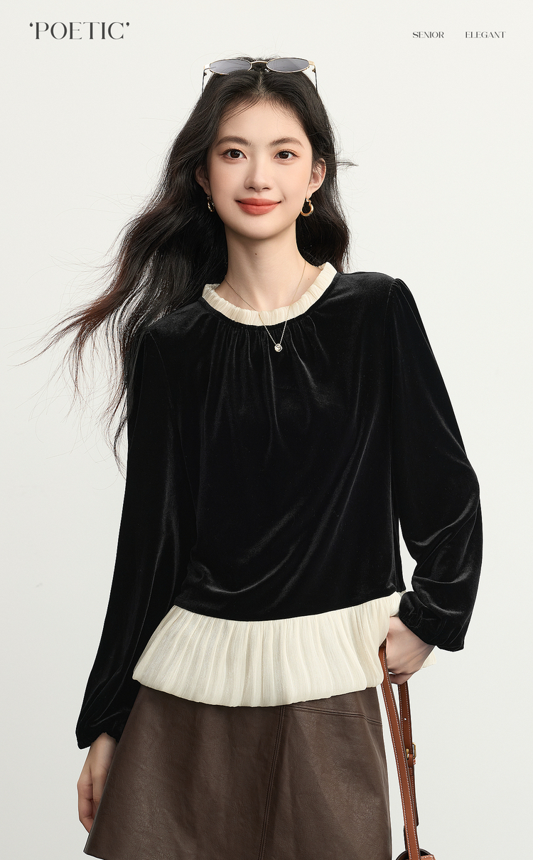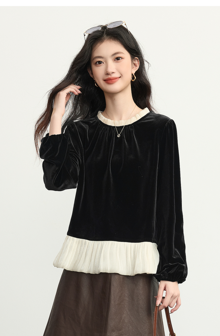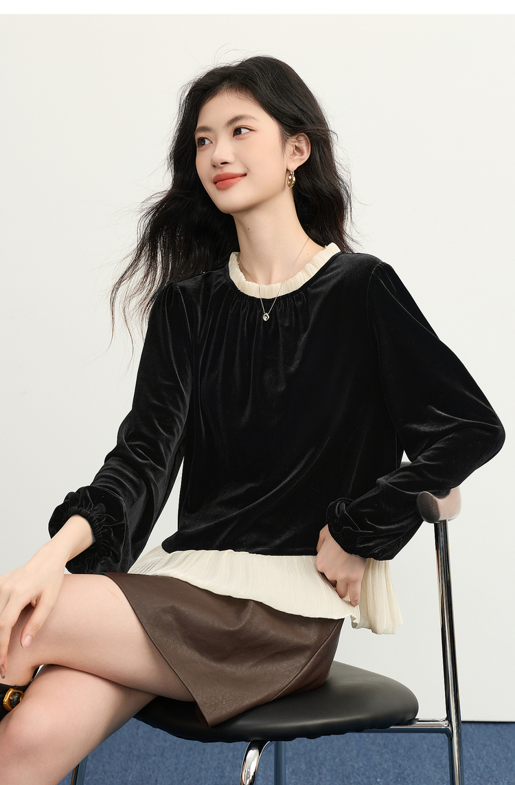 【12/03新品】熙世界鎏光复古丝绒衬衫女秋冬新款法式撞色荷叶边宽松假两件上衣