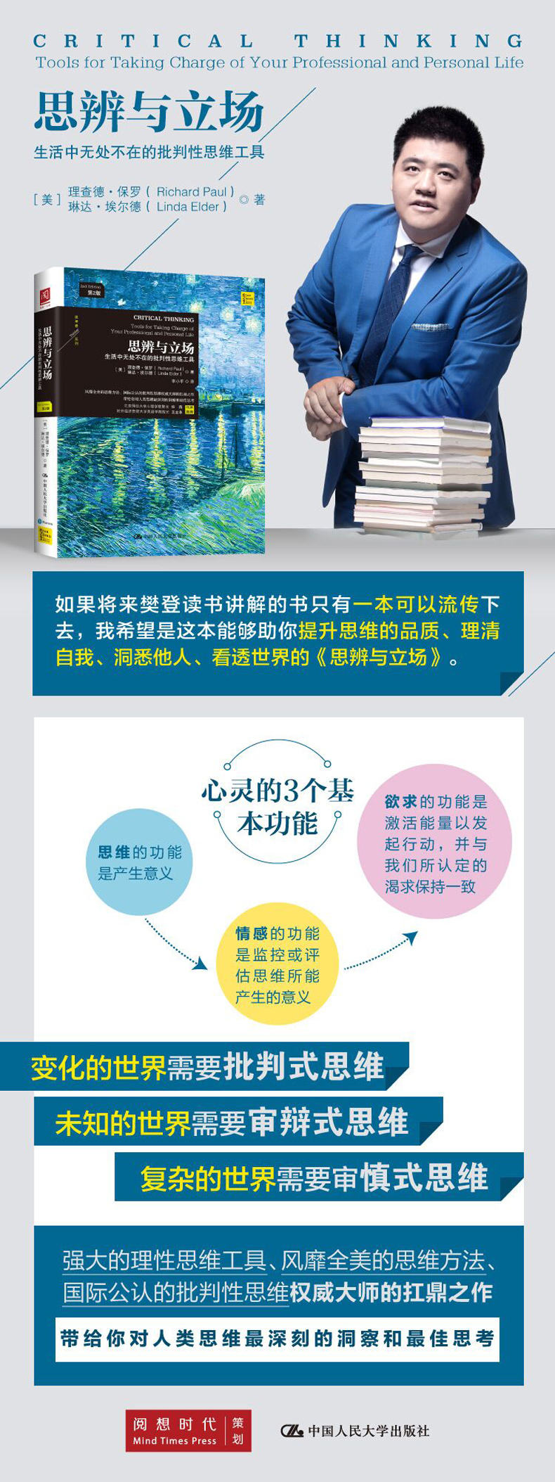 人民大学出版社的新书《思辨与立场》,邀请我写一个推荐序。我对如何提高大学生思辨能力一直在思考和寻找方法,当我一口气读完本书,似乎有了答案。在此,我特别希望和读者分享本书和我的读后感。全球化正快速且深刻地改变着我们生存的世界,我们进行自我剖析的能力将决定着我们的工作、生活和命运。传统和固化的思维方式会禁锢我们的发展,这就需要我们运用批判性思维不断学习、经常反思,定期评估自己的工作和生活方式。