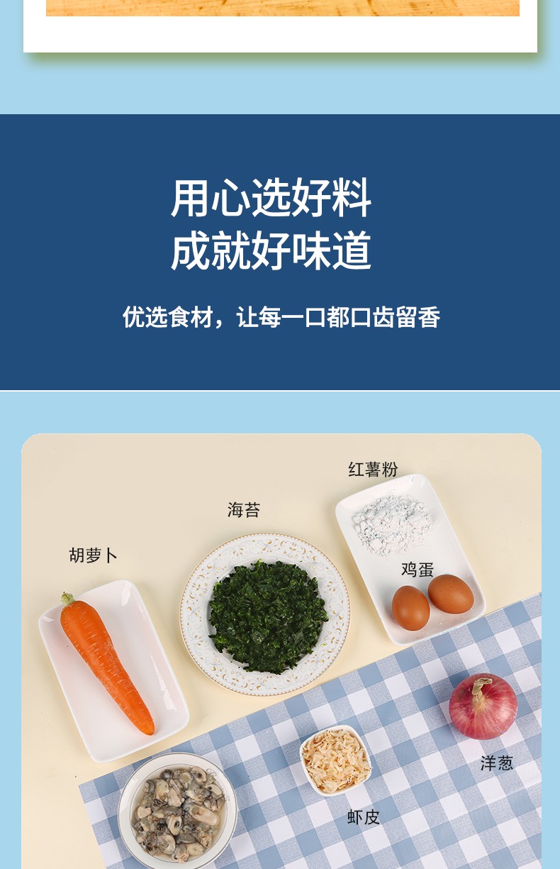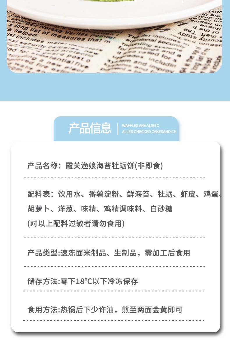 【产品配料】鲜海苔、牡蛎、饮用水、淀粉、小麦粉、虾皮、鸡蛋、洋葱、味精、鸡精调味料、白砂糖