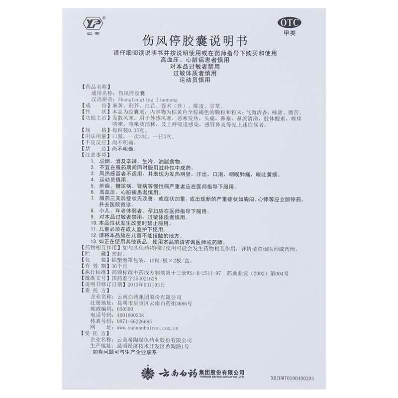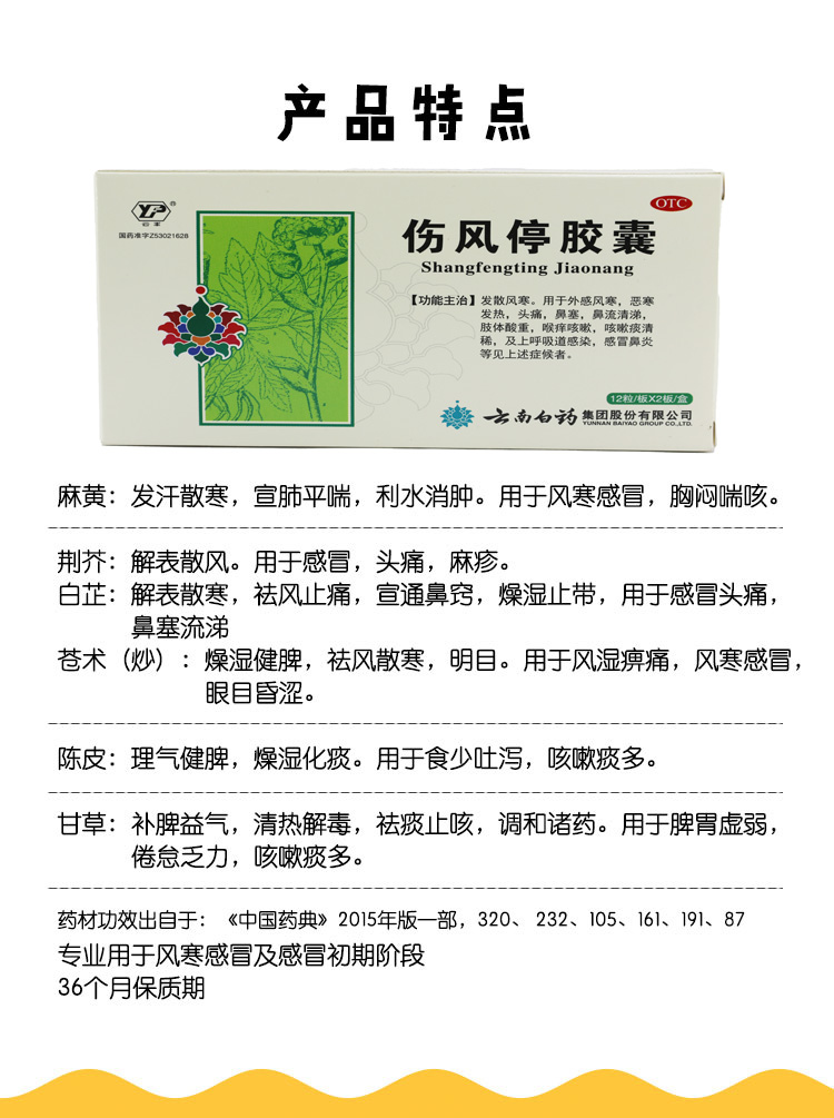 【官方正品】云南白药云丰伤风停胶囊0.35g*12粒*2板 发散风寒