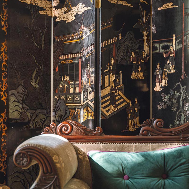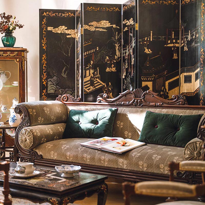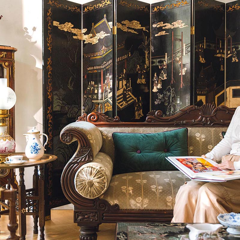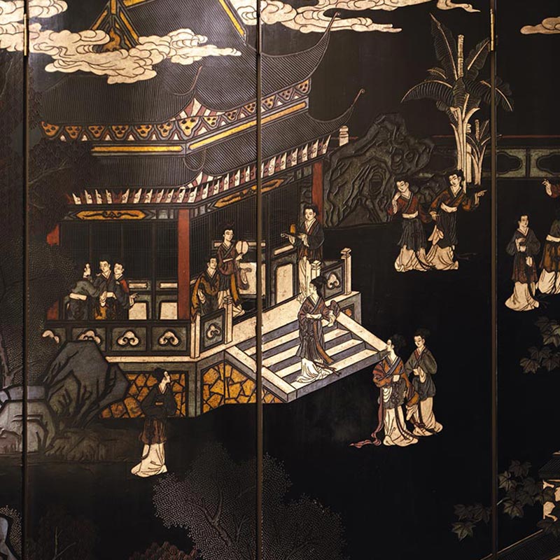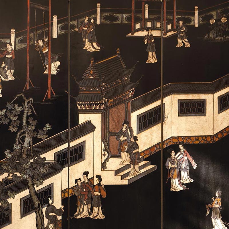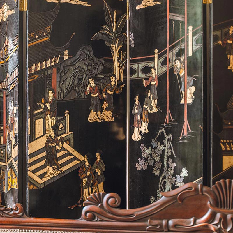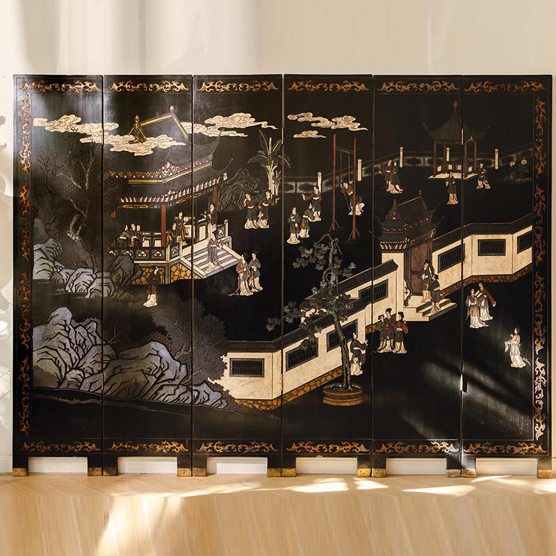 19世纪末20世纪初中国出品庭院仕女主题黑漆地款彩双面六曲屏风
