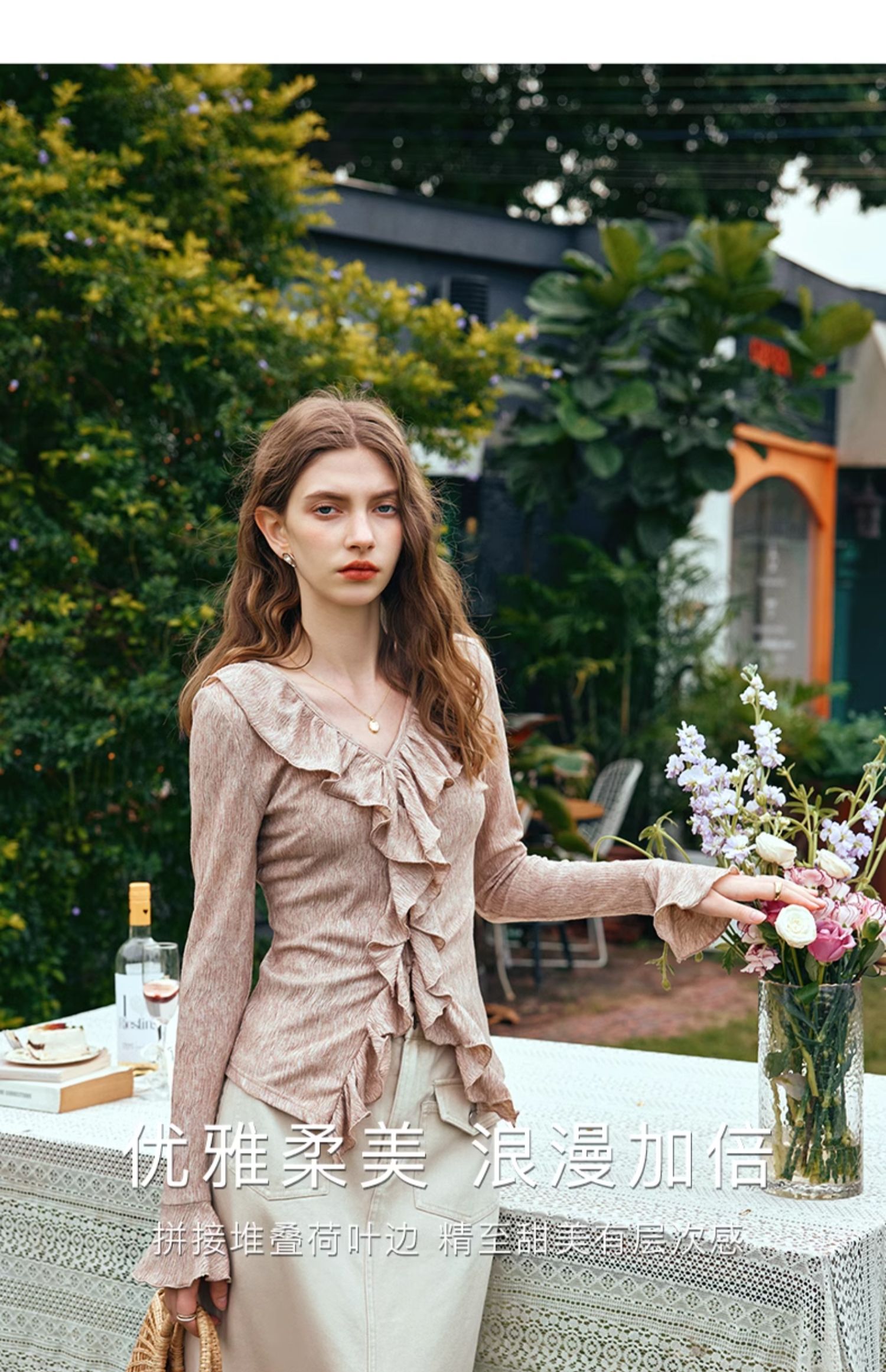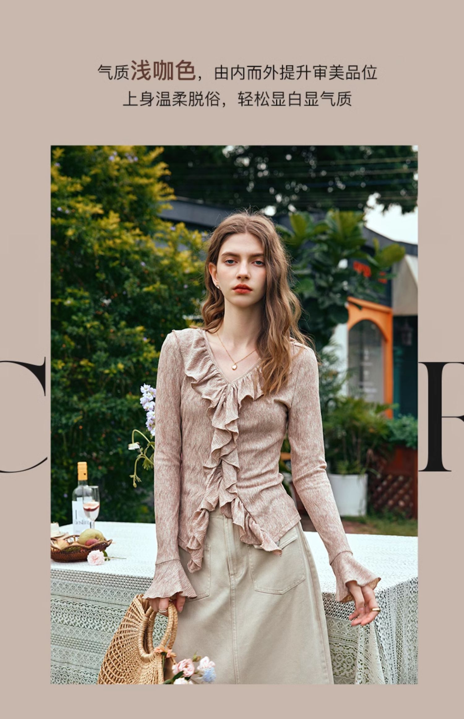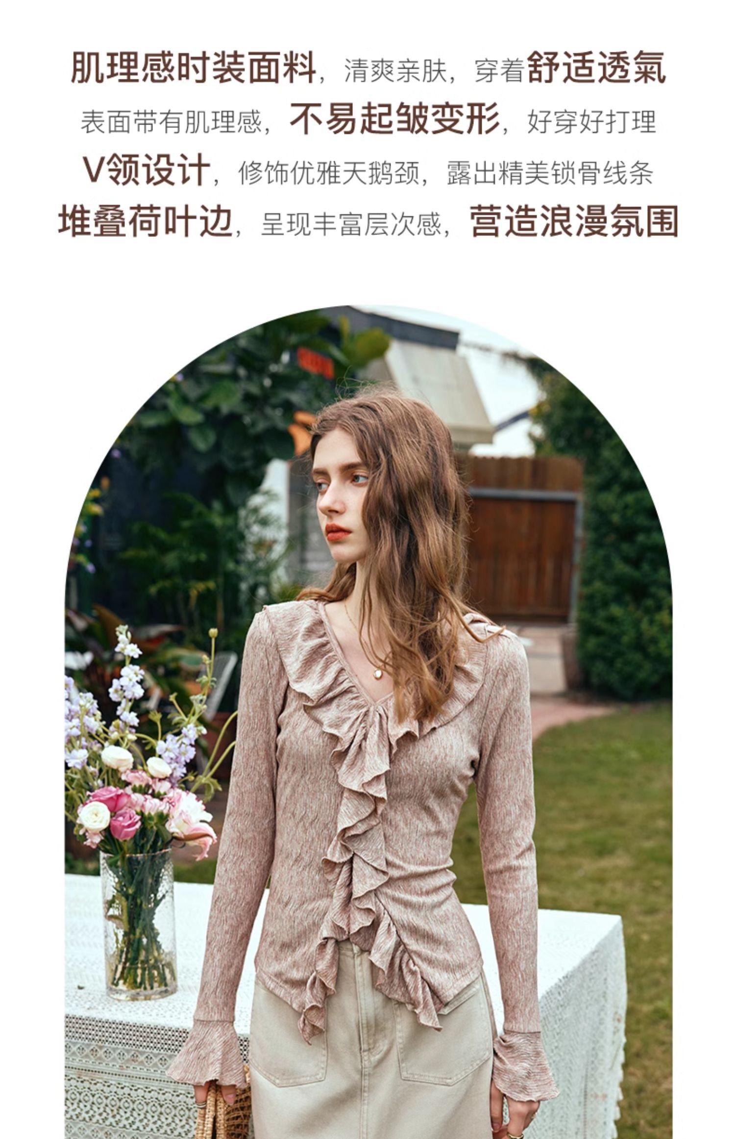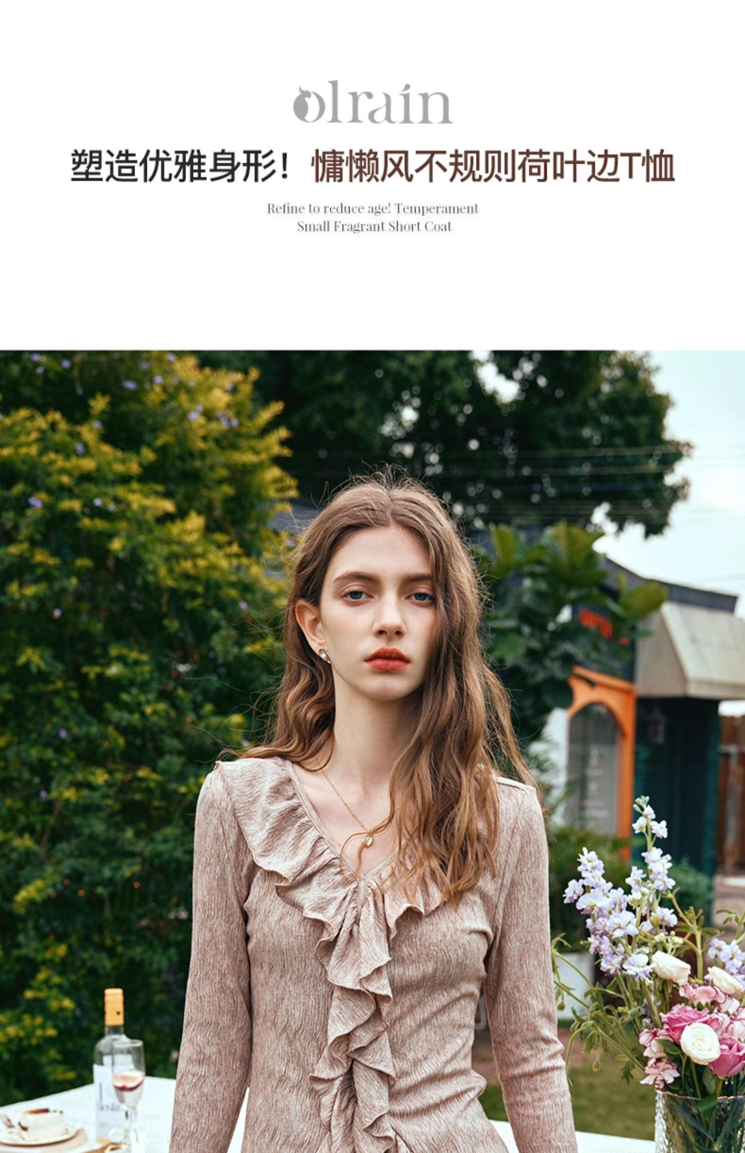 OLrain欧芮儿长袖T恤女春季2024新款慵懒风不规则荷叶边针织上衣