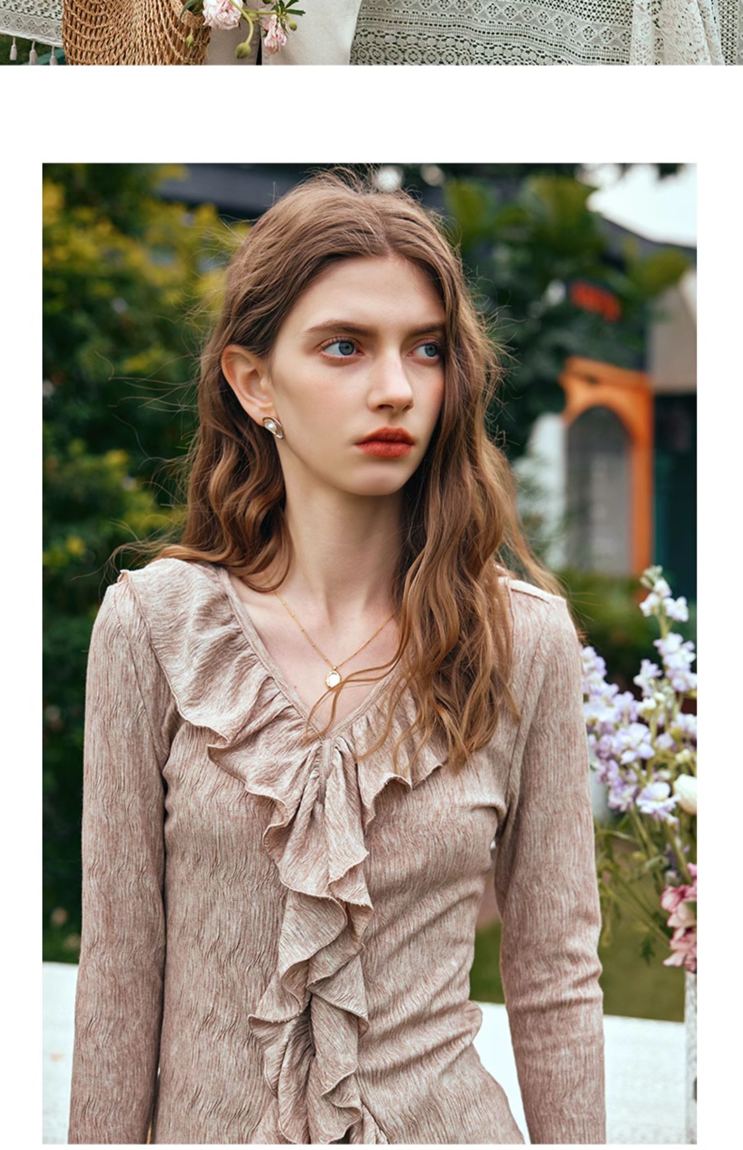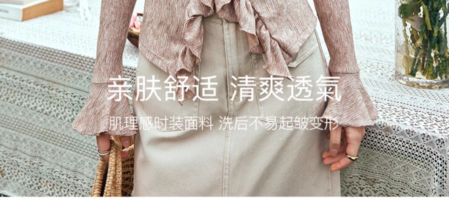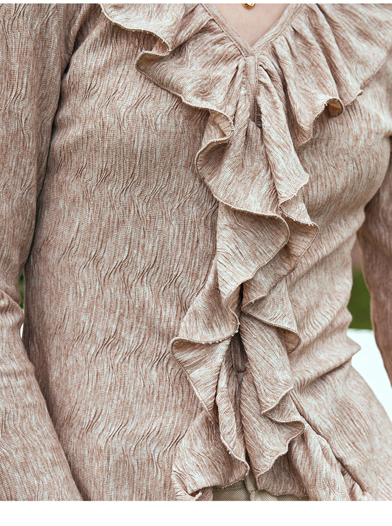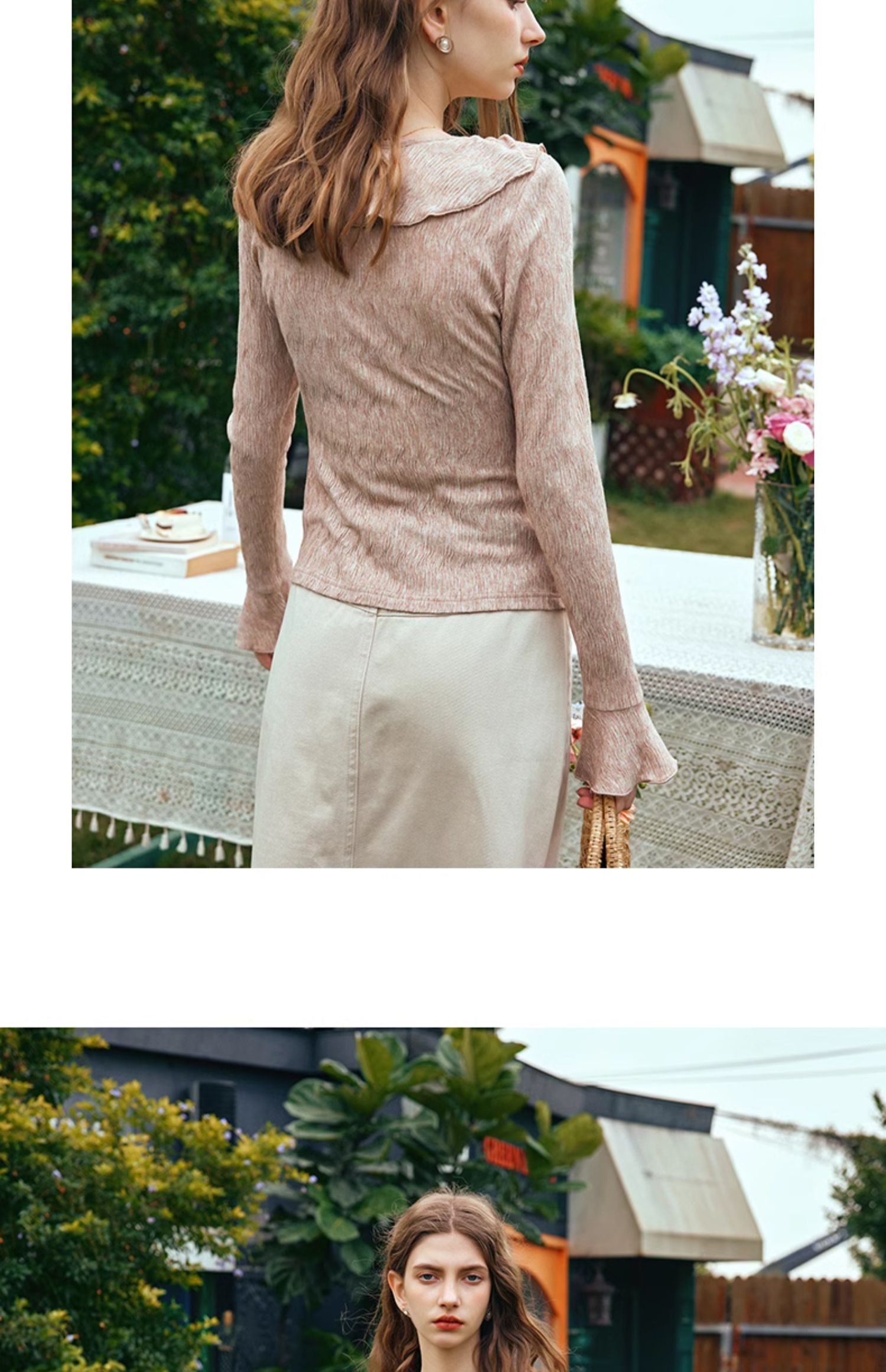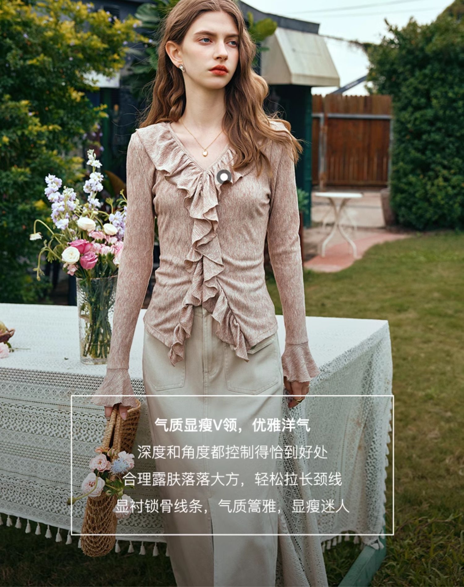 OLrain欧芮儿长袖T恤女春季2024新款慵懒风不规则荷叶边针织上衣