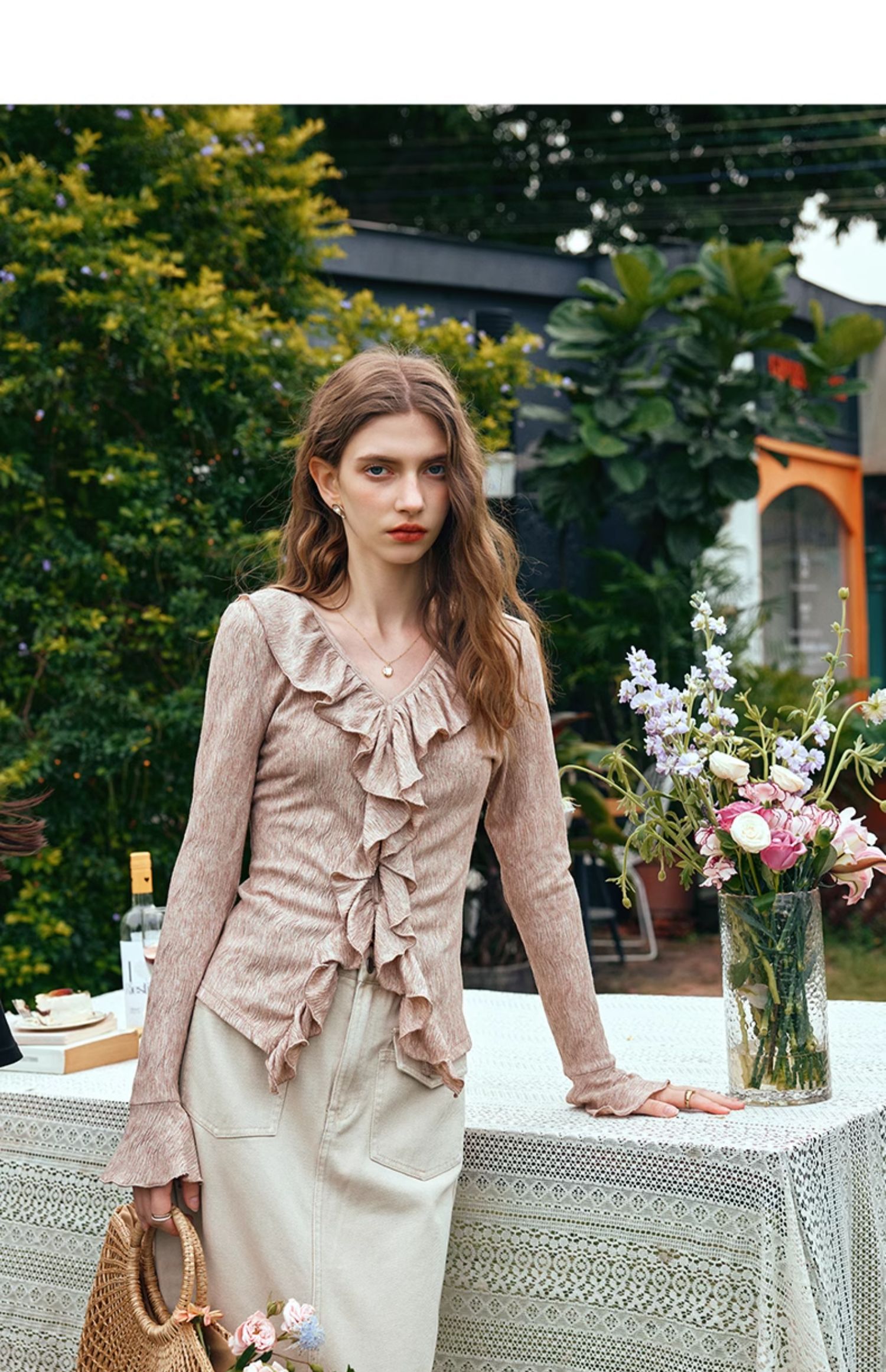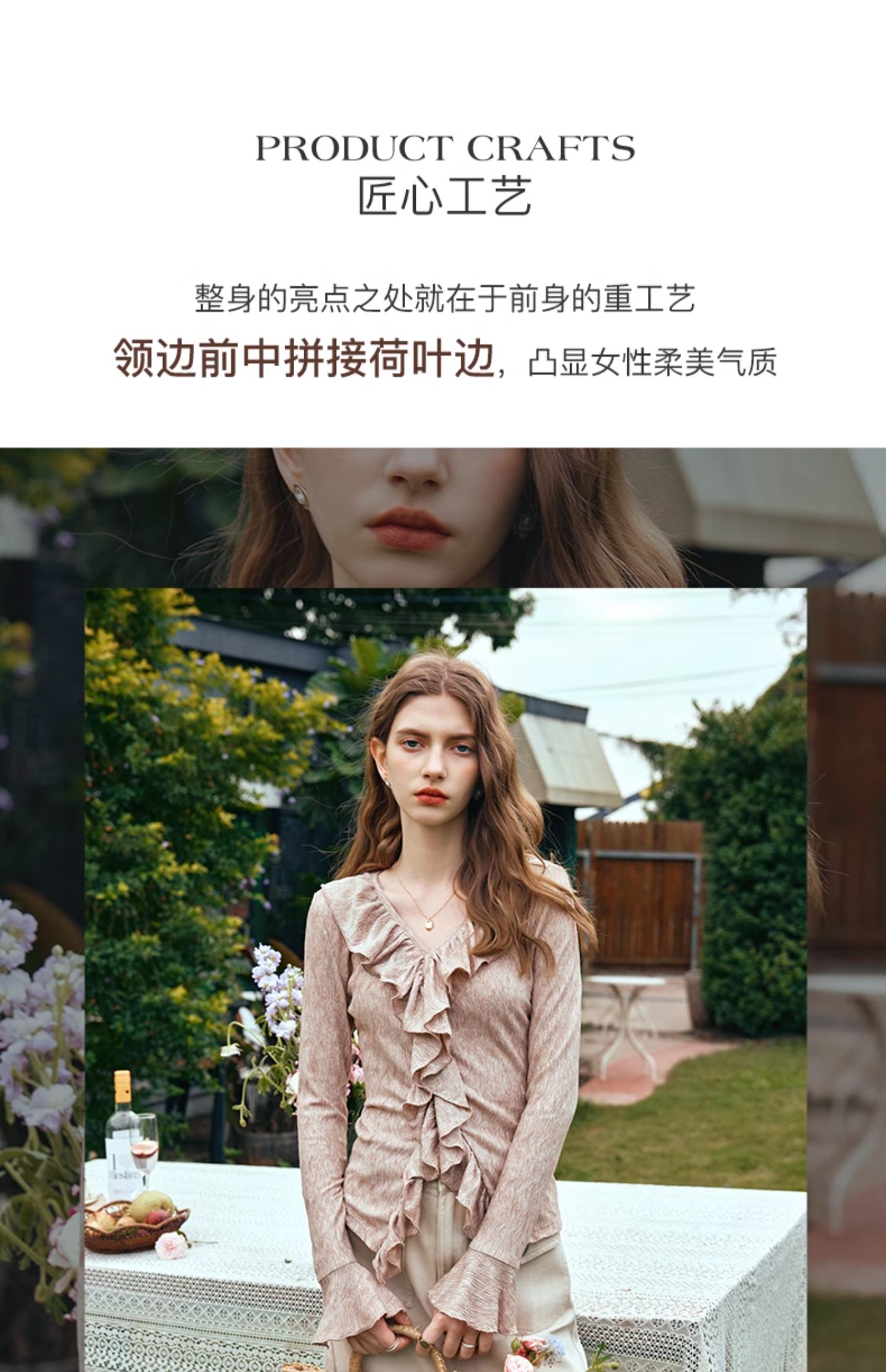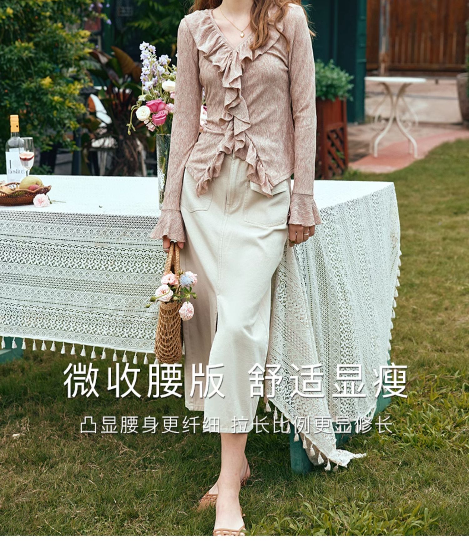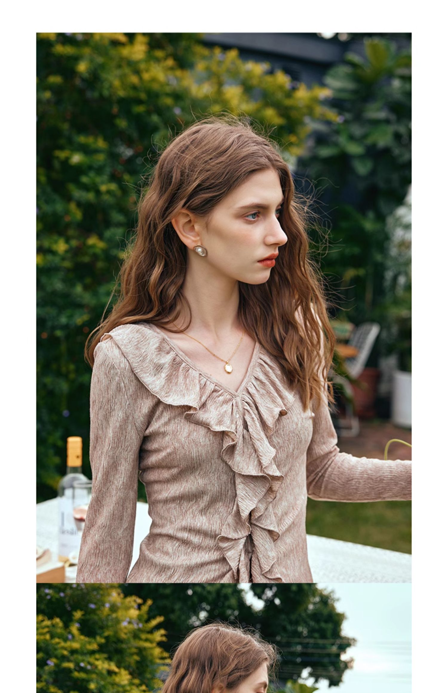 OLrain欧芮儿长袖T恤女春季2024新款慵懒风不规则荷叶边针织上衣