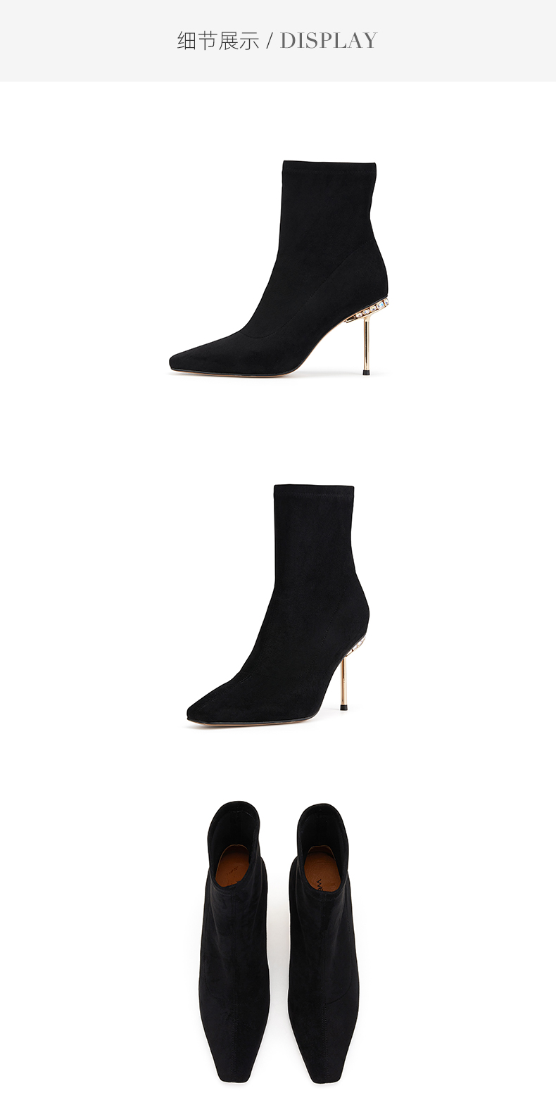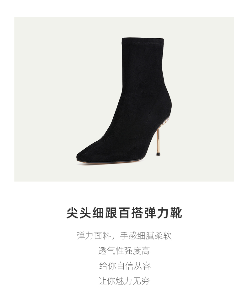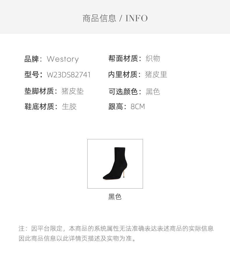 westory2023秋季新款尖头弹力靴子细跟百搭黑色高跟短靴W23DS82741