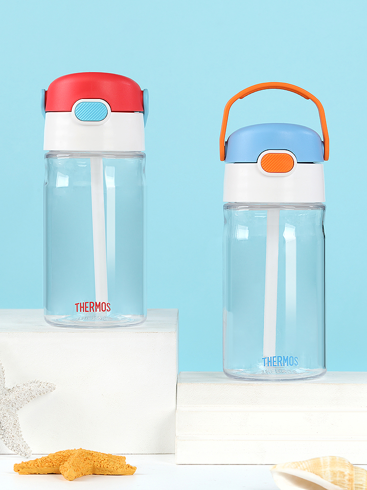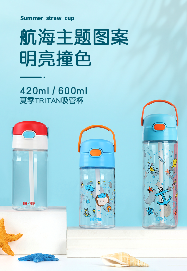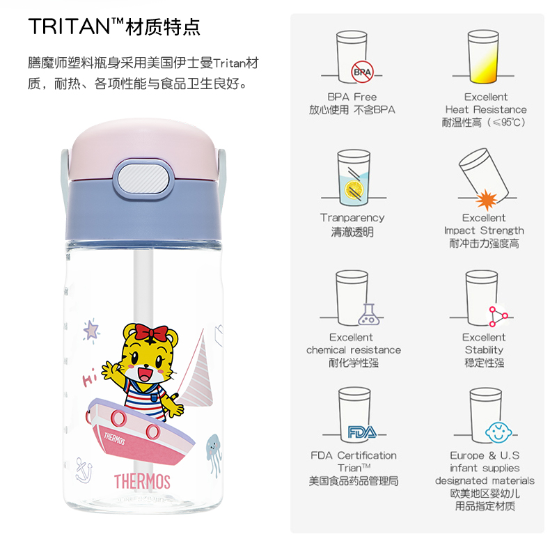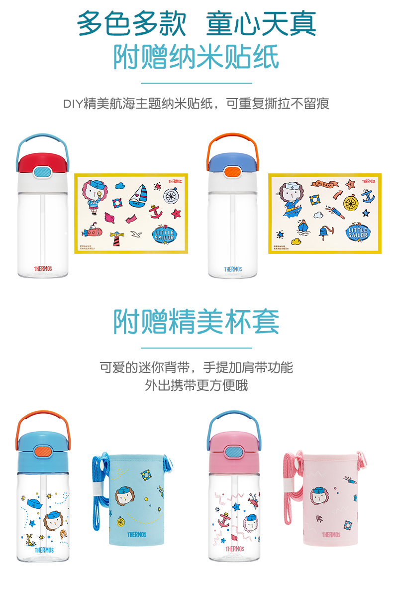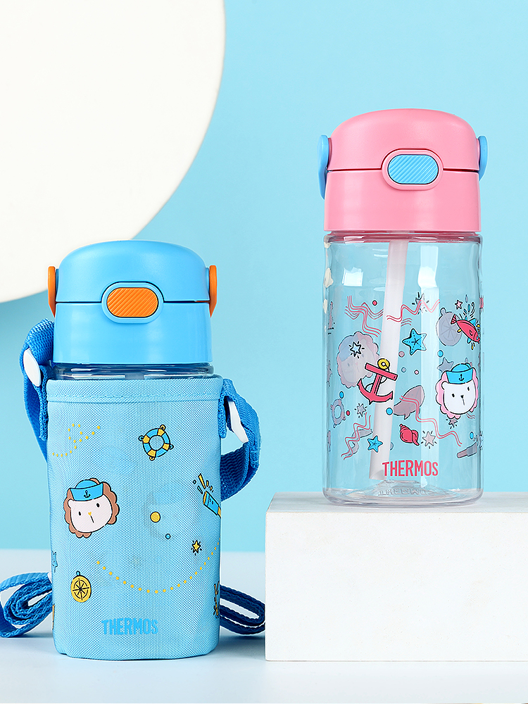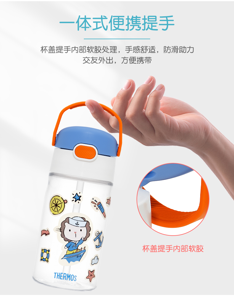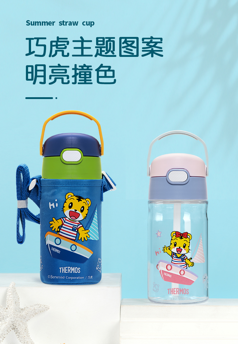 膳魔师/THERMOS航海探险tritan巧虎宝宝儿童吸管杯儿童水杯夏季杯赠贴纸420ml提手背带杯套-SMS-BBSD-400-RB