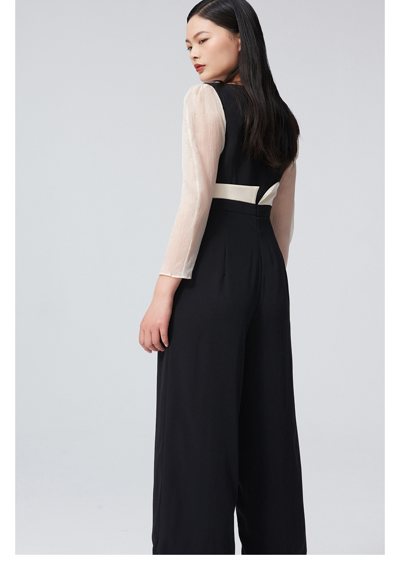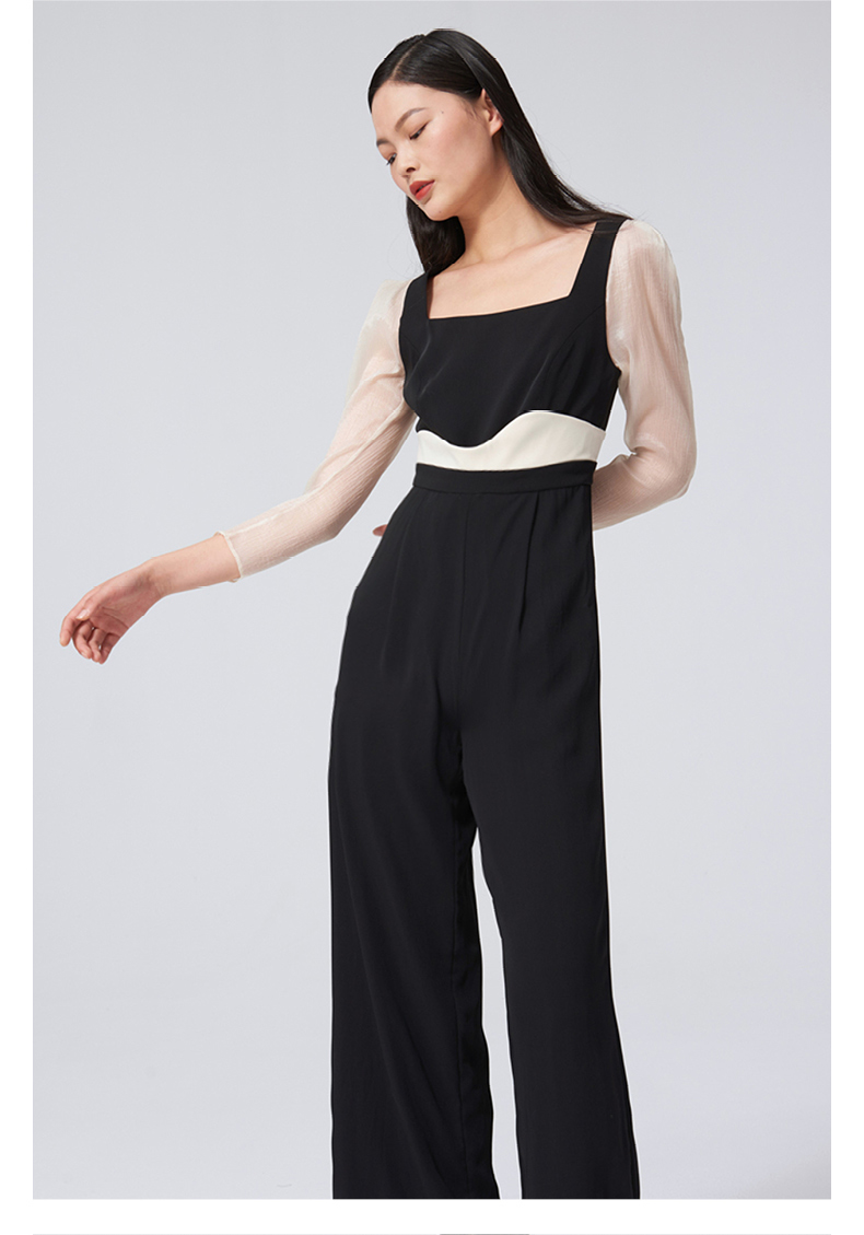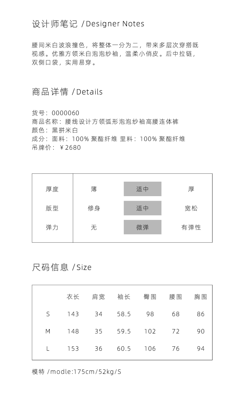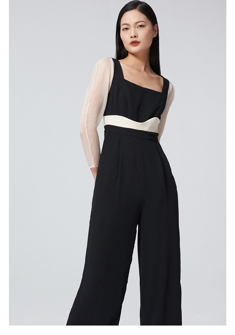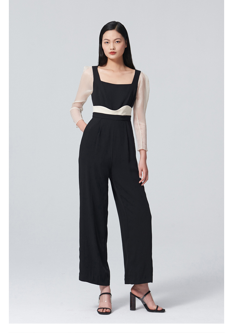 【夏日浪花】腰线设计方领弧形泡泡纱袖黑拼米白高腰连体裤/0000060