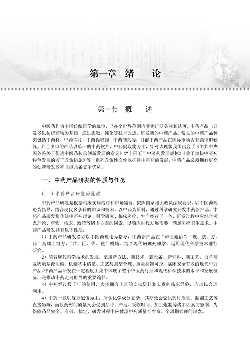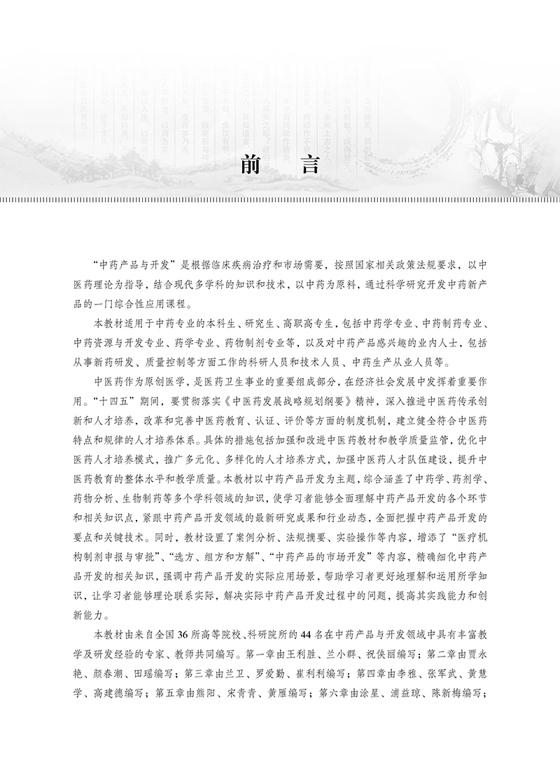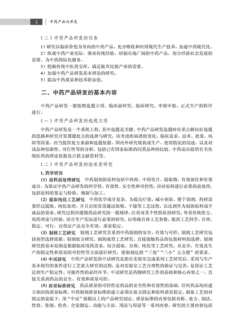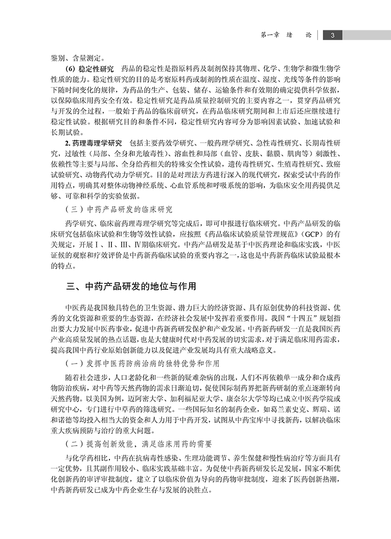 本教材是科学出版社“十四五”普通高等教育本科规划教材之一,内容全面覆盖了中药新药的研发流程,包括申报、立项、制剂工艺、中试、质量标准、稳定性、药理毒理、临床研究以及知识产权保护等关键环节。书中不仅注重理论知识的传授,还强调实践技能的培养,以期学生能够全面掌握中药新药开发的各个环节。教材还涵盖了含中药保健食品、化妆品、医疗器械以及医疗机构中药制剂的研发,包括申报流程、研发流程、工艺研究、质量标准和安全性研究等。学生能够通过对这些内容的系统学习拓展知识视野,深化对中药新产品开发潜力的认识。