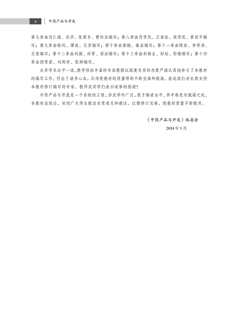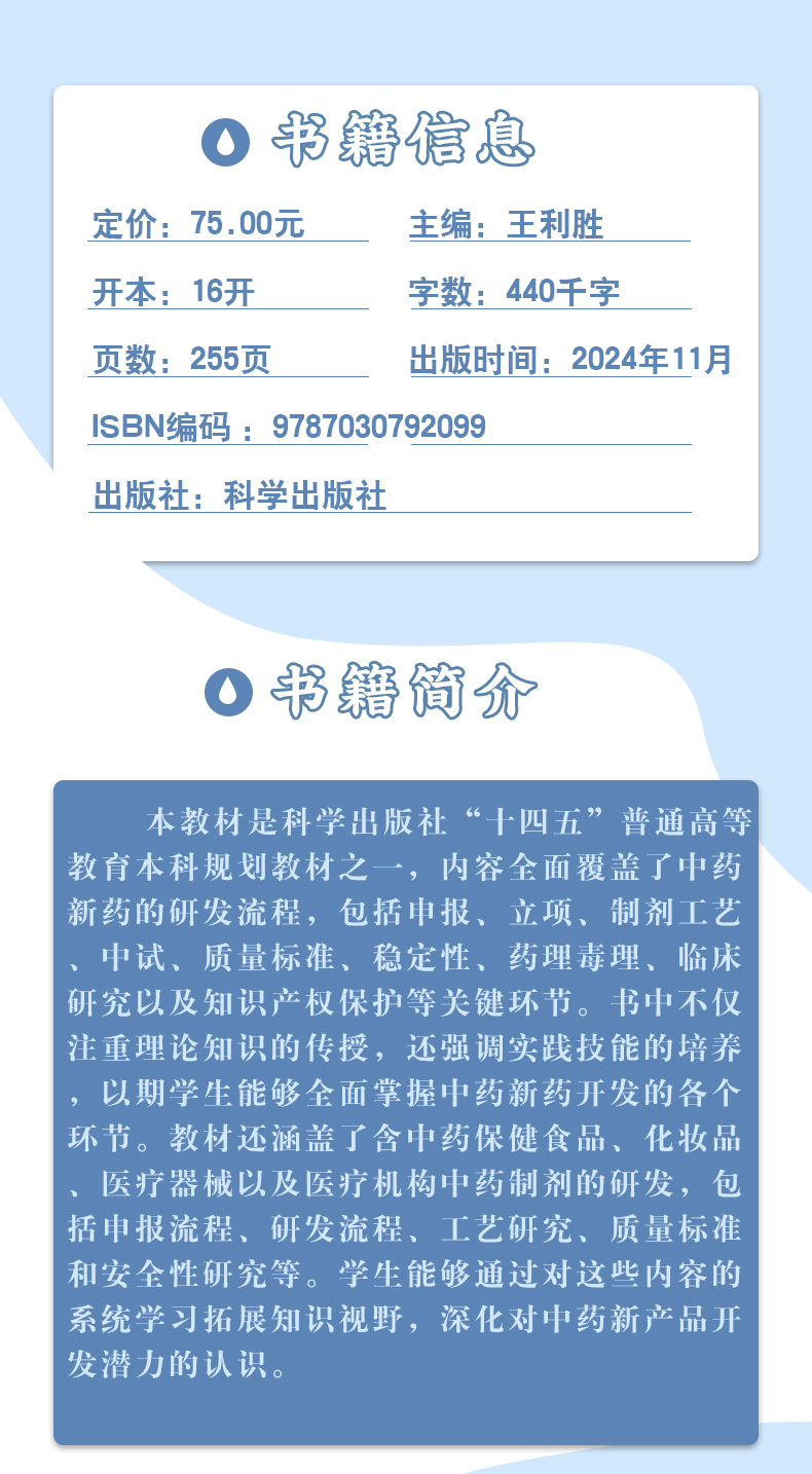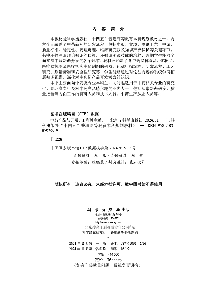 本教材是科学出版社“十四五”普通高等教育本科规划教材之一,内容全面覆盖了中药新药的研发流程,包括申报、立项、制剂工艺、中试、质量标准、稳定性、药理毒理、临床研究以及知识产权保护等关键环节。书中不仅注重理论知识的传授,还强调实践技能的培养,以期学生能够全面掌握中药新药开发的各个环节。教材还涵盖了含中药保健食品、化妆品、医疗器械以及医疗机构中药制剂的研发,包括申报流程、研发流程、工艺研究、质量标准和安全性研究等。学生能够通过对这些内容的系统学习拓展知识视野,深化对中药新产品开发潜力的认识。