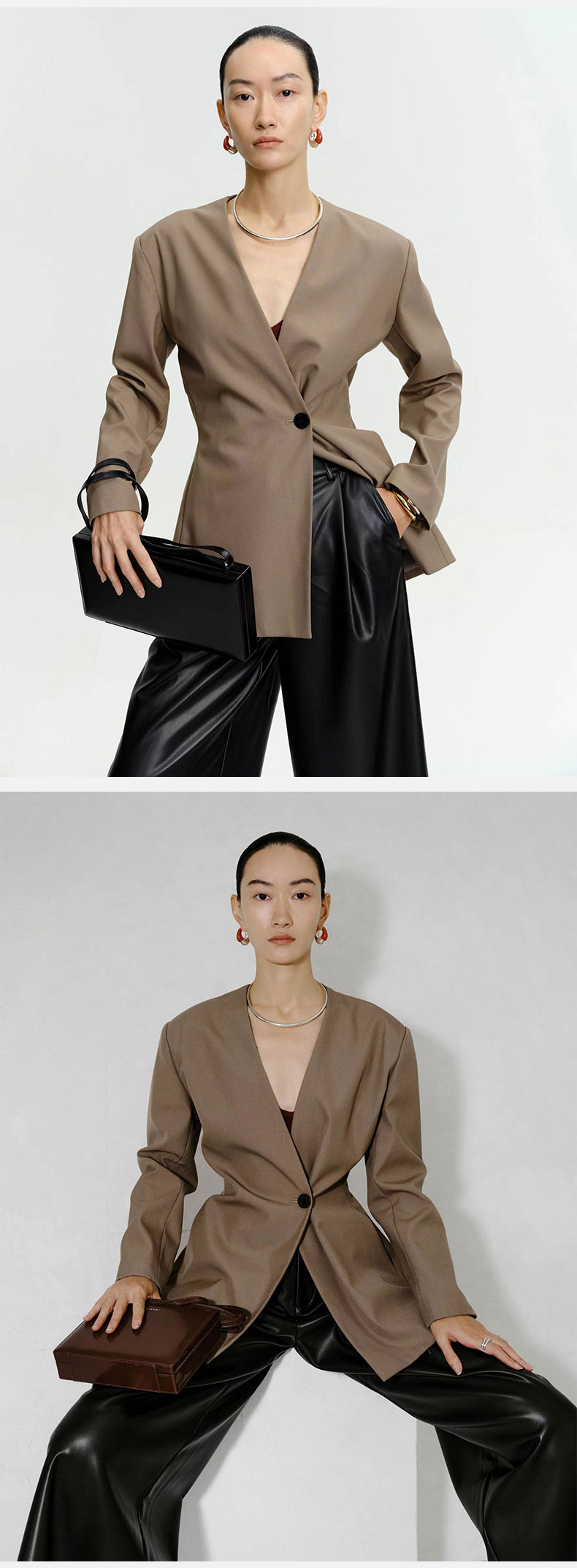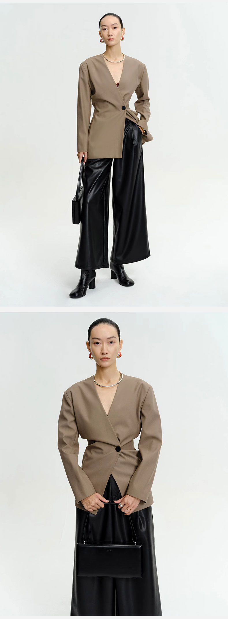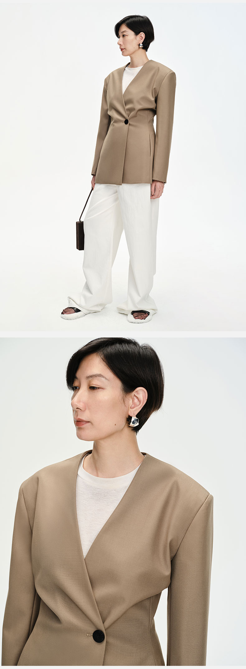 HIDEMI 卡其色V领设计感一粒扣收腰式西装外套
