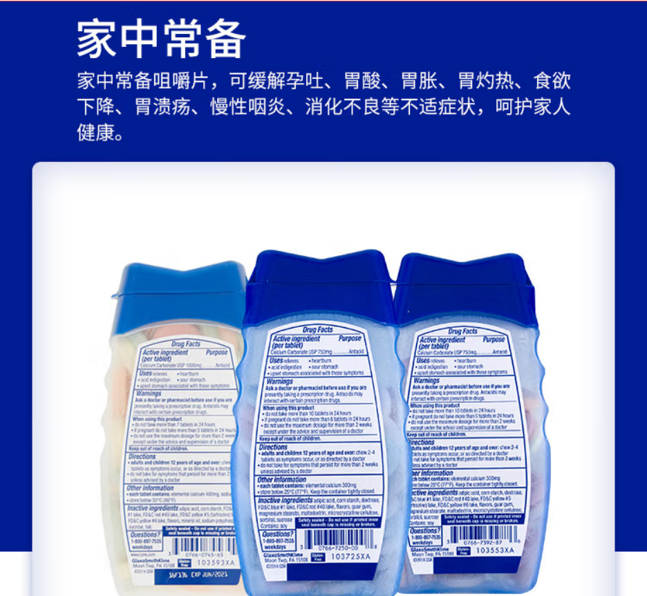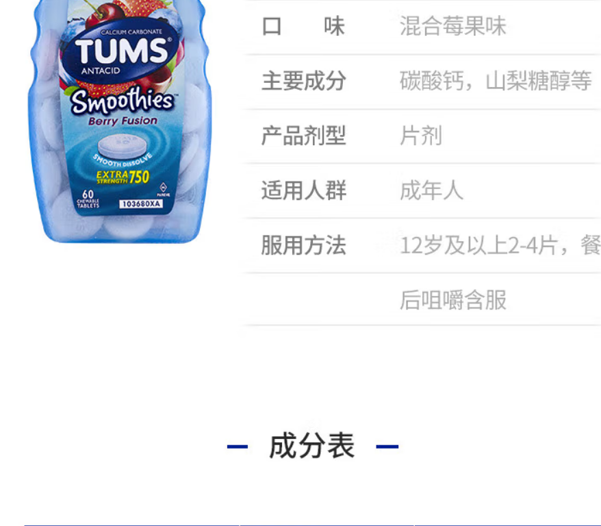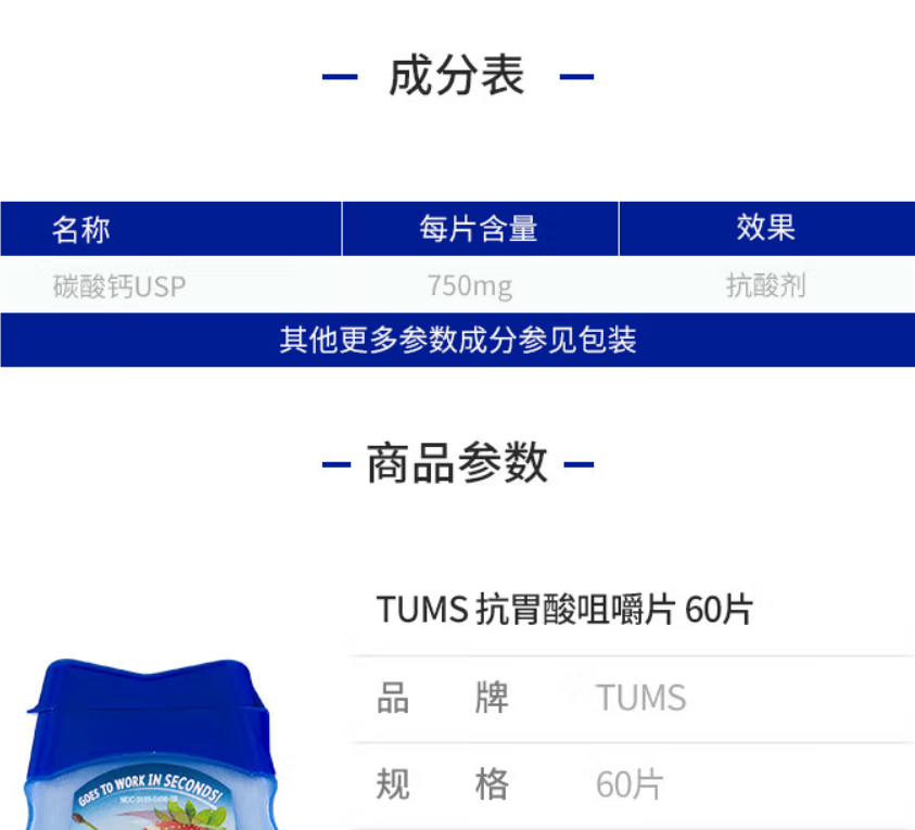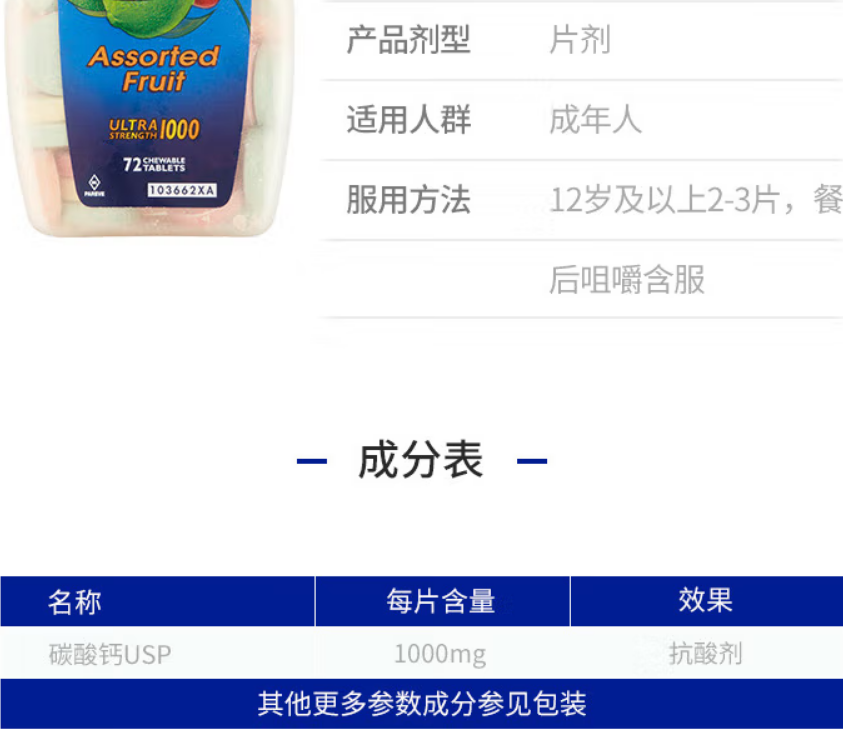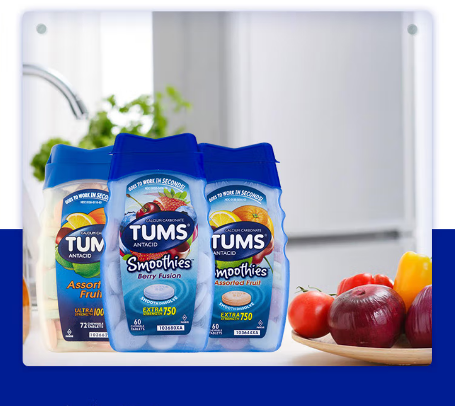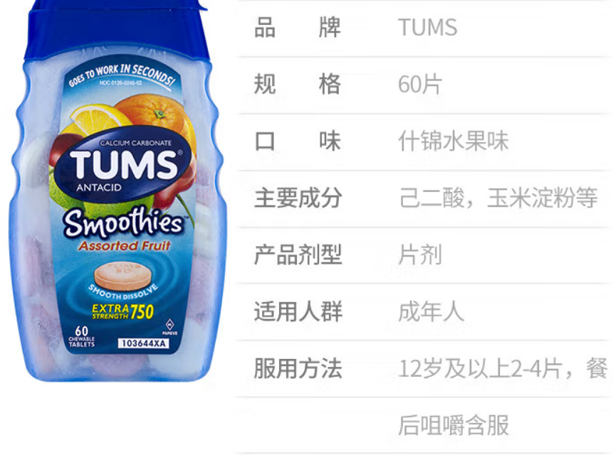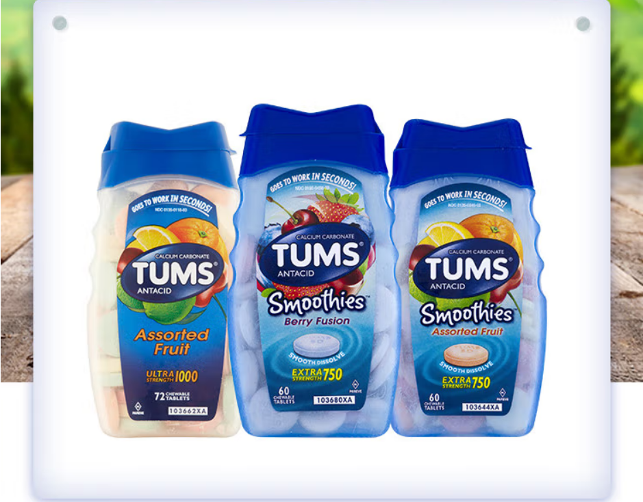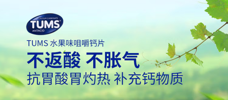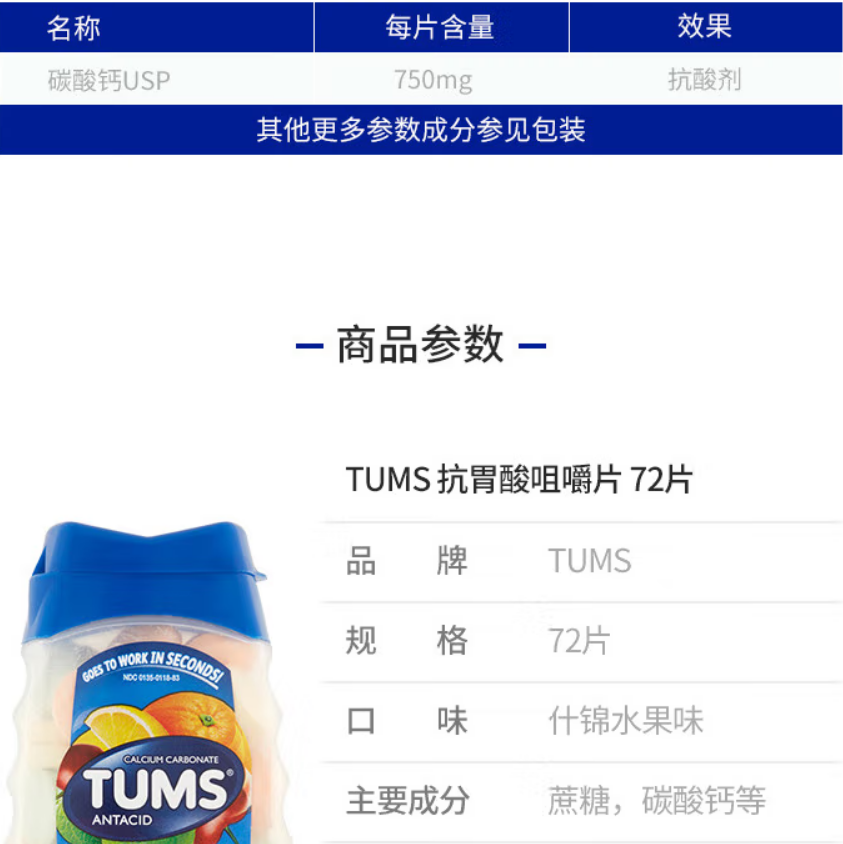加拿大Tums抗胃酸咀嚼片碳酸钙孕妇缓解孕吐反酸烧心成年补钙钙片 72片*2 什锦水果味