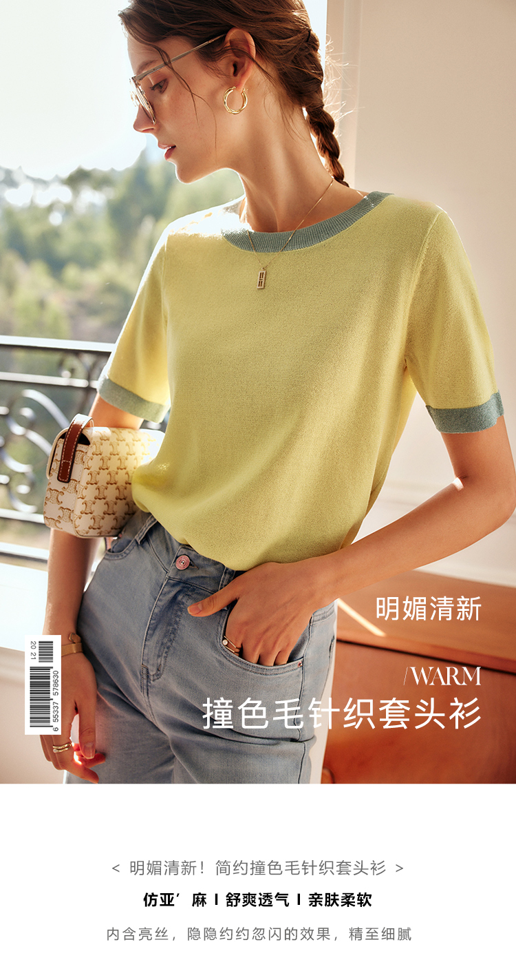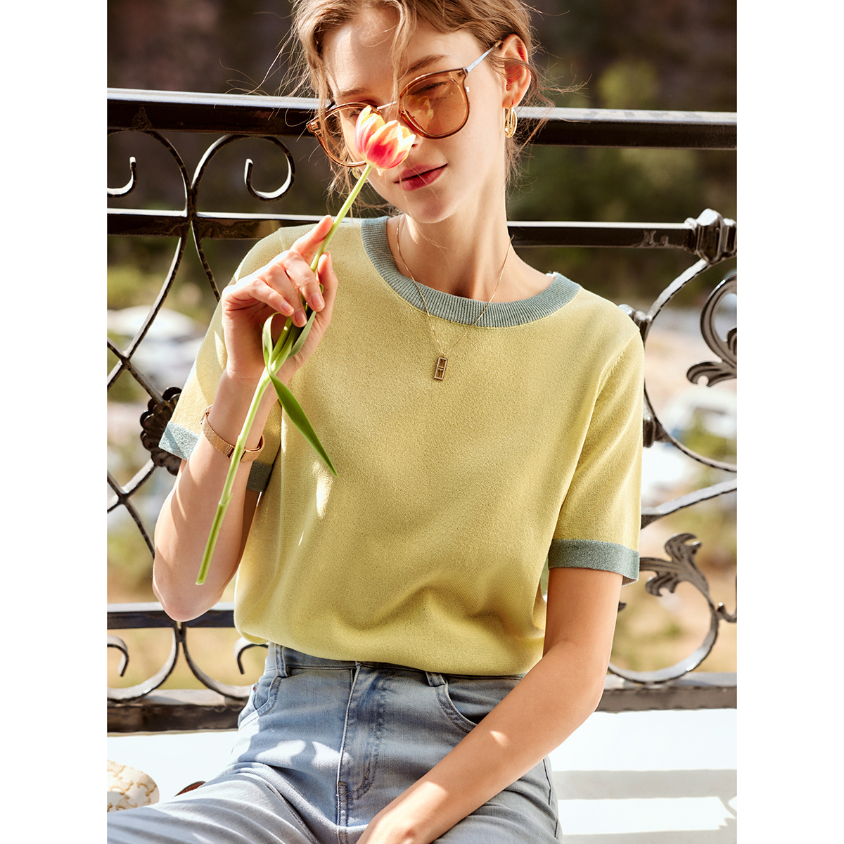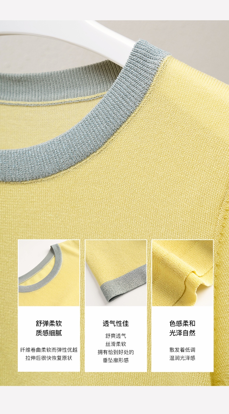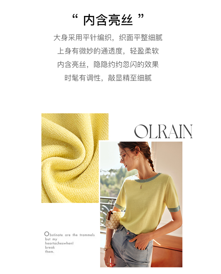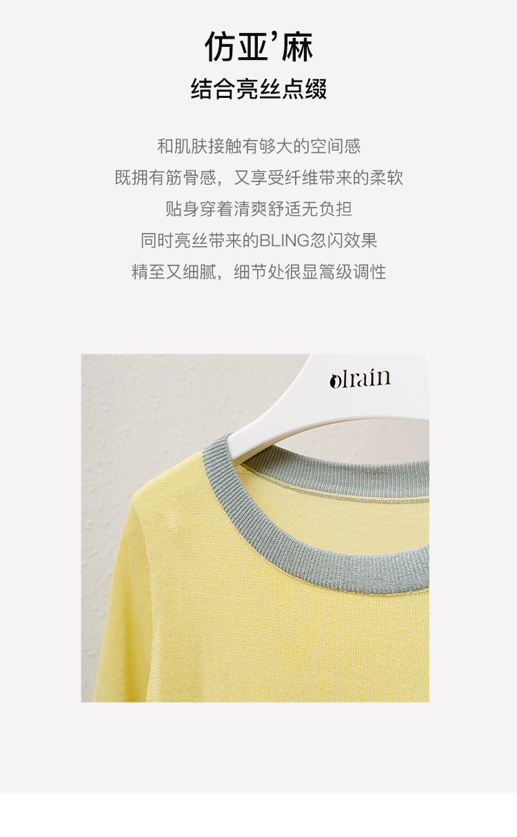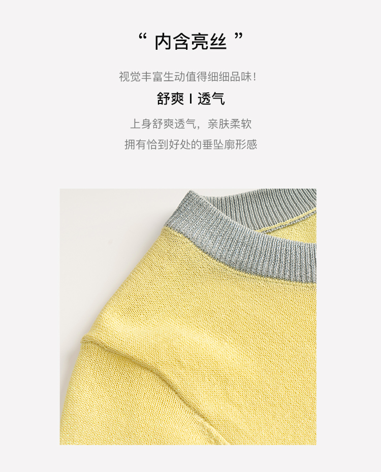 OLrain欧芮儿法式黄色针织衫女夏季宽松撞色亮丝套头衫
