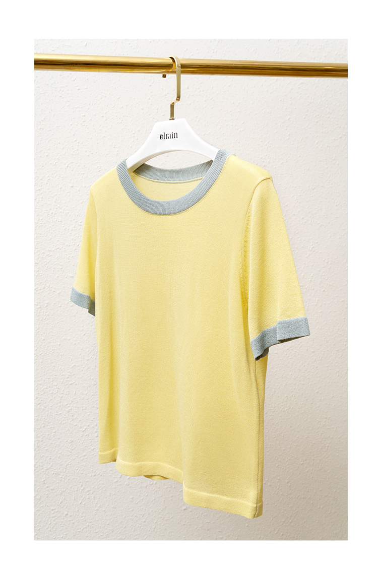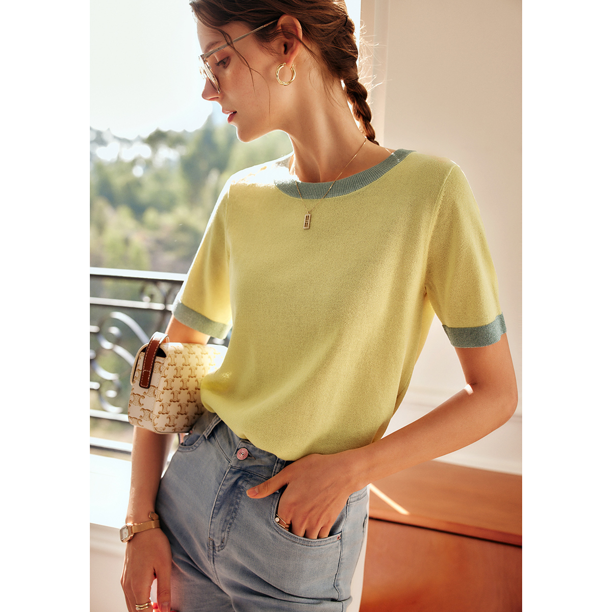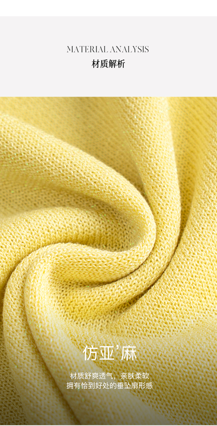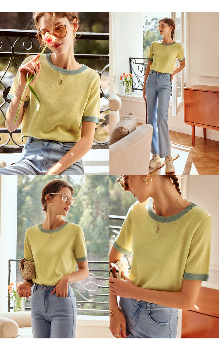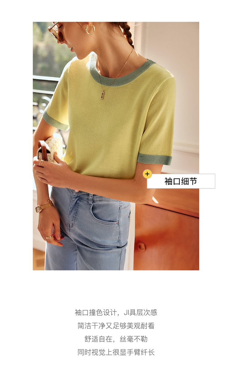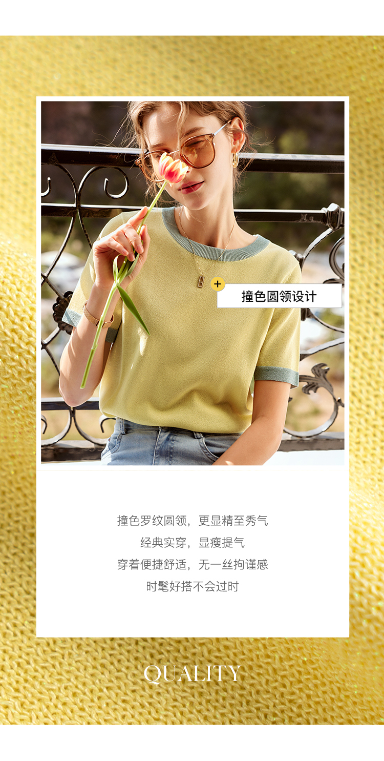 OLrain欧芮儿法式黄色针织衫女夏季宽松撞色亮丝套头衫