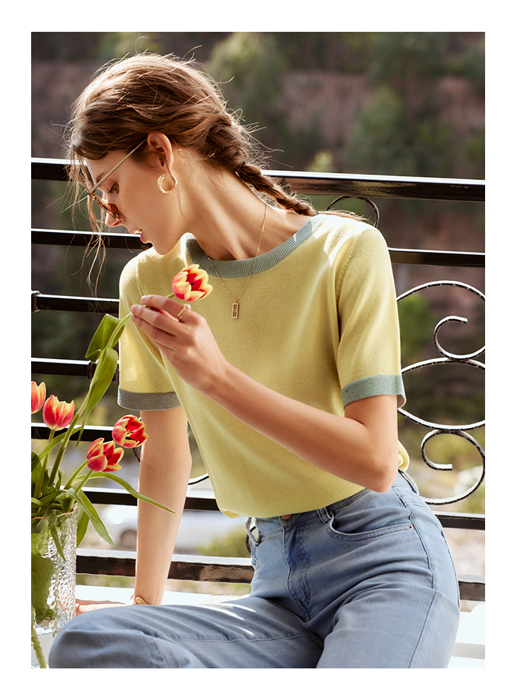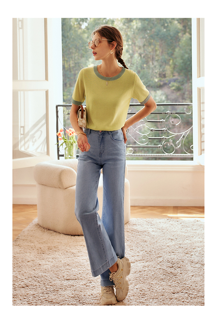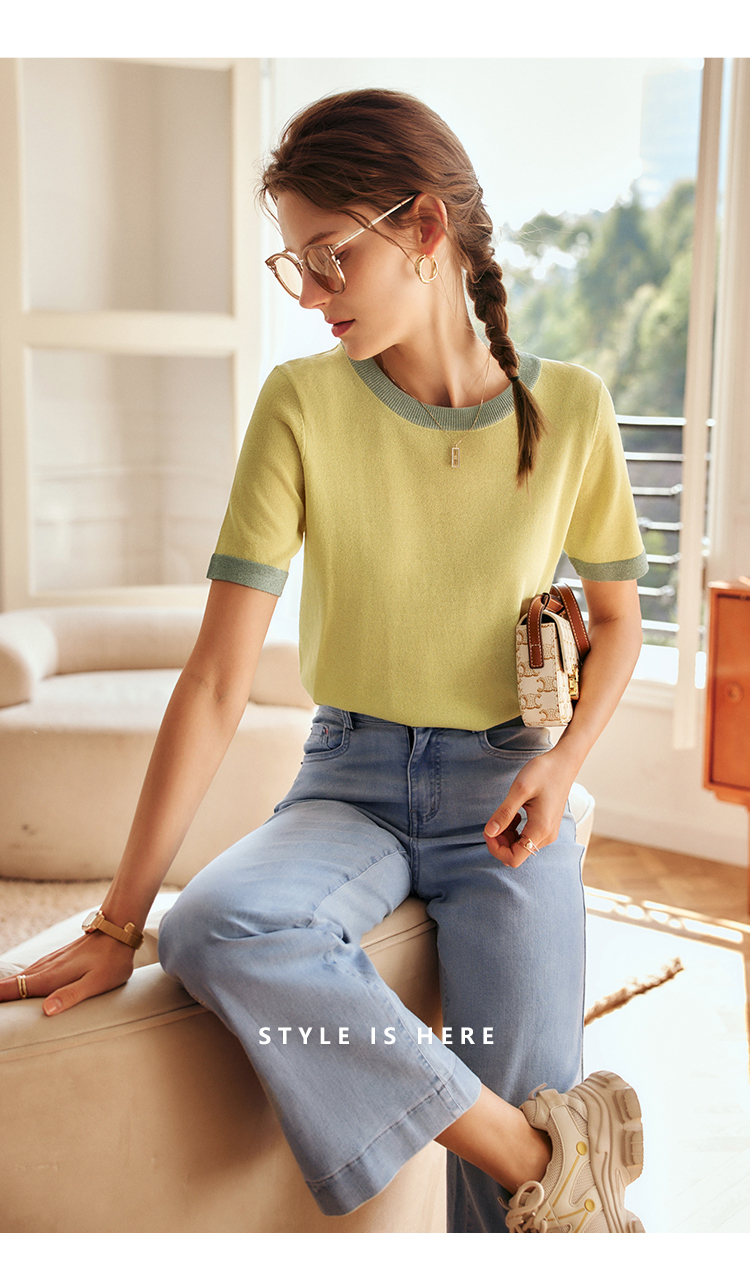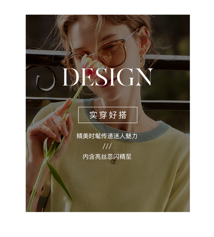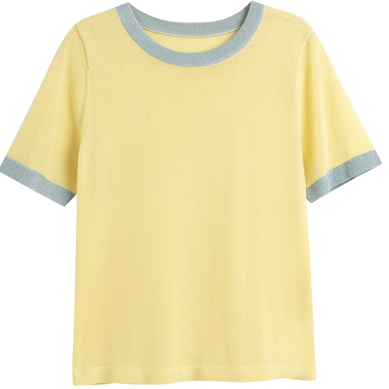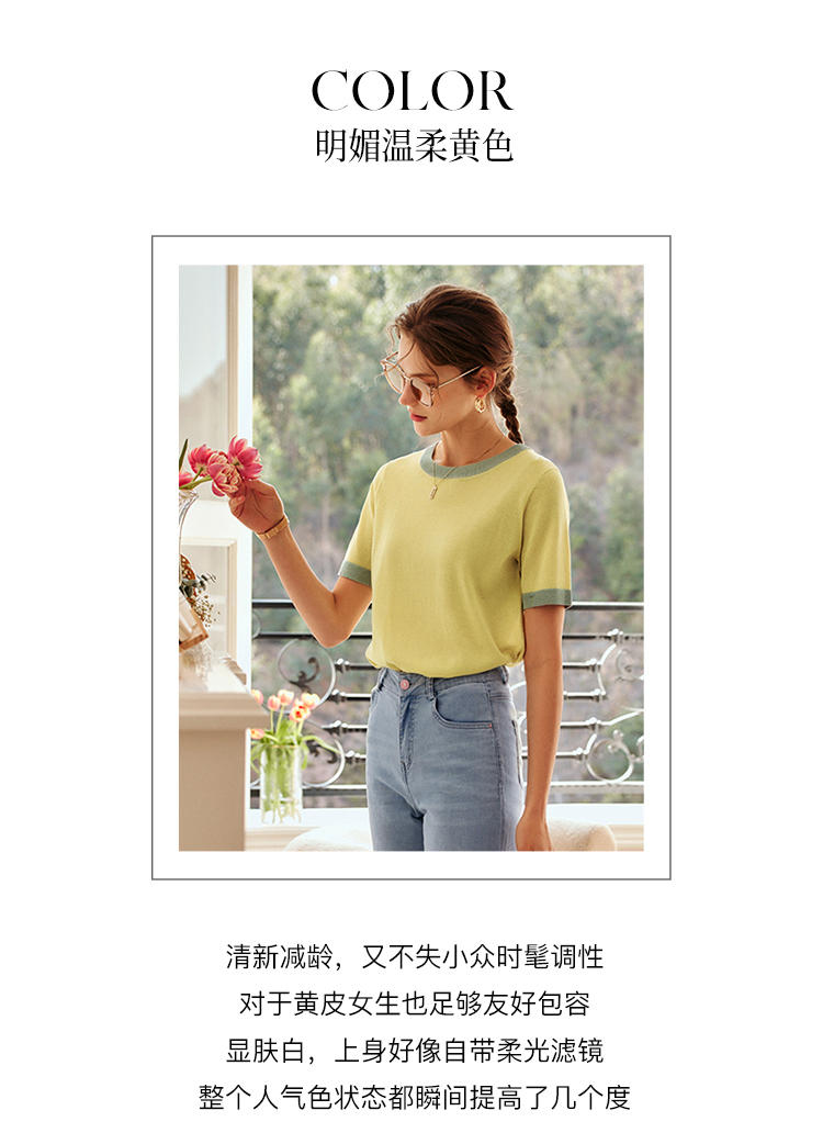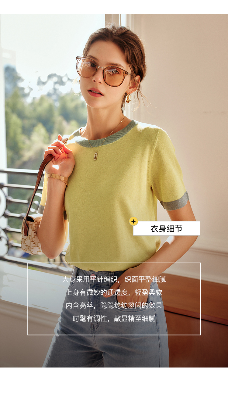 OLrain欧芮儿法式黄色针织衫女夏季宽松撞色亮丝套头衫