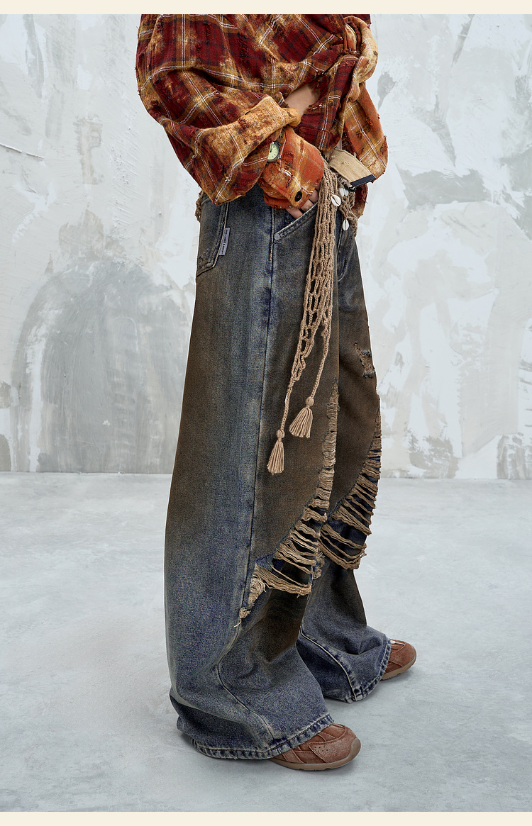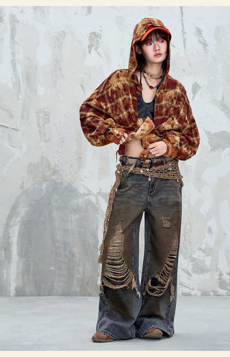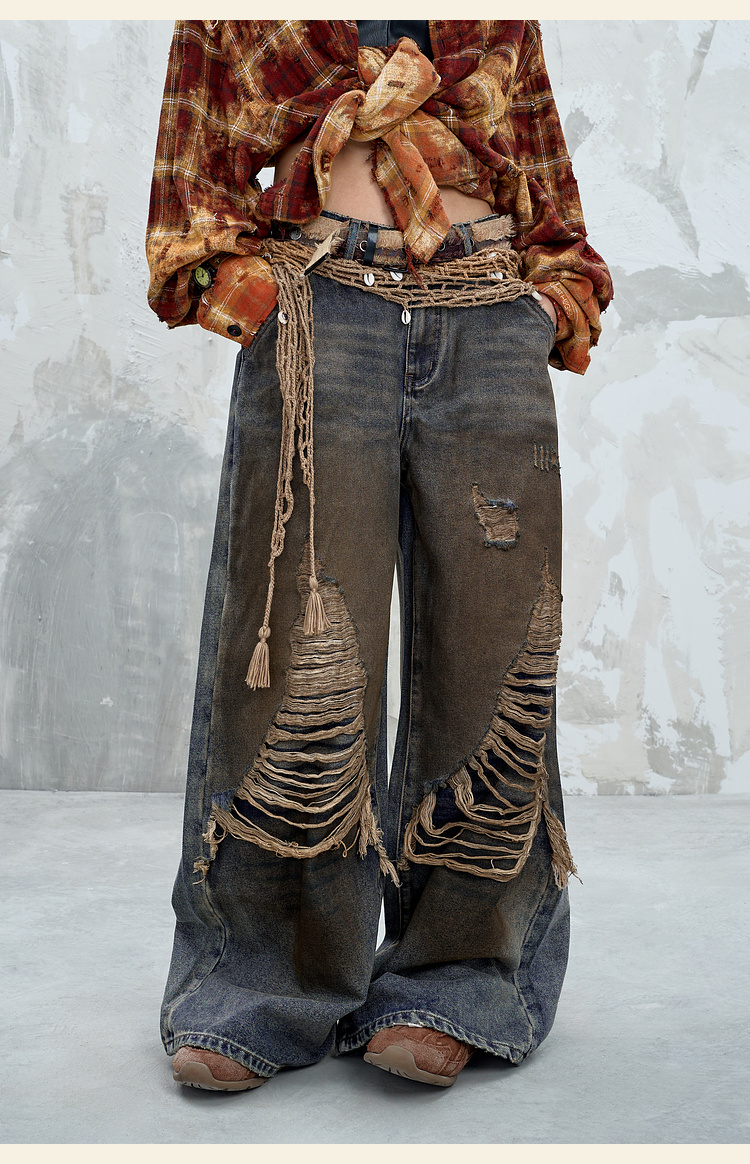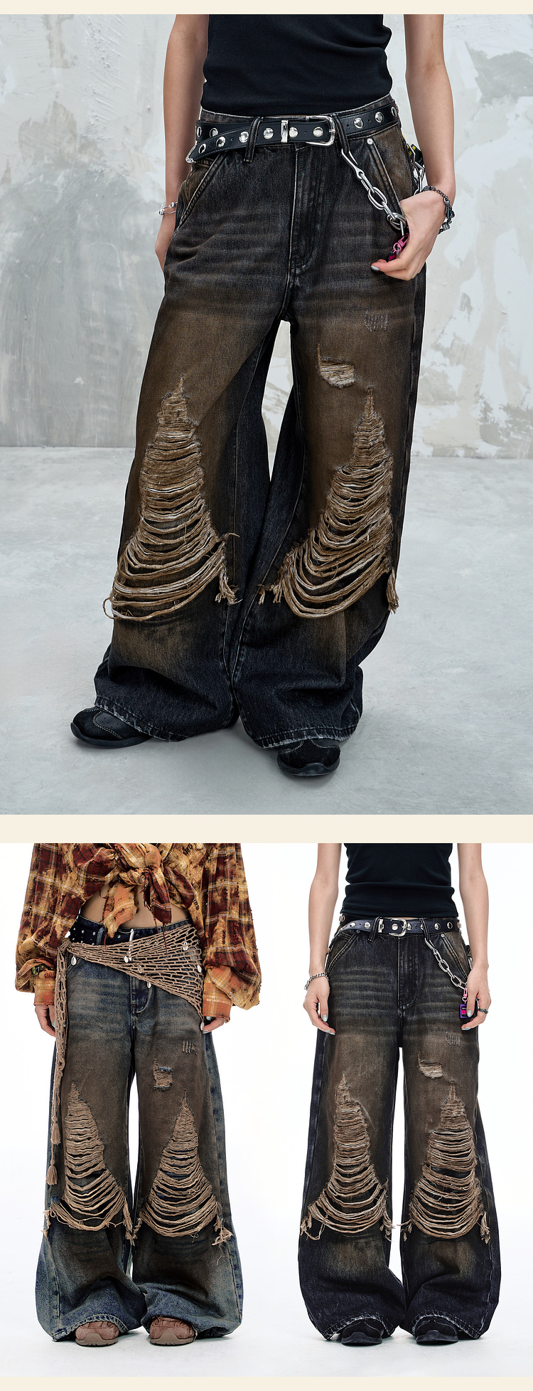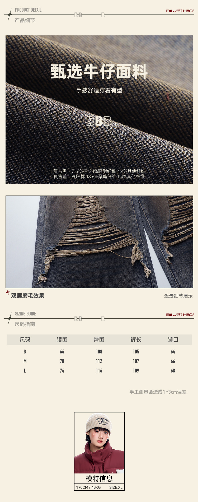BJHG不计后果做旧破洞牛仔裤女秋季宽松美式复古双层设计感休闲裤